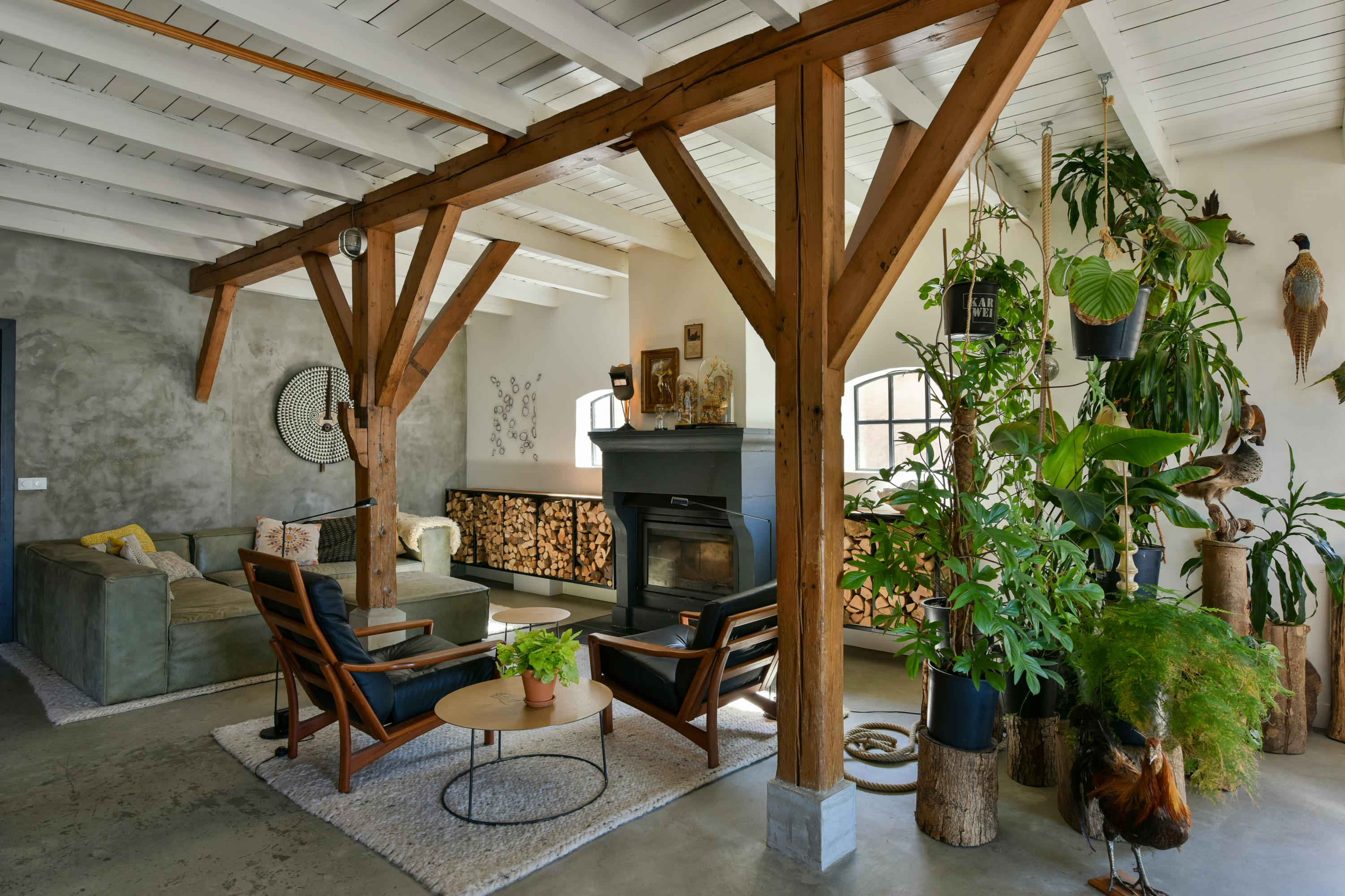 The centerpiece of the living room is the large open fireplace, framed by a custom-made wood storage unit that subtly integrates the television – a bespoke piece by Don Zweedijk of De Mogelijkheidcollectie, blending art and functionality perfectly.