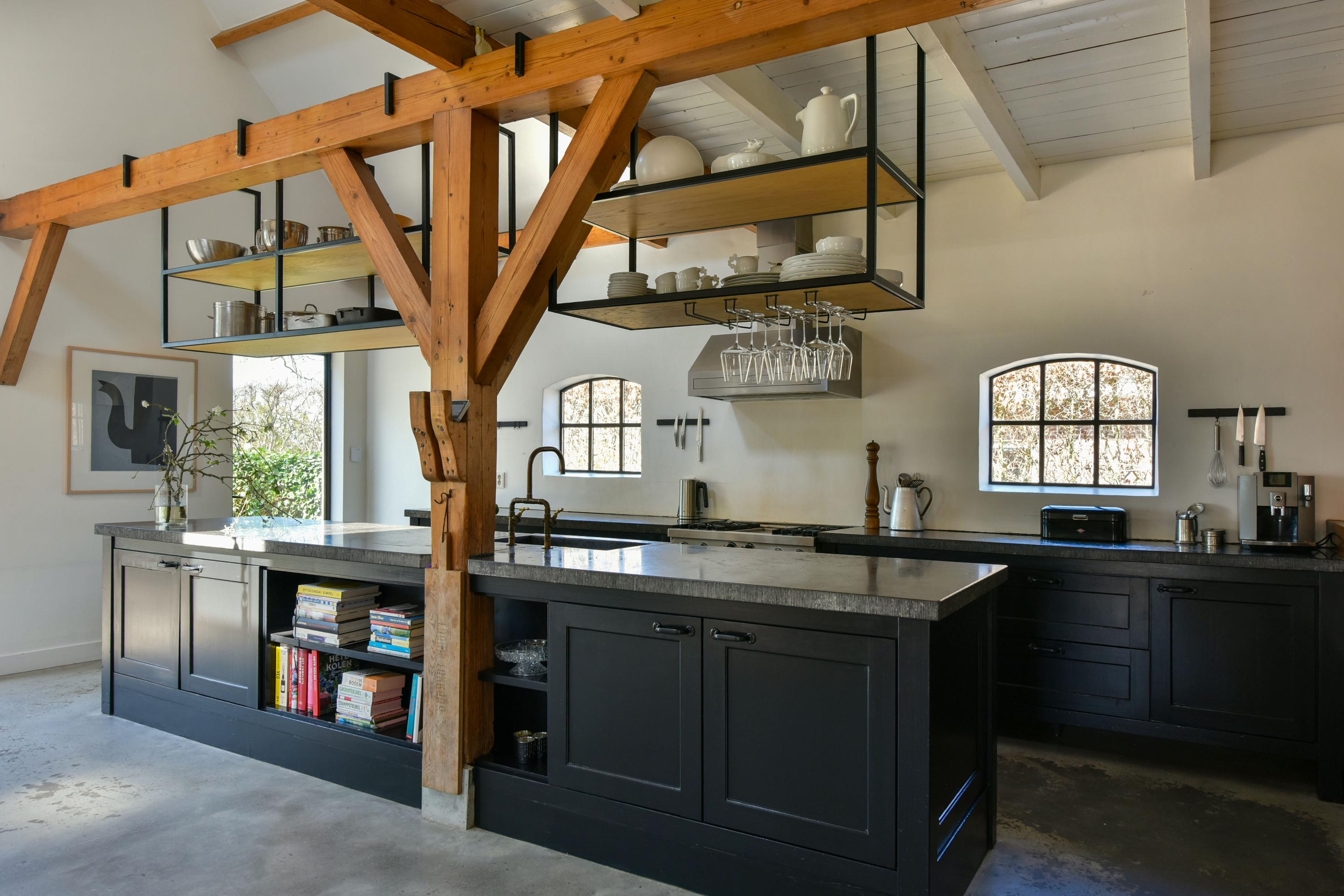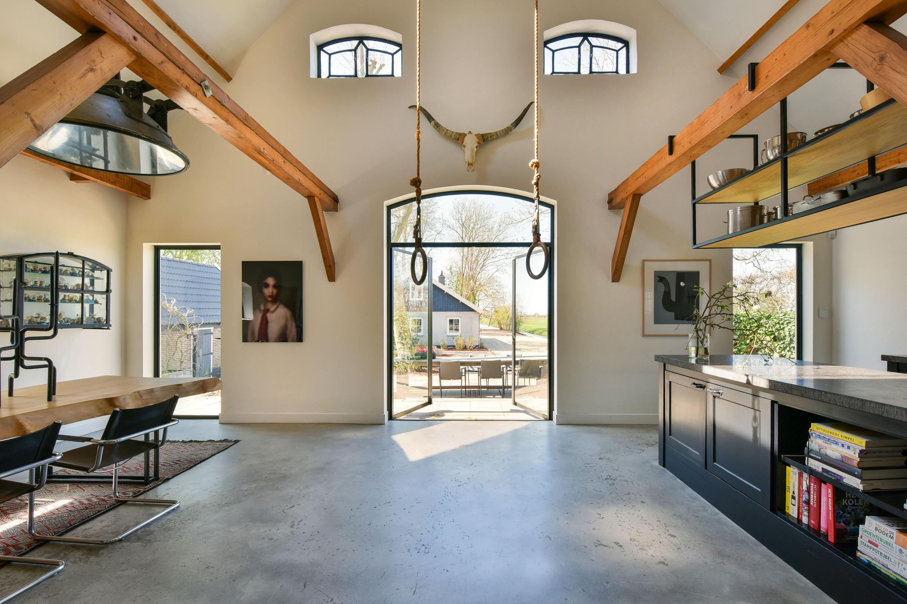 To the right, the former stable has been transformed into an impressive living room and kitchen. Original stable windows and charming wooden shutters to the former hayloft pay homage to the home's agricultural past. The concrete floor has underfloor heating, and sturdy gymnastic rings hang from the ceiling – a playful invitation to let your inner child roam free. Picture yourself swinging through the space with sunlight pouring in through tall windows – whether it’s your children playing or you taking a break from gravity, these unique details add real personality.