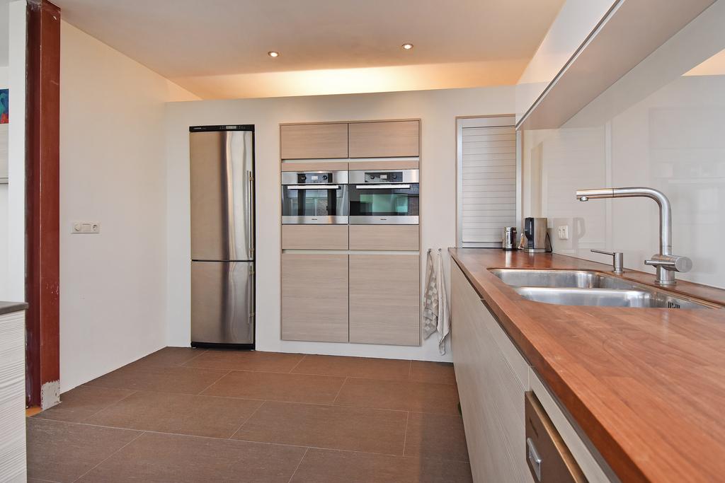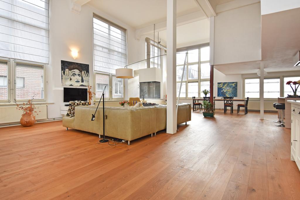 Entree, een brede hal met prachtige zwart/wit betegelde vloer met toilet en binnenberging. Woonkamer van meer dan 100 m2 met een nagenoeg nieuwe open haard (Boley) en een imposante plafondhoogte van ruim 5 meter. Door de vele hoge raampartijen is dit een heerlijke lichte leefruimte. De royale open keuken (Siematic) is recent geplaatst en deze is voorzien van inbouwapparatuur. Ruime slaapkamer met ernaast een moderne badkamer.