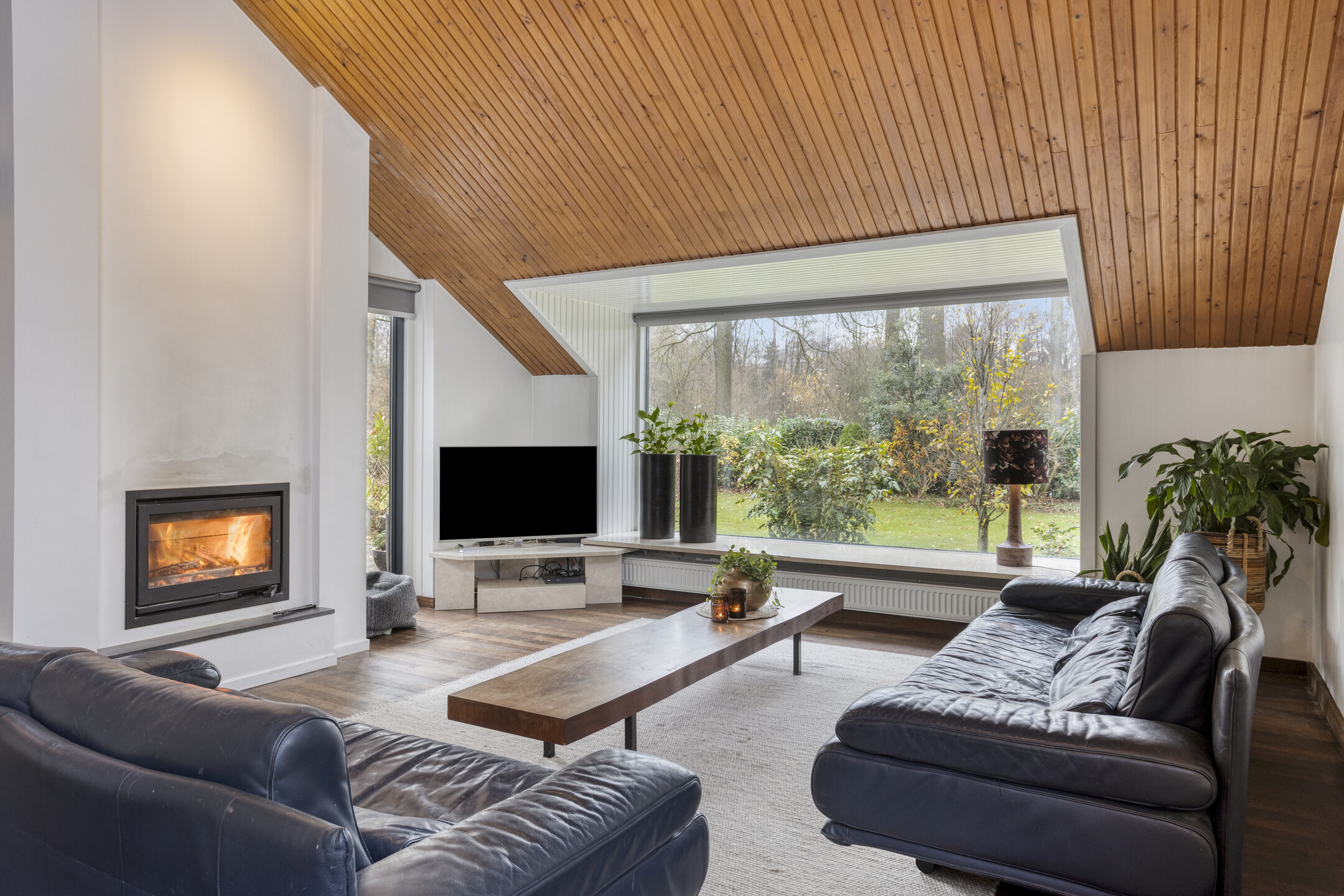 Via de hal kom je in de eetkamer, een lichte en uitnodigende ruimte dankzij de grote schuifpui. De eetkamer is voorzien van een houtkachel. Hier bevindt zich ook de trapopgang naar de eerste verdieping. Vanuit de eetkamer loop je door naar de woonkamer en de keuken. De woonkamer is ook voorzien van een sfeervolle houtkachel. De dichte keuken heeft een speels effect dank zij de bar aan het keukenblad. De keuken is uitgerust met diverse inbouwapparatuur, waaronder een 4-pits inductiekookplaat met afzuigkap, oven, koelkast, vaatwasser, stoomoven, warmhoudlade en een keukenboiler.