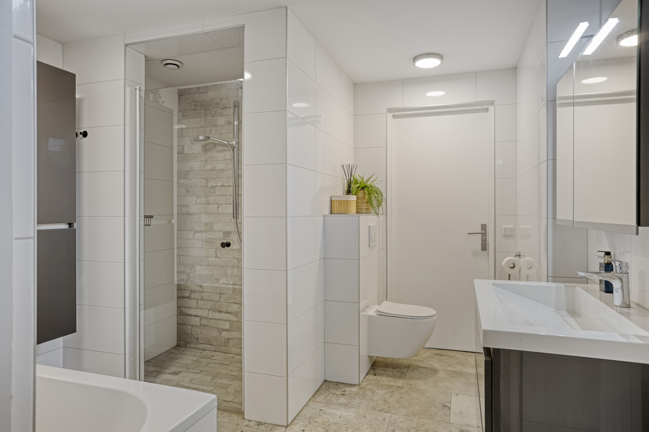 Begane grond: overdekte entree met toegang tot het toilet, de hal en de badkamer. Vanuit de hal bereik je de wasruimte, de berging en de eerste kamer. Deze kamer wordt momenteel gebruikt als salon en is ideaal dankzij de eigen ingang. Vanuit de hal naar de salon zit nog een extra met de toegang naar de kelder.