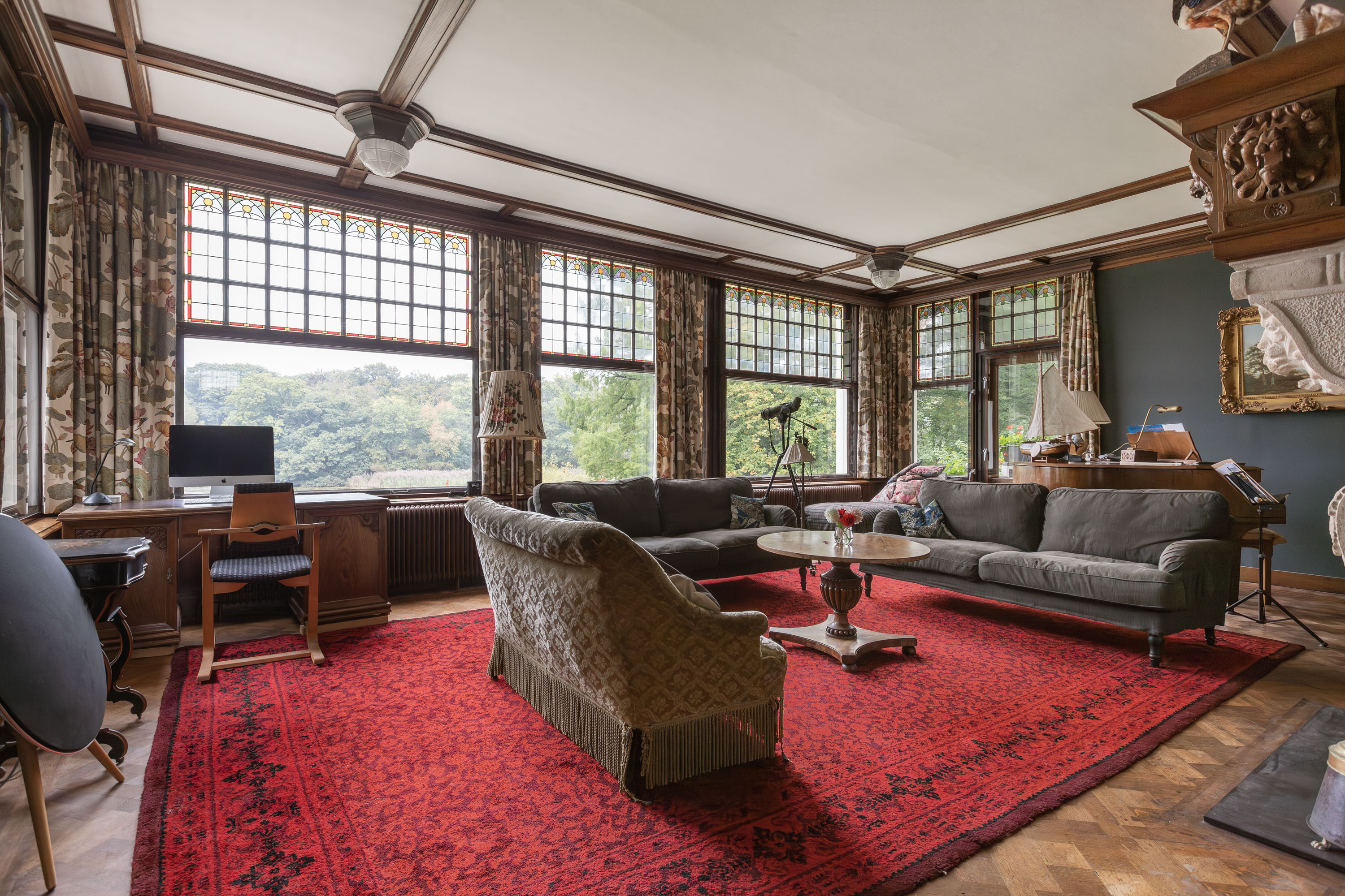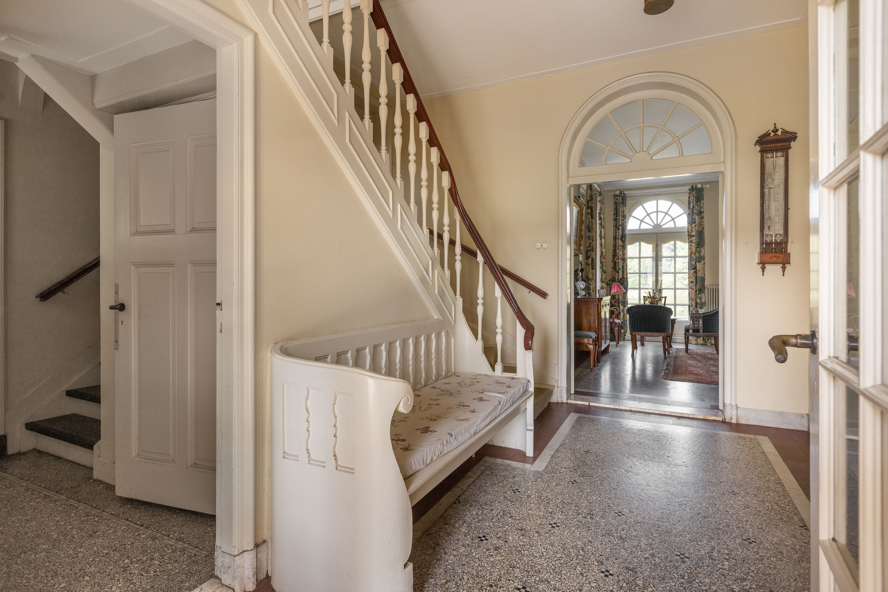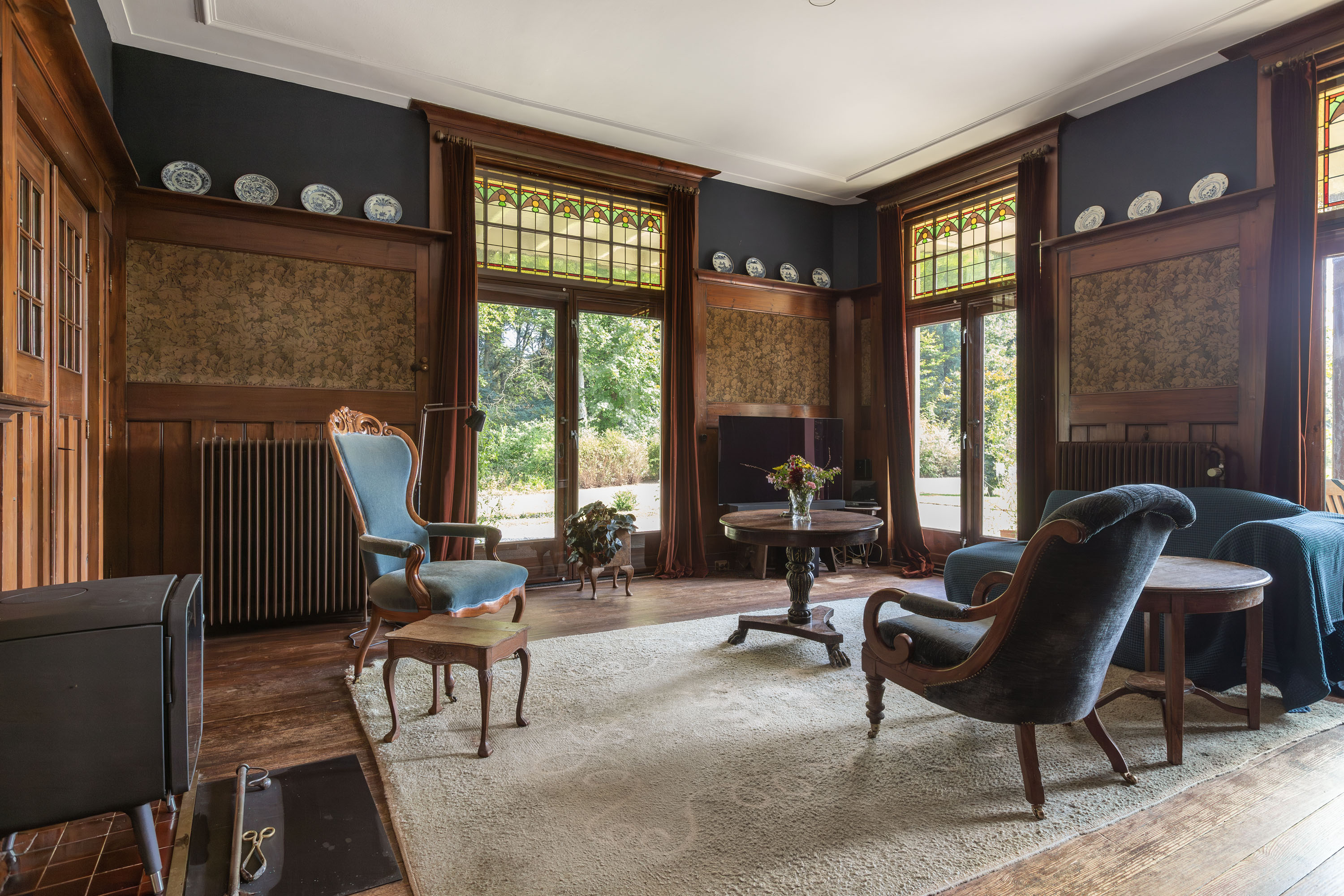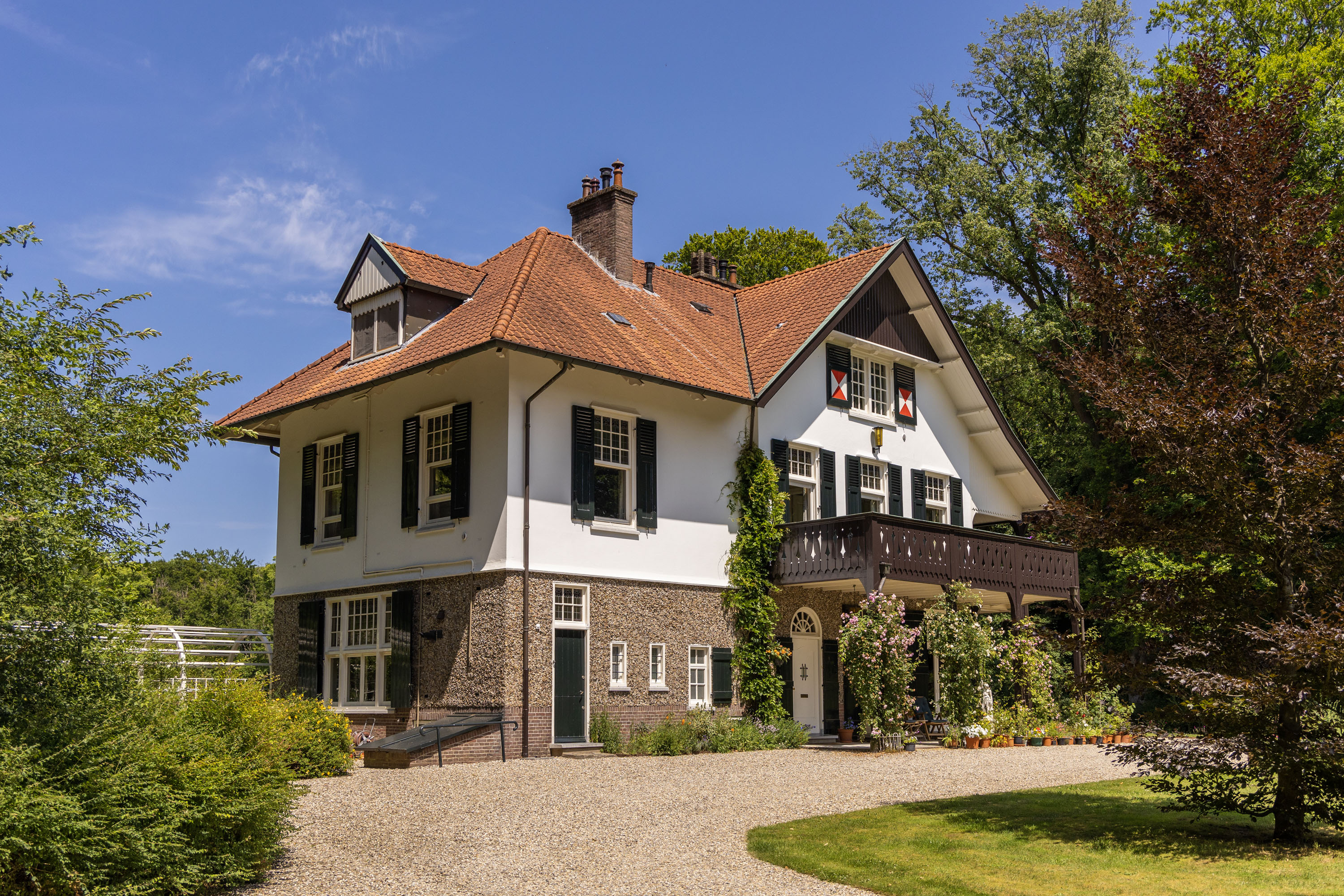 This villa, built in 1901 and designed by architect Karel J. Muller in chalet style, is a national monument. Architect Muller is known for projects such as the Rijksmuseum in Enschede, Tuindorp 't Lansink in Hengelo and several prestigious country houses in Twente. The villa was originally commissioned by Otto Stork, a member of a well-known industrial family. After nearly a century of family ownership the Overijssels Landschap Foundation purchased the Lonnekermeer estate in the early 2000’s including this villa, which was later sold to the current residents with the land leased on a hereditary basis. At the time the house was in a poor state of repair and was subsequently restored to its former glory, preserving its original character and many authentic details. Features such as the terrazzo floors and the original parquet flooring remain intact. The numerous built-in cabinets and service cabinets in the kitchen and pantry are still present. The three fireplaces, two bathrooms and five toilets, most of them with unique facilitary facilities, are also still part of the property. Some original light fixtures have been preserved, as well as the apple drying cabinets in the basement. The many windows provide a very pleasant natural light and offer phenomenal views on all sides. Nearly all transom windows contain stained glass. Despite its age and the focus on preserving details, the villa offers modern comfort. The entire villa has secondary glazing, cavity walls and an insulated roof. In 2023 a pellet stove system, a wood stove and a heat pump boiler were installed. Thanks to careful and systematic annual maintenance supervised by the Monumentenwacht, the house is currently in excellent condition. A structural report is available.