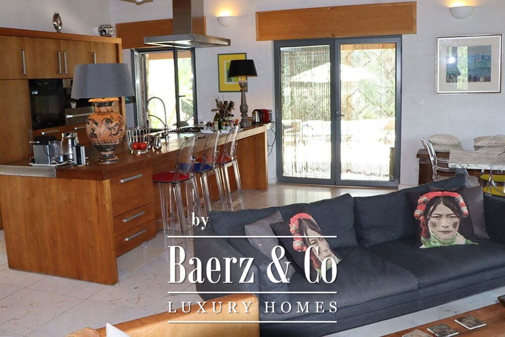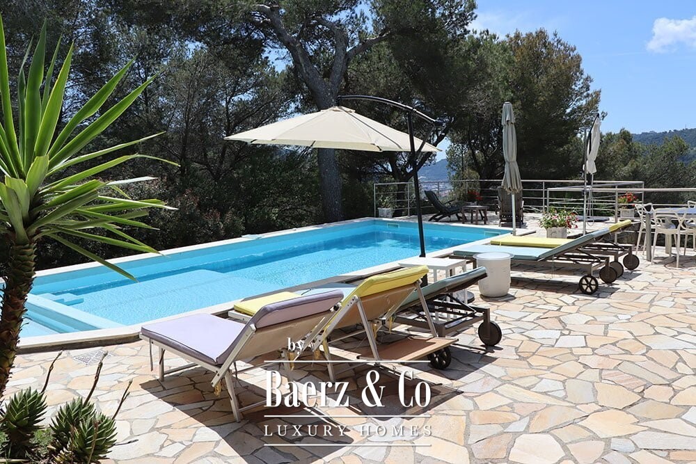 The 11 by 4 metre swimming pool, fully renovated in 2022, lies next to an expansive terrace, offering views over the valley and out to the sea. Multiple terraces, outdoor kitchens, and shaded pergolas invite relaxed dining through all seasons. Paths around the house are lined with olive groves, with hours of sun ensuring exceptional harvests.