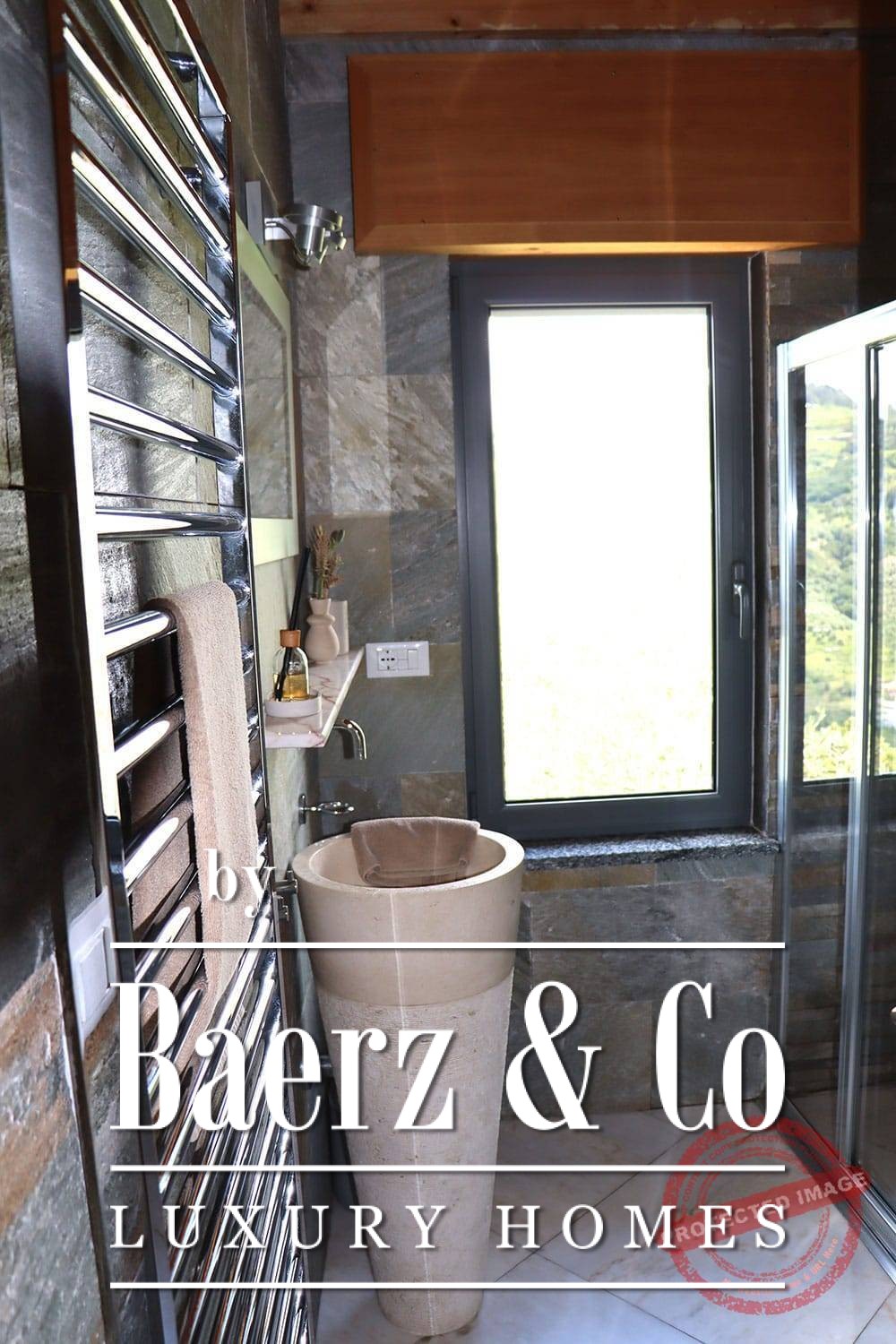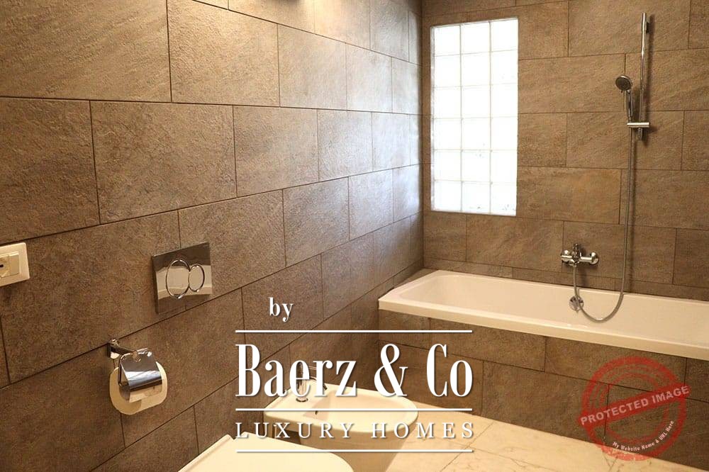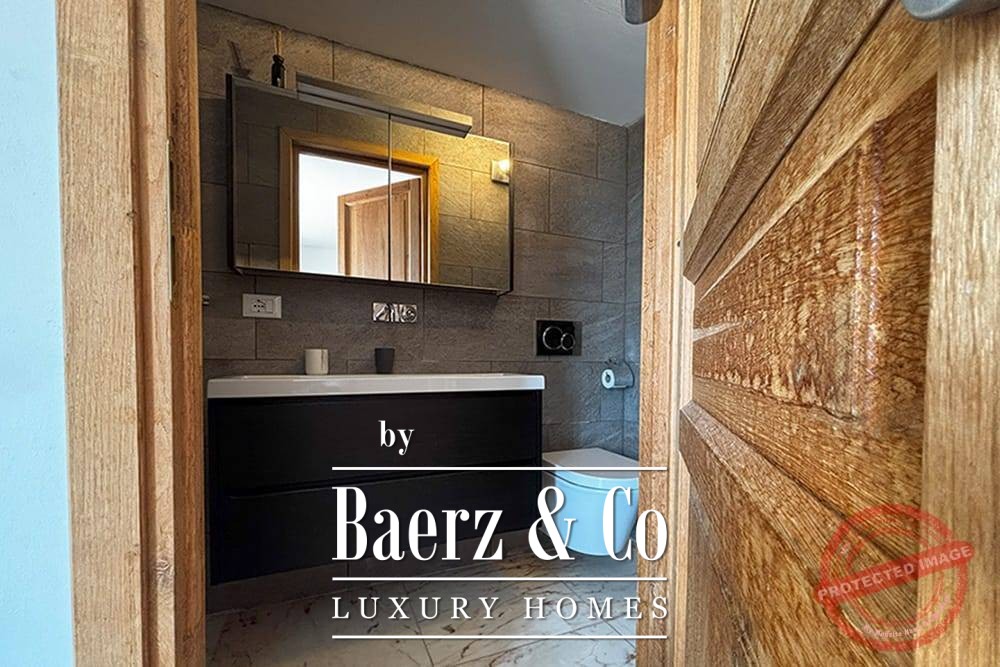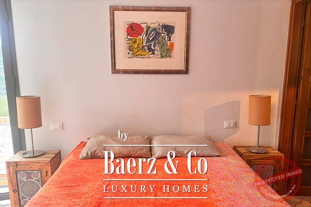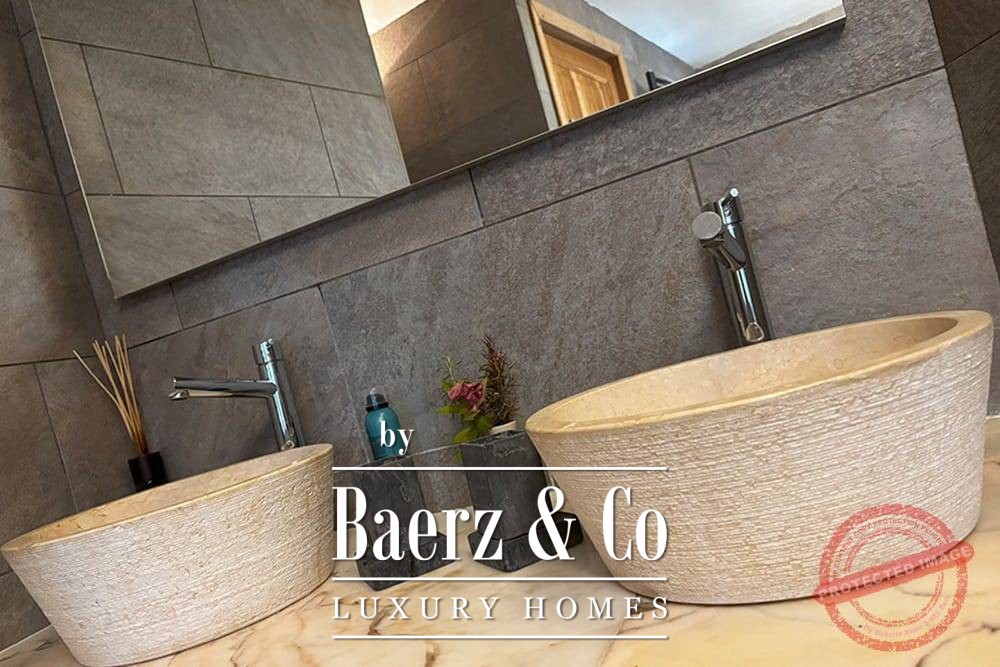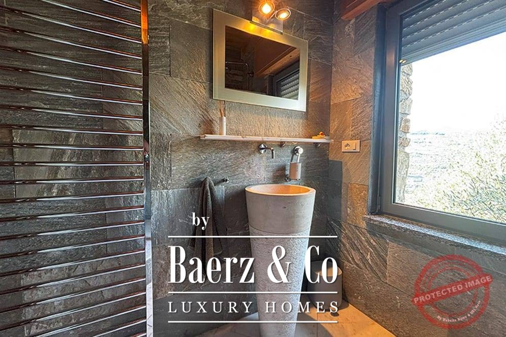 All bedrooms have French doors opening onto the lower terrace with stunning views of the vast mountain landscape. The master bedroom has a large bathroom with bath, a separate shower, two marble basins, toilet and bidet. The second bedroom has a bathroom with two designer sinks, wc, and shower. The third bedroom (the studio), with its own entrance via the lower terrace, has a bathroom with designer washbasin, shower and wc. All bedrooms have a fixed wardrobe. There is a large built-in linen cupboard in the downstairs corridor.