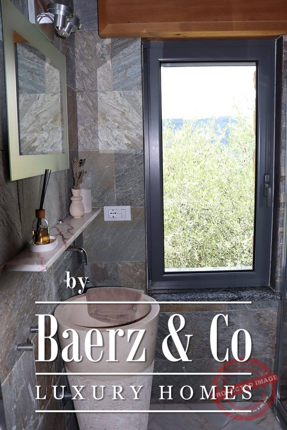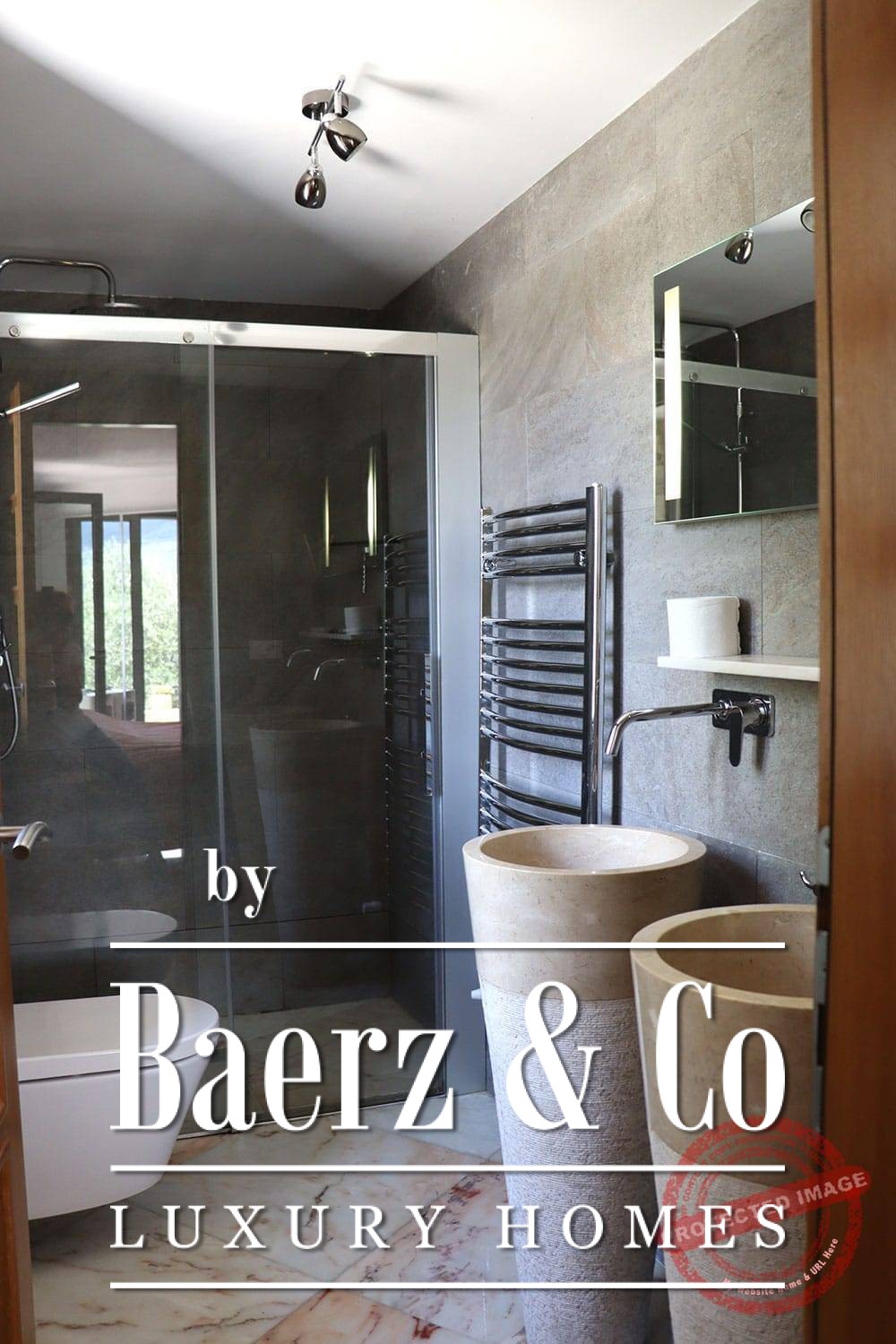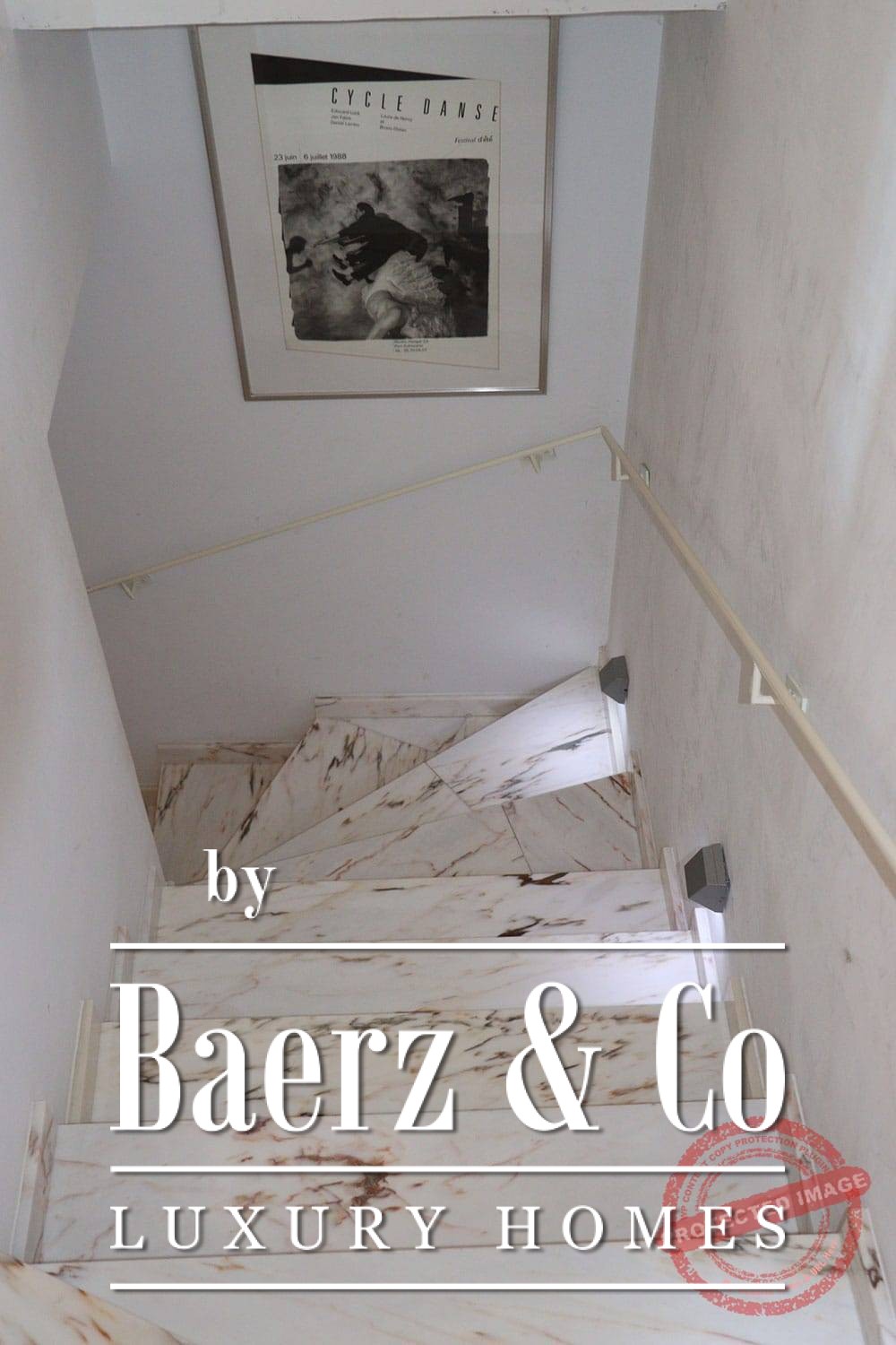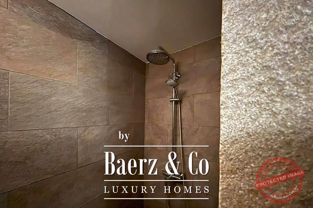 All bedrooms have French doors opening onto the lower terrace with stunning views of the vast mountain landscape. The master bedroom has a large bathroom with bath, a separate shower, two marble basins, toilet and bidet. The second bedroom has a bathroom with two designer sinks, wc, and shower. The third bedroom (the studio), with its own entrance via the lower terrace, has a bathroom with designer washbasin, shower and wc. All bedrooms have a fixed wardrobe. There is a large built-in linen cupboard in the downstairs corridor.