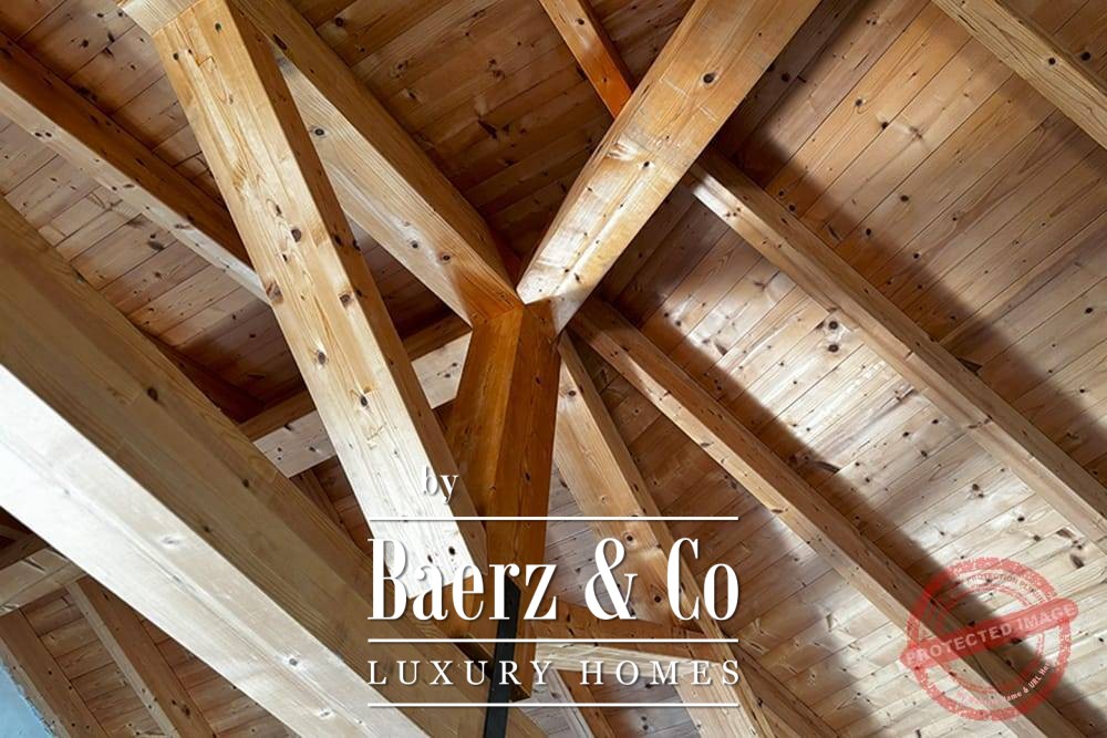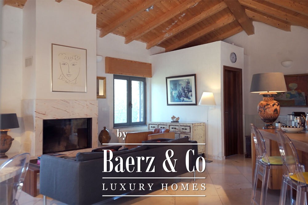 • On the upper floor, also the entrance to the villa, is a large cosy living room with fireplace and a beautiful beamed ceiling, an open-plan kitchen and an office or television room with French doors opening onto the terrace.
