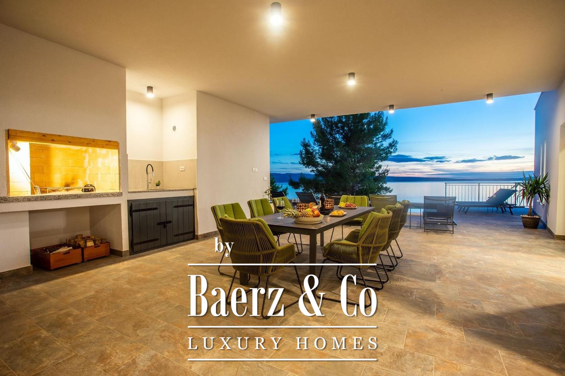 rooms. Every room enjoys a spectacular panoramic view of the sea and nearby islands, making this property truly exceptional.The exterior space is designed for relaxation and entertainment: a large 32 m² swimming pool with a 40 m² sunbathing area, a covered terrace, sauna, summer kitchen with fireplace, outdoor shower, storage room, and a beautifully landscaped garden with an automatic irrigation system.
