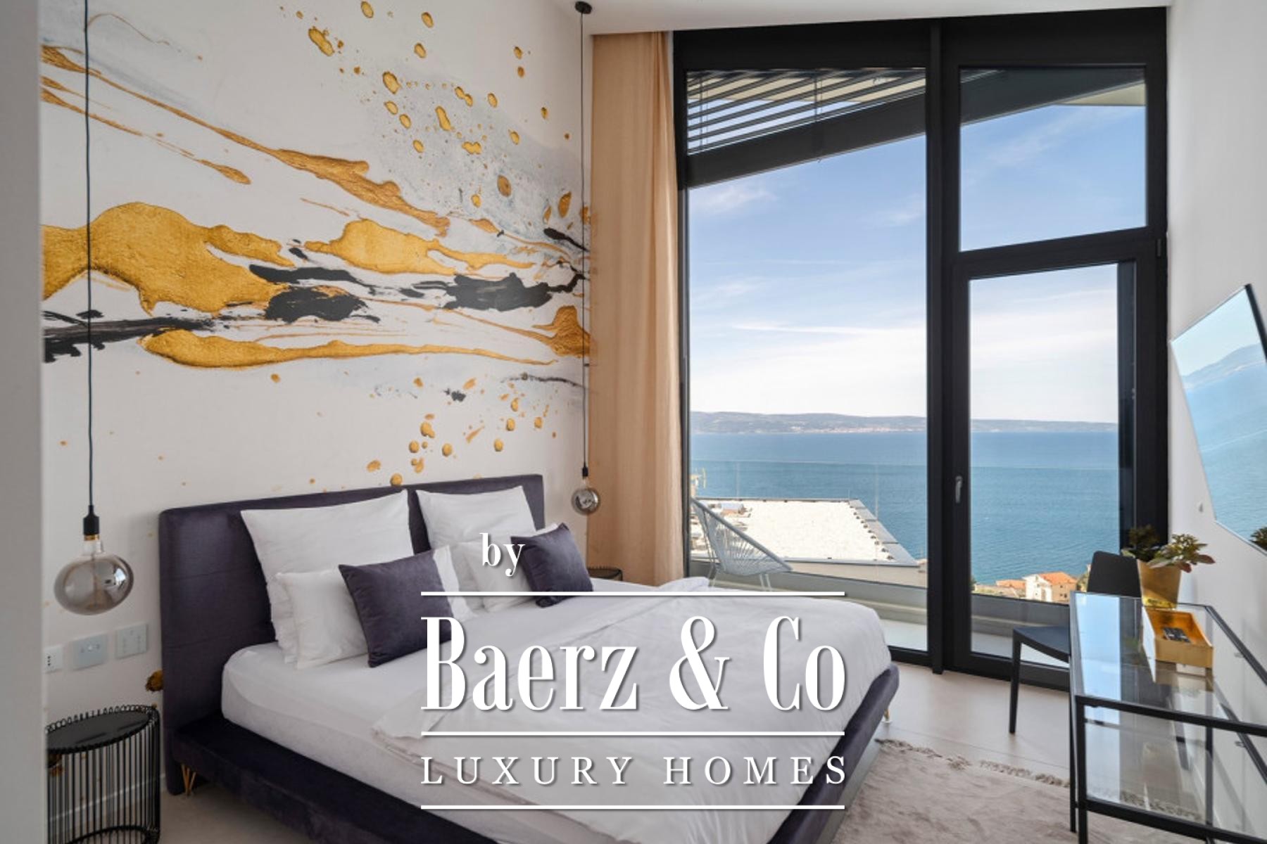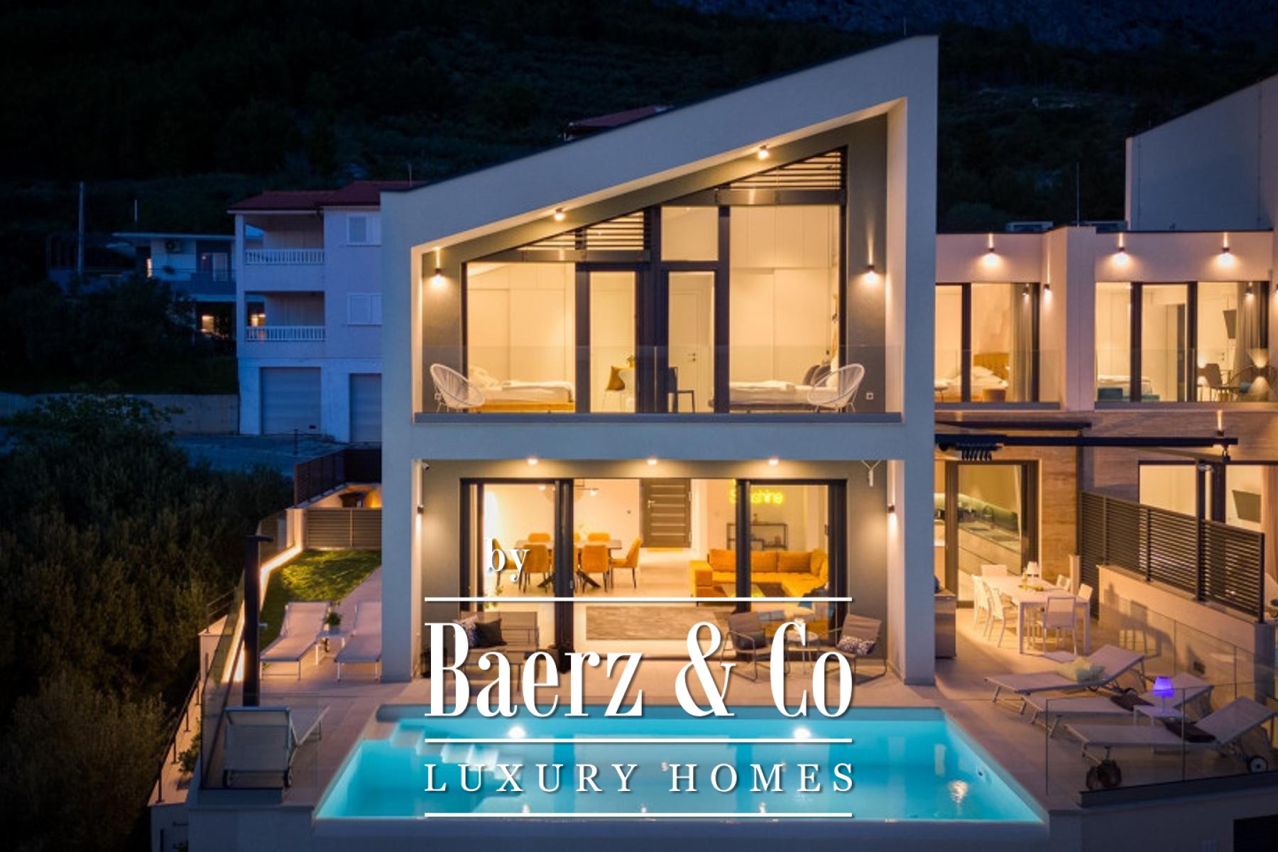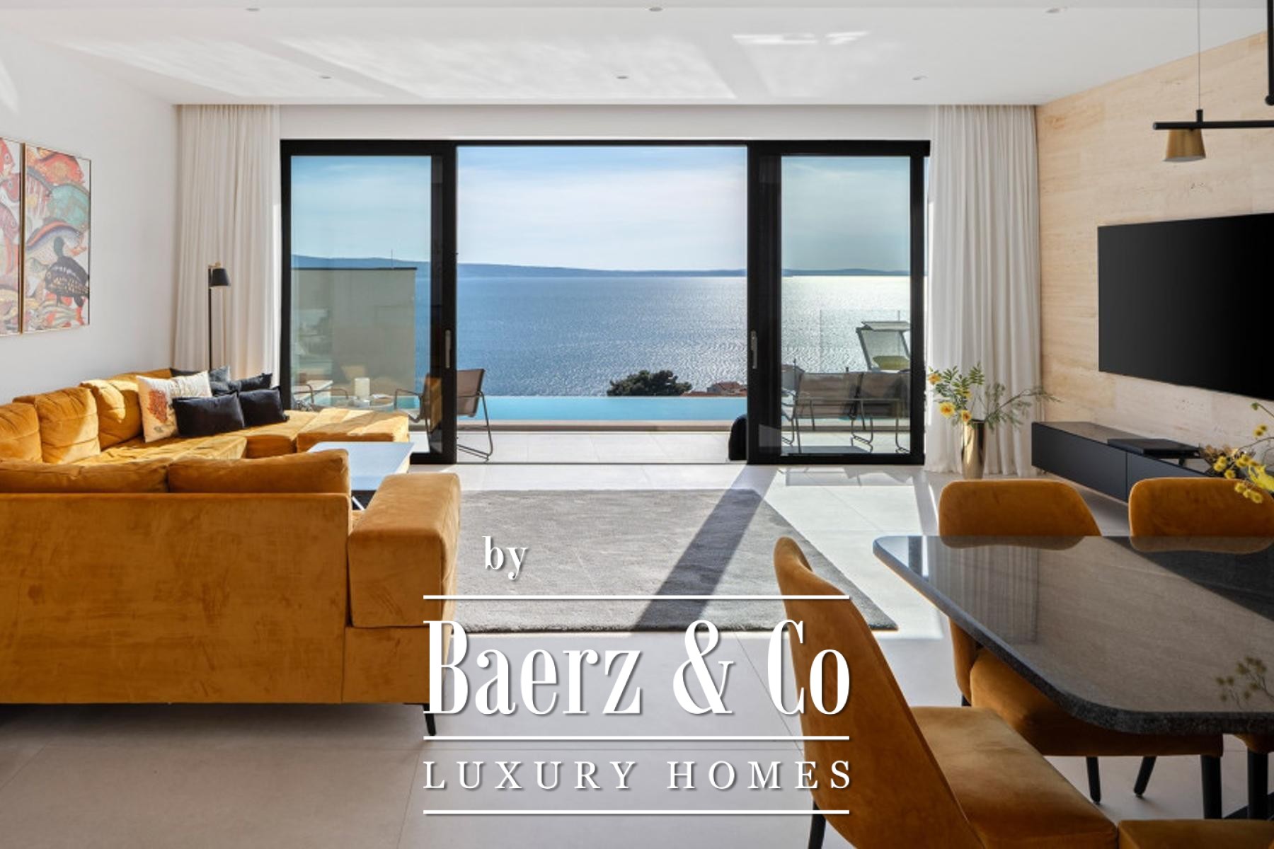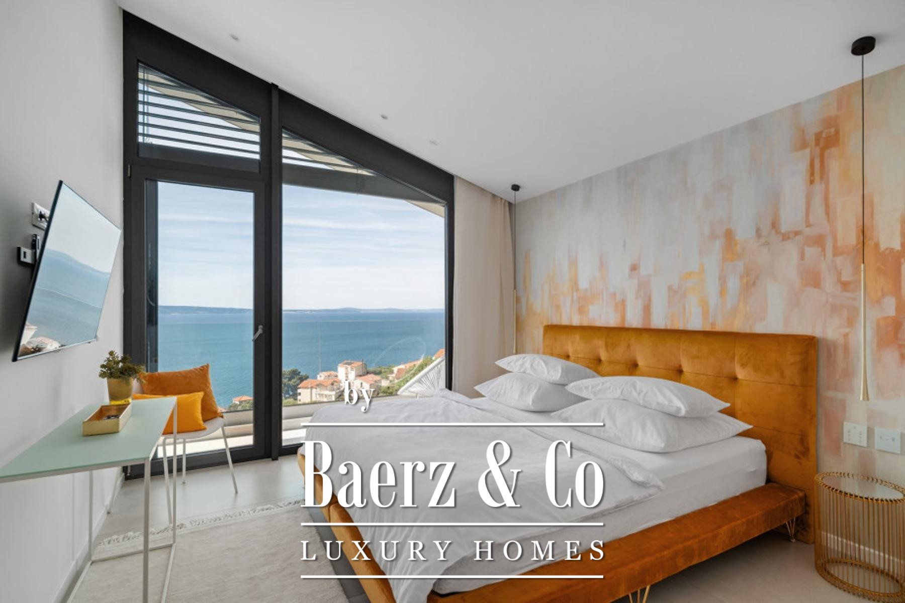 Semi-detached villa Dugi Rat invites a sense of refined ease, positioned to embrace expansive sea views from each of its three thoughtfully arranged floors. This 222 m² contemporary residence welcomes with an open living space, where the living room, dining area, and spacious kitchen flow seamlessly onto a broad terrace. Floor-to-ceiling sliding walls open to the Adriatic vista, drawing in the sense of light and serenity unique to this coastal setting.
