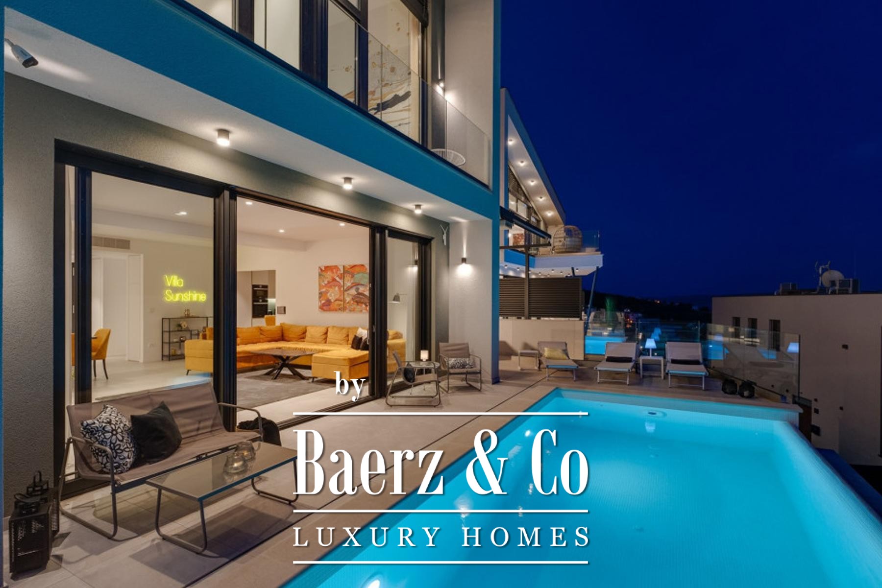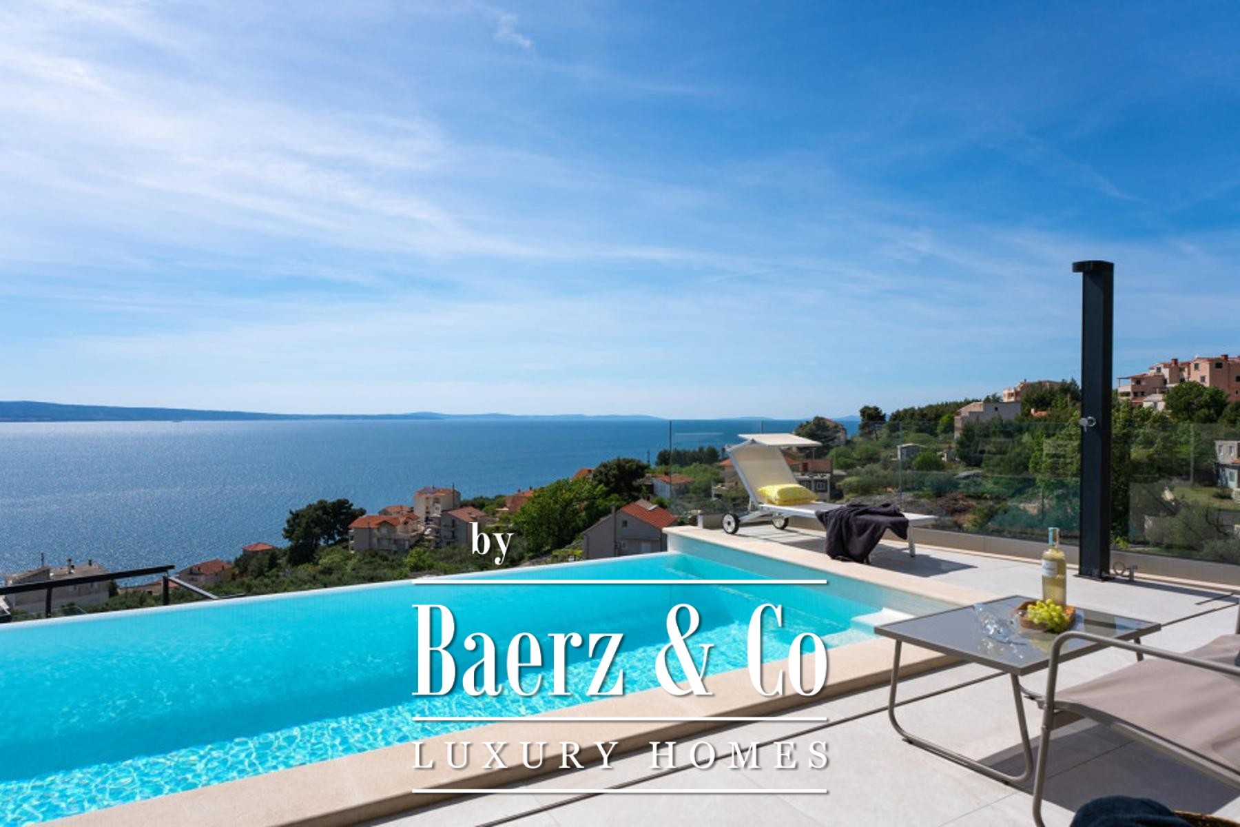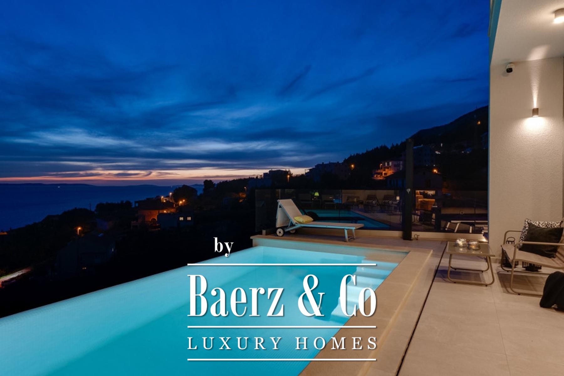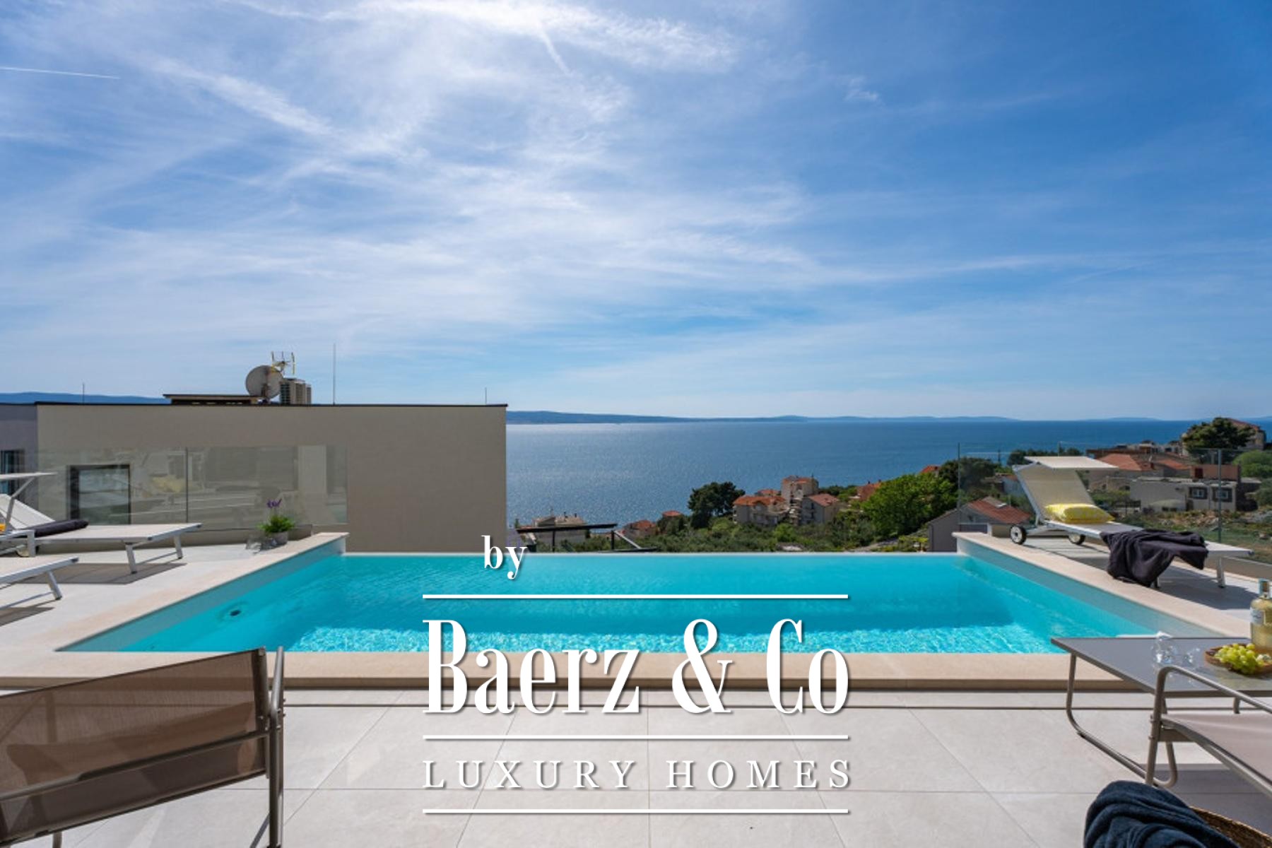 Semi-detached villa Dugi Rat invites a sense of refined ease, positioned to embrace expansive sea views from each of its three thoughtfully arranged floors. This 222 m² contemporary residence welcomes with an open living space, where the living room, dining area, and spacious kitchen flow seamlessly onto a broad terrace. Floor-to-ceiling sliding walls open to the Adriatic vista, drawing in the sense of light and serenity unique to this coastal setting.