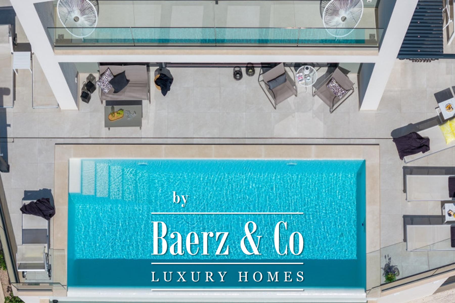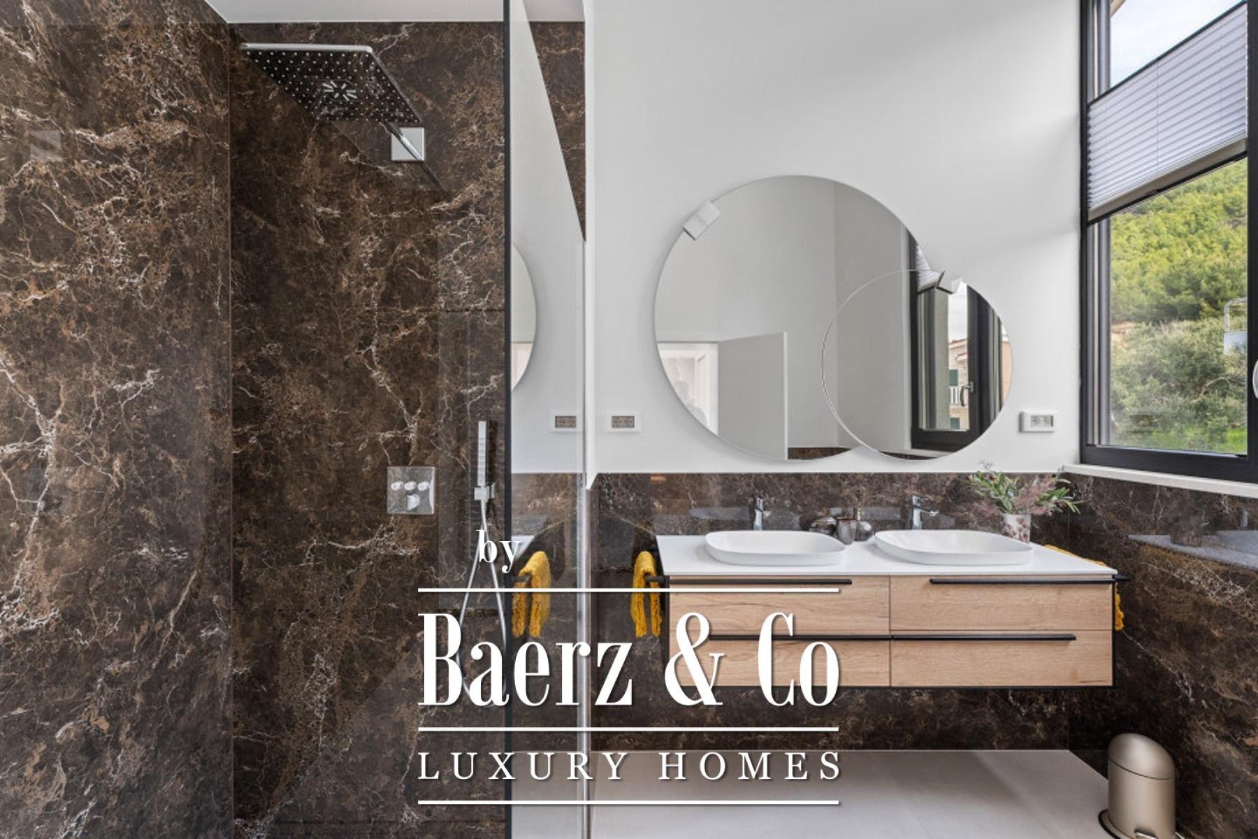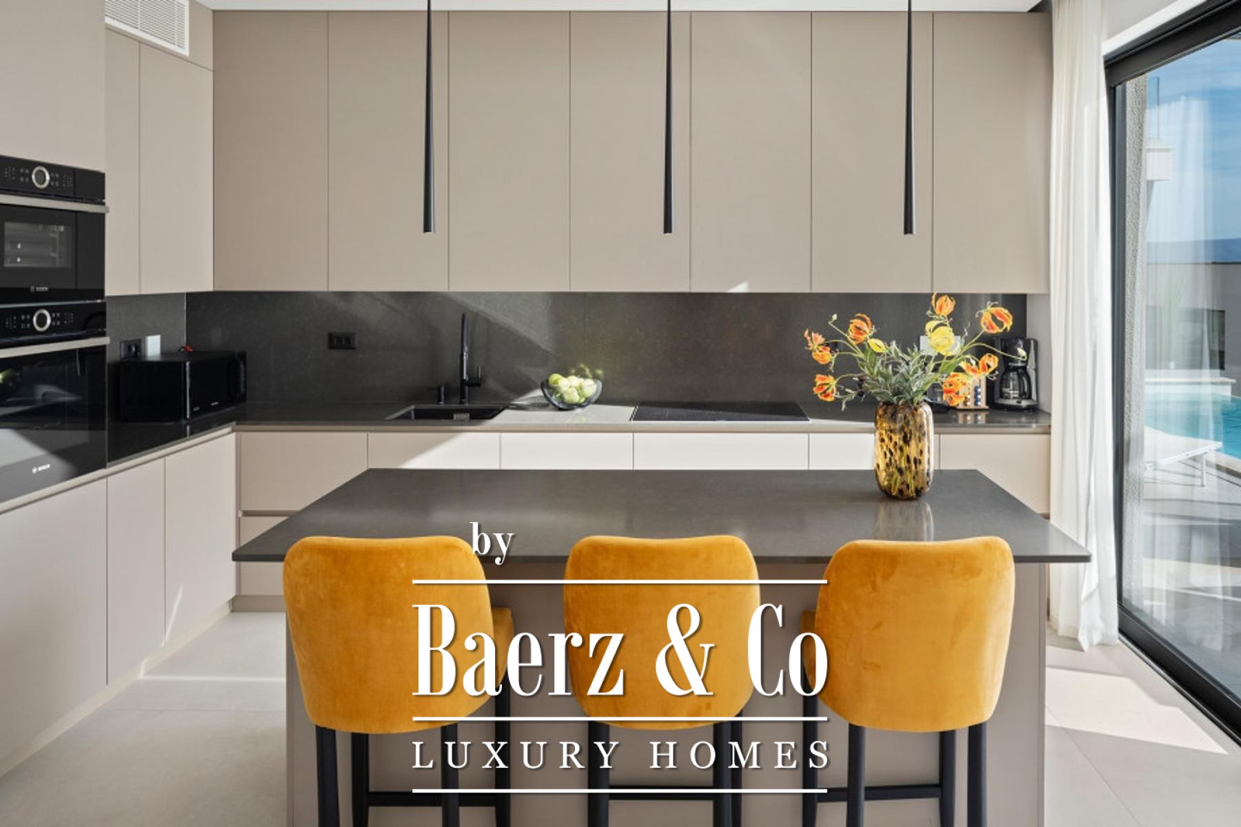 The villa offers three bedrooms, two bathrooms, and an additional guest toilet. All spaces are distinguished by clean lines and a sense of calm, accentuated by underfloor heating and smart home technology. Outside, a private pool and sunbathing area provide a discreet retreat, while two dedicated parking spaces add daily convenience.
