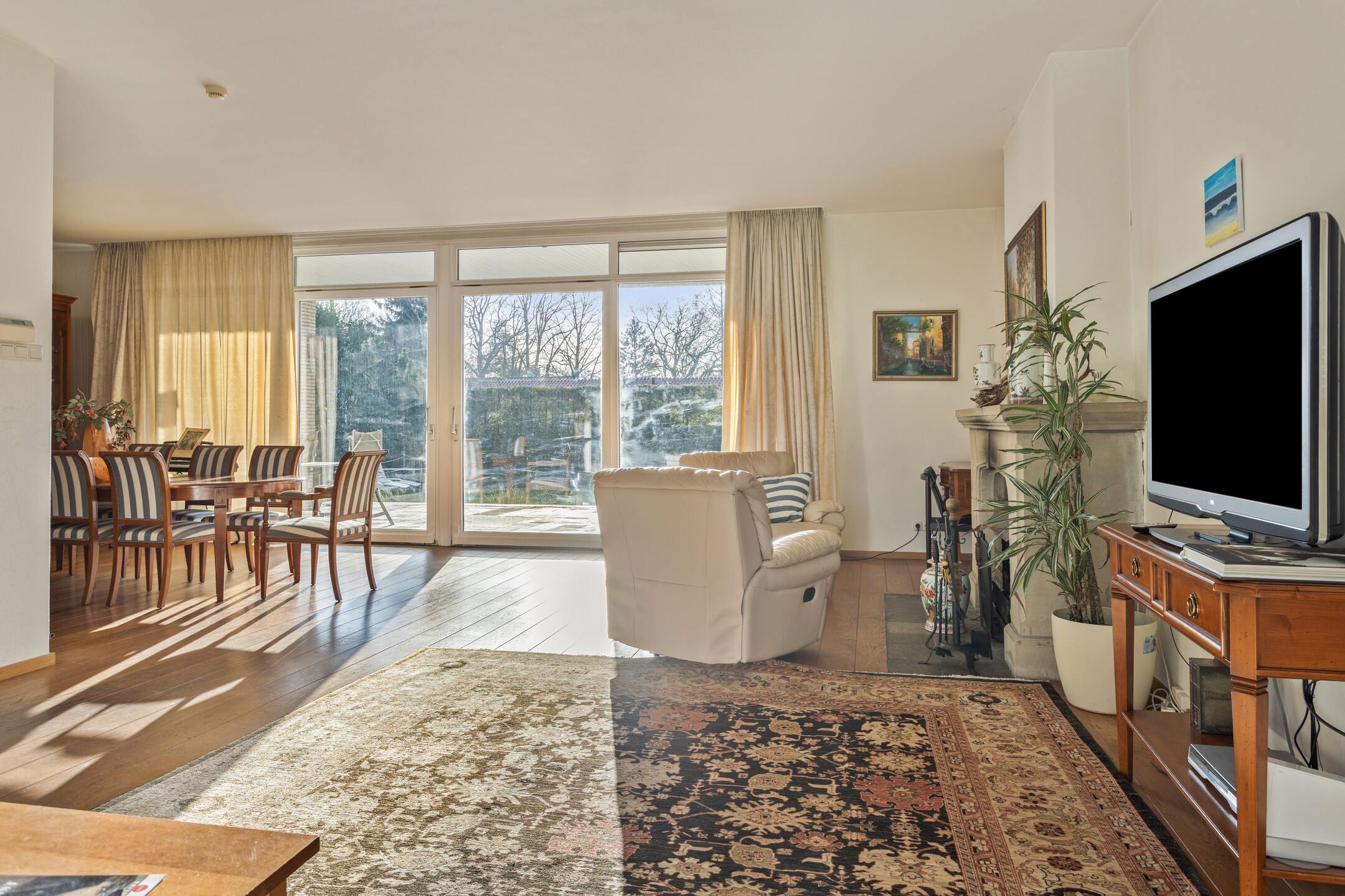 Covered entrance into a hallway with a striking double staircase and access to the guest toilet. From here, step into the L-shaped living and dining room with a cozy fireplace and classic mantel. The separate kitchen is fully equipped with built-in appliances, including a refrigerator, oven, microwave, dishwasher, and 4-zone induction hob with extractor. Three versatile rooms—currently used as bedrooms—are also accessible from the hall, two of which feature fitted wardrobes and en-suite bathrooms. Two of the bedrooms offer direct access to the beautifully landscaped rear garden, complete with a large partially covered terrace, lily pond, and lush greenery including rare and exotic plants.