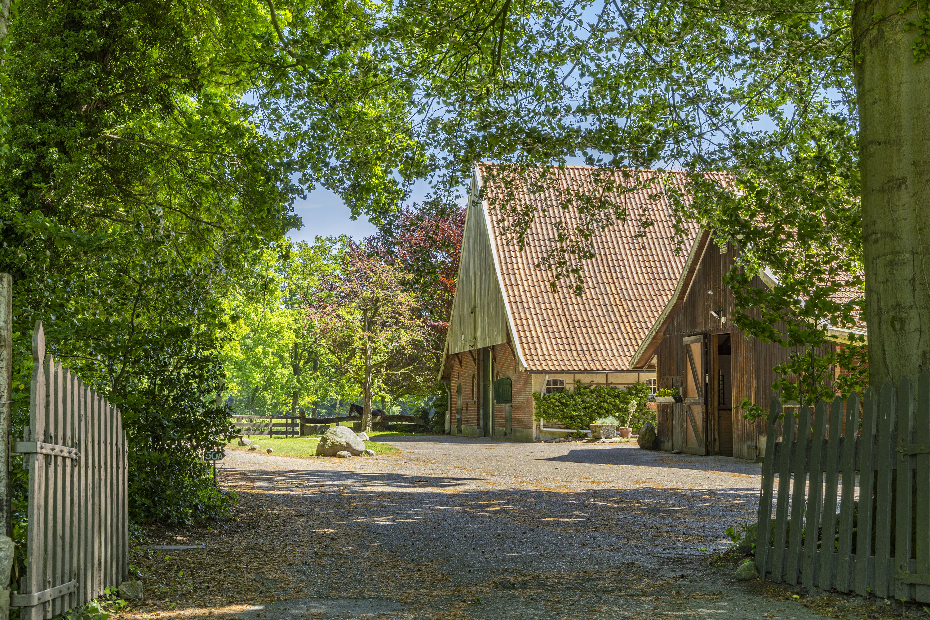 At the heart of the estate stands the robust farmhouse, built in 1930. Acquired in the late 1970s by relatives of the current owners, the farmhouse was carefully extended and renovated to become a luxurious residence that also supported hobby farming.