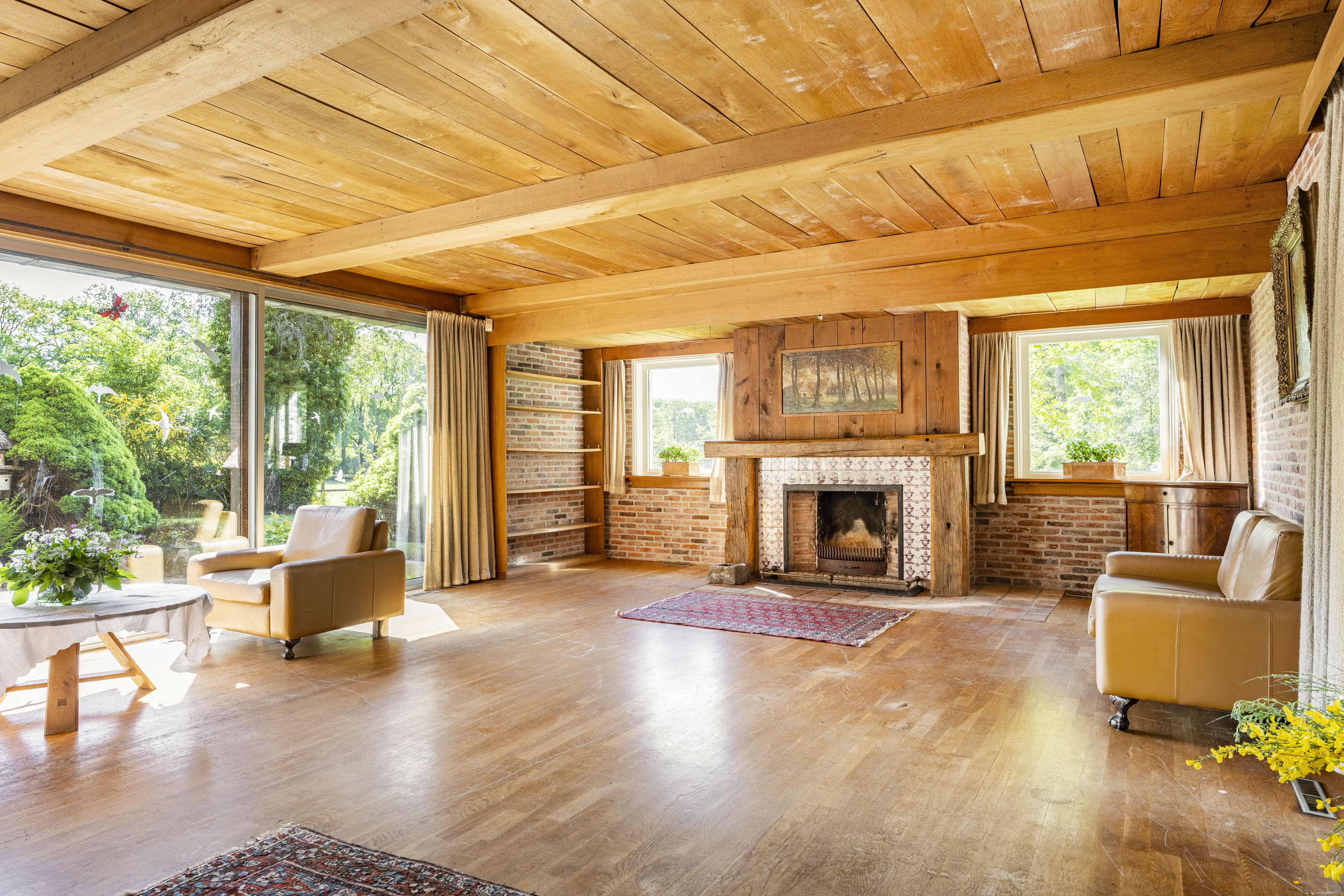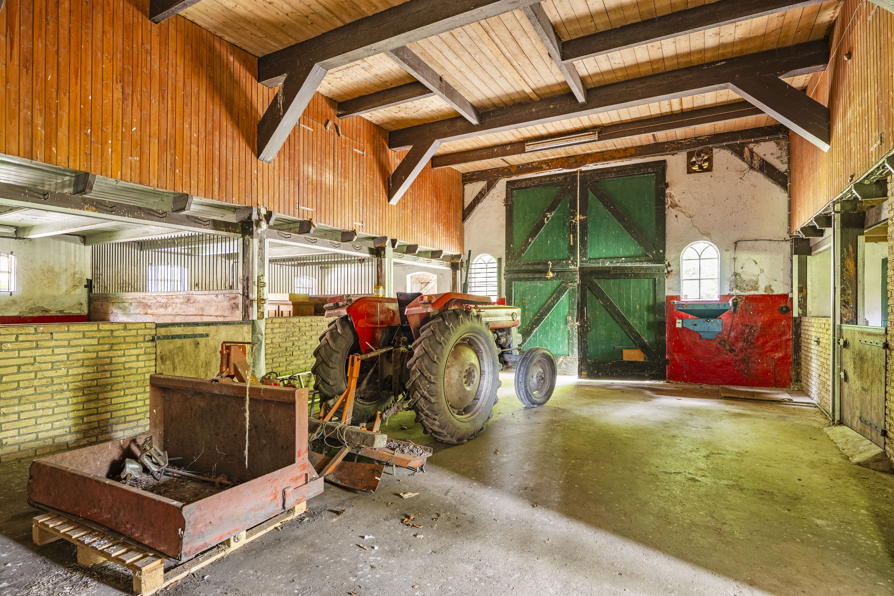 The back of the farmhouse remains structurally original, featuring beautiful wooden beams and a traditional stable door (the so called ‘niendeur’). Where cows once stood, there are now five horse stables, a tack room and additional facilities including an office, shower and laundry connections.