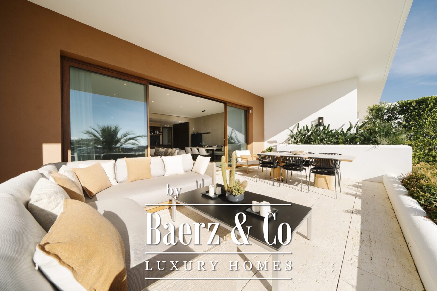 An elegant entrance leads to a bright, open-plan living and dining area, where dark stone and wood create a sophisticated kitchen space. This thoughtful design is complemented by an independent laundry room. The living area extends to a large terrace with shaded areas for sunny days, a dining space, and a chill-out zone offering stunning views of the sea and the golf course.