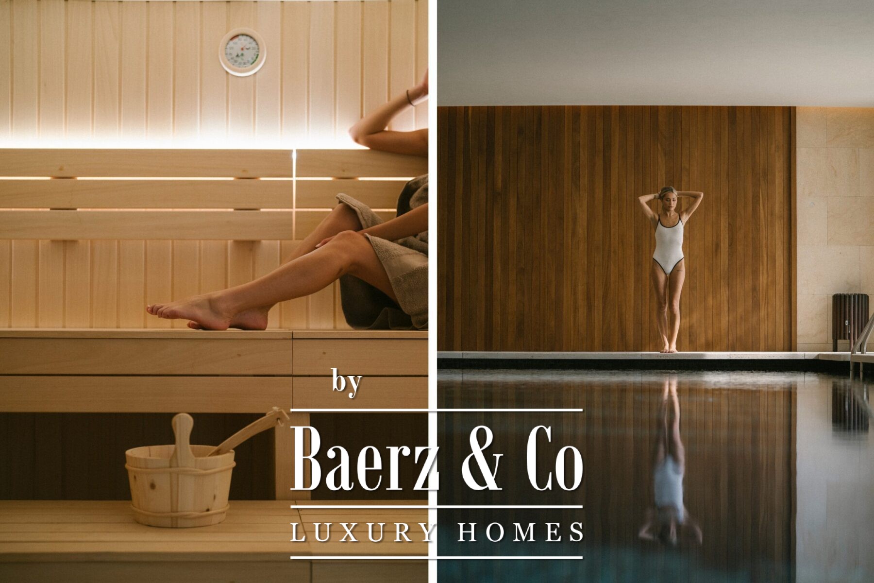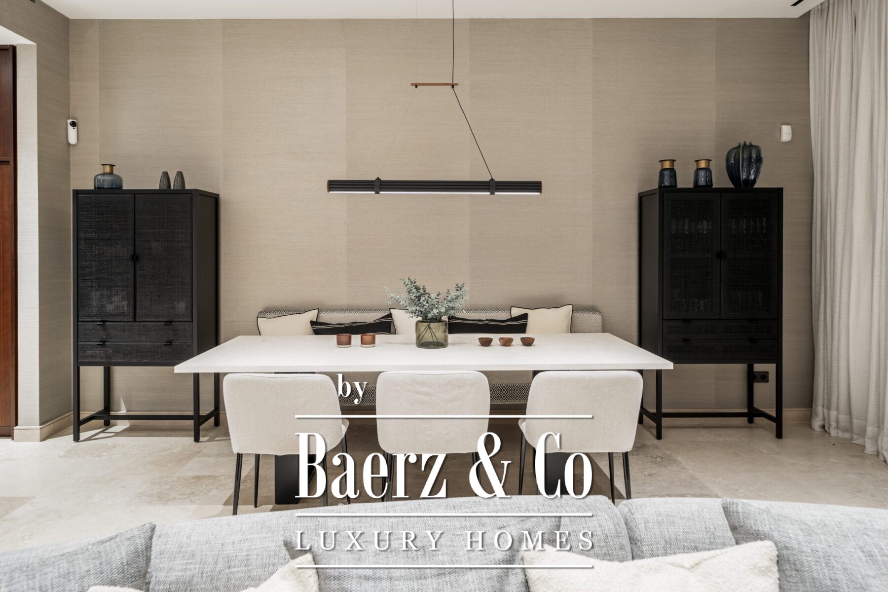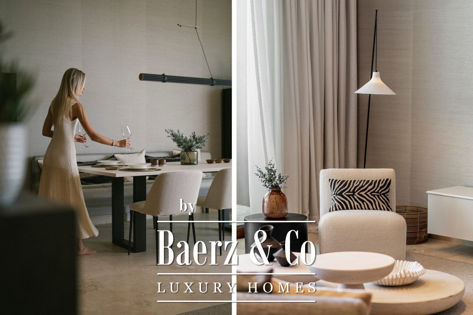 This luxury apartment includes three spacious en-suite bedrooms, each adorned with warm sand-toned Carrara marble bathrooms, complete with double sinks and showers. The master suite boasts a bespoke walk-in closet, a bathtub, and an immense window that opens directly onto the terrace. Characterful wooden finishes and high-quality materials throughout enhance the inviting atmosphere. The muted palette in sandy tones creates a warm aesthetic, harmonising beautifully with the natural surroundings.