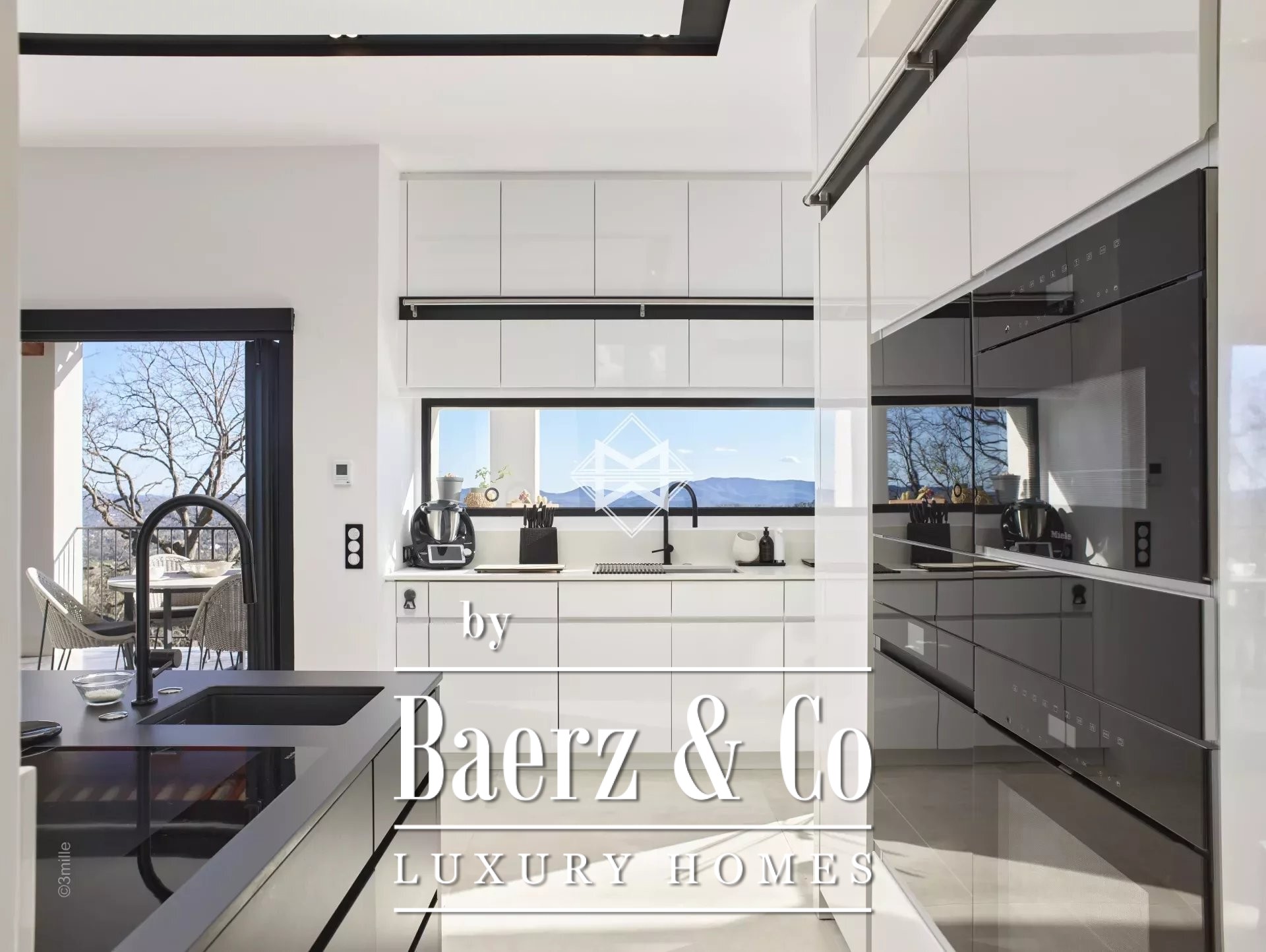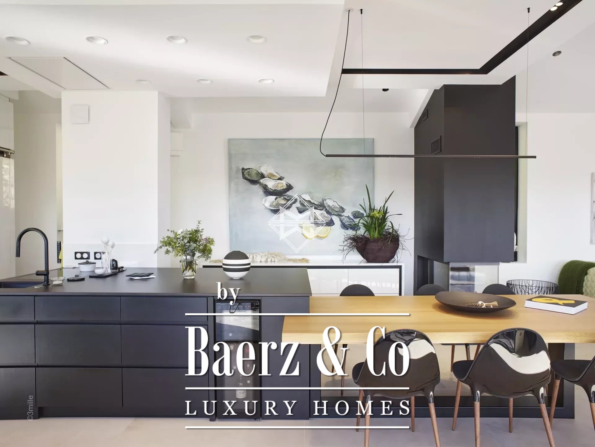 The main house, covering an area of approximately 400 square meters, extends over three levels serviced by an elevator. This residence boldly combines modernity and authenticity, providing a harmonious living space including a living-dining room with an open-plan kitchen, leading to a covered terrace with a summer kitchen near the sun-drenched pool. A study and a large laundry room complete this level.