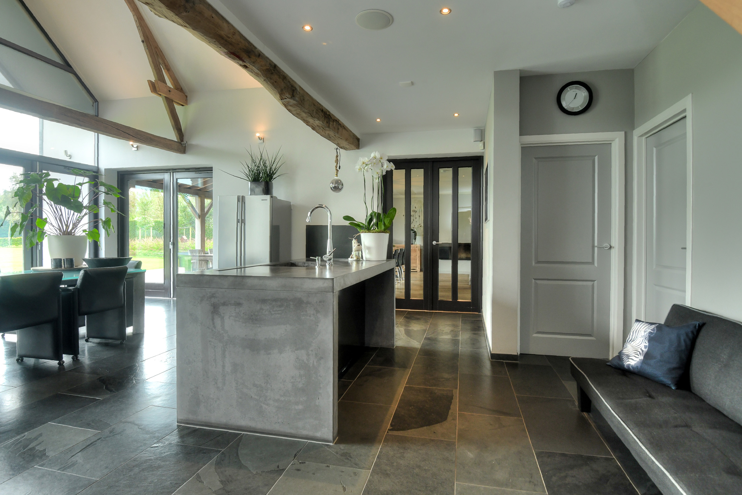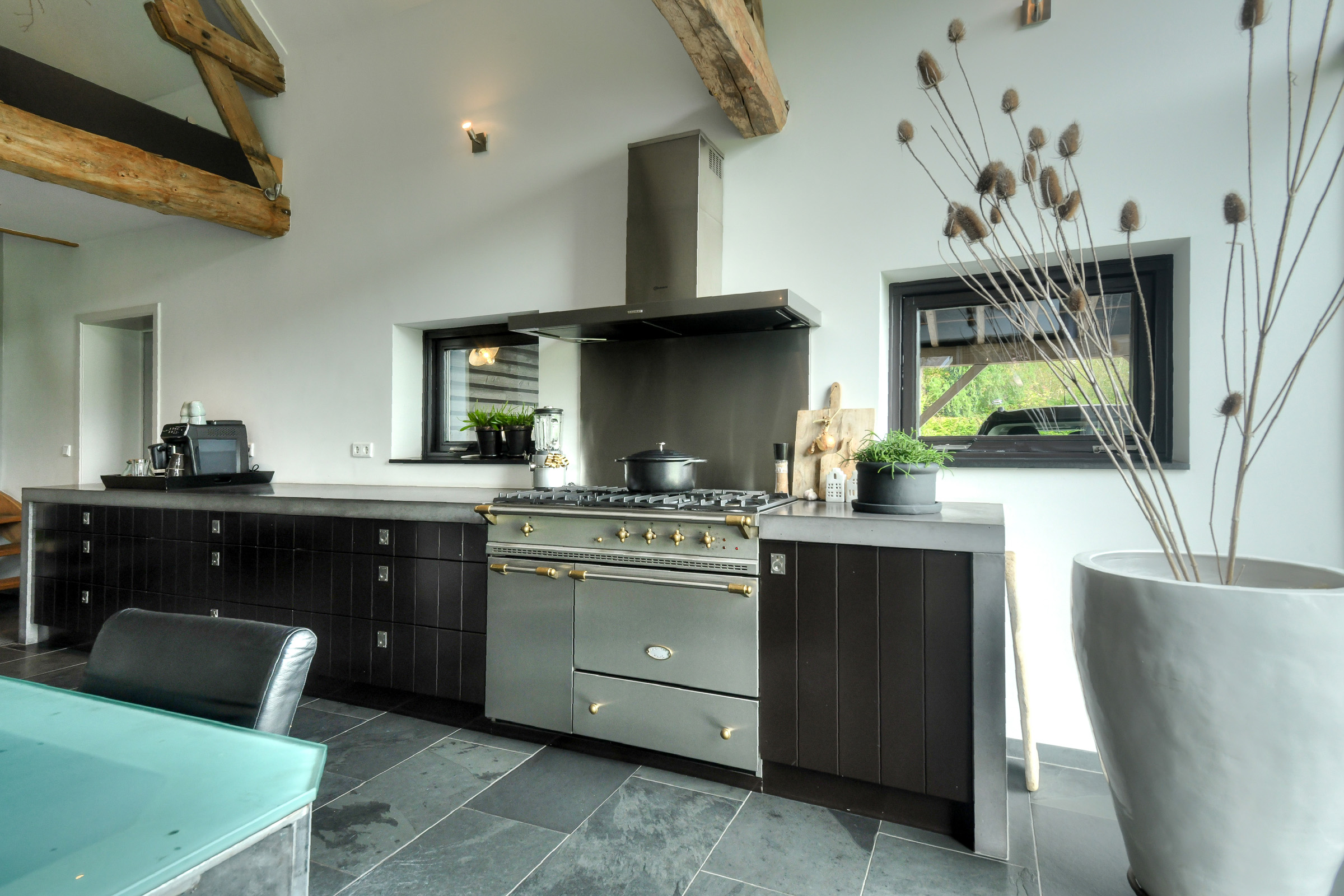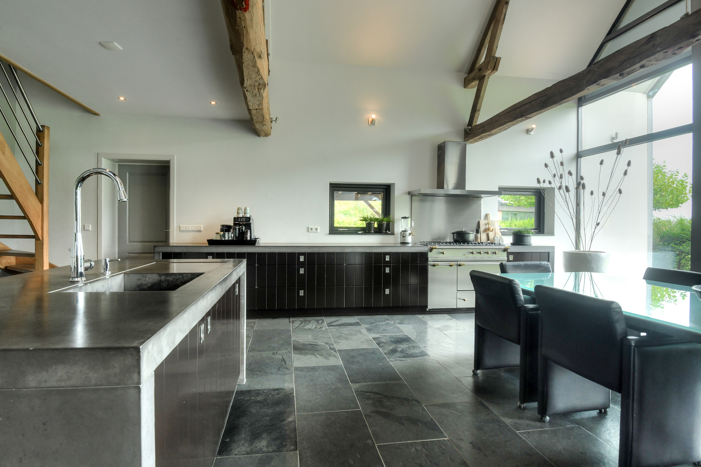 The beautiful kitchen-diner (approx. 51 m²) forms the heart of the home. This light and very spacious kitchen is equipped with a modern and luxurious design, including a concrete countertop, a wide gas stove (Lacanche) with multiple ovens, an extractor hood, and ample storage space. There is also a kitchen island (also with concrete top) with sink, designer faucet, dishwasher, and additional cupboard space.