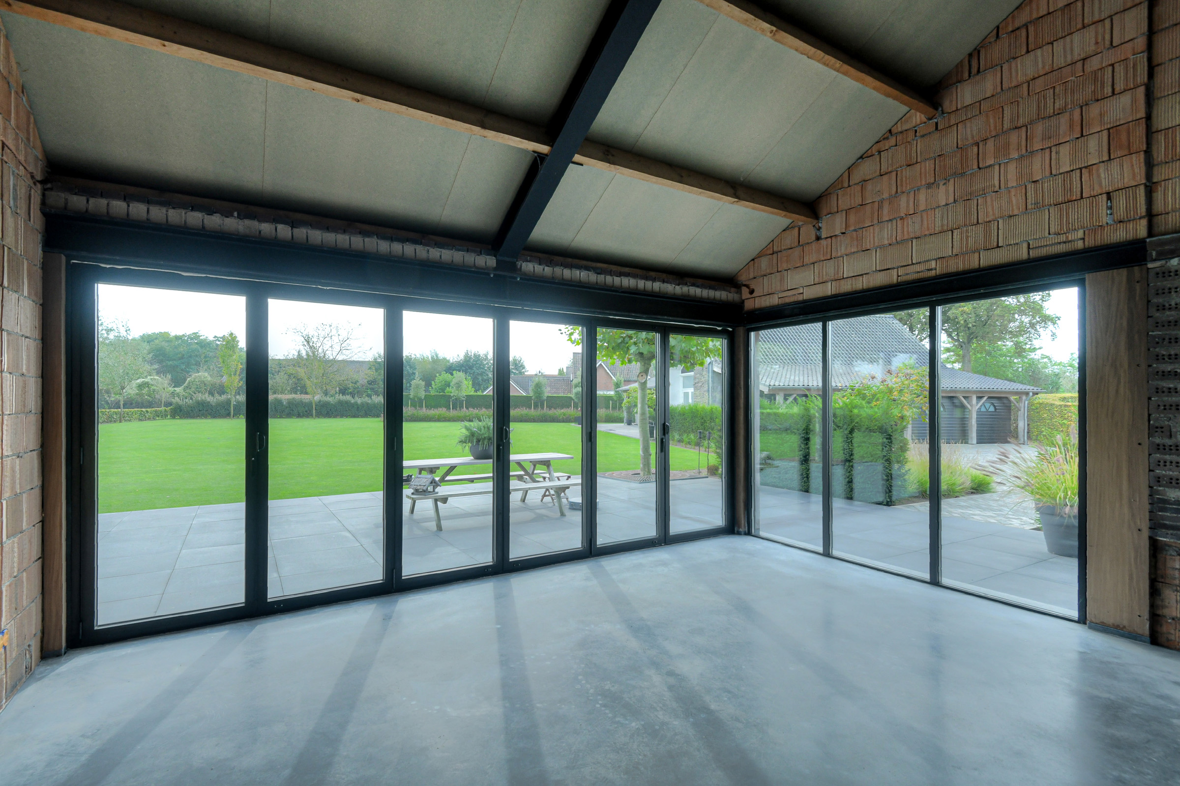 A fully openable glass folding wall creates a seamless connection to the garden.