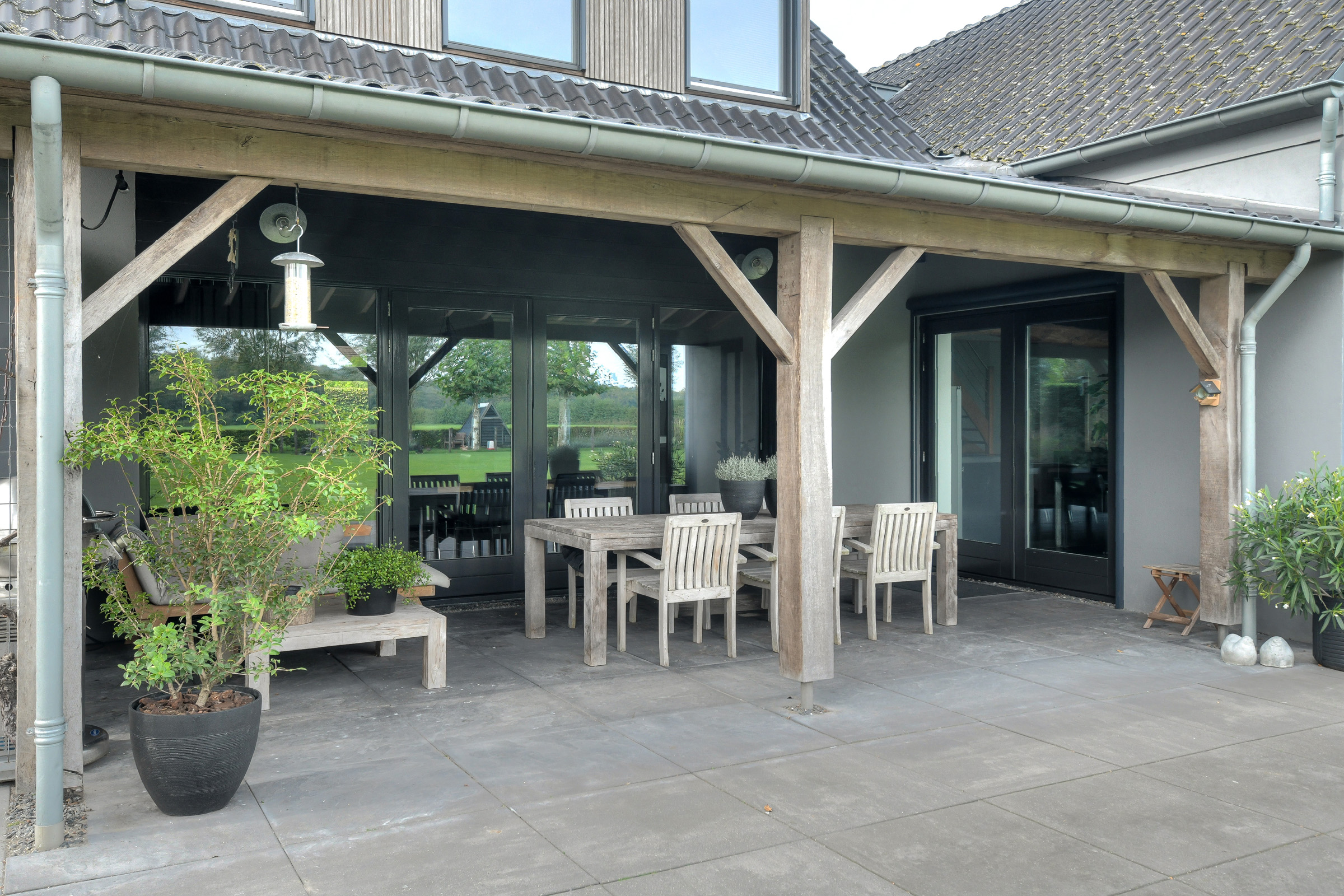French doors provide access to the veranda. From here too – where an outdoor fireplace is located – you can enjoy stunning views of the garden and surrounding landscape.