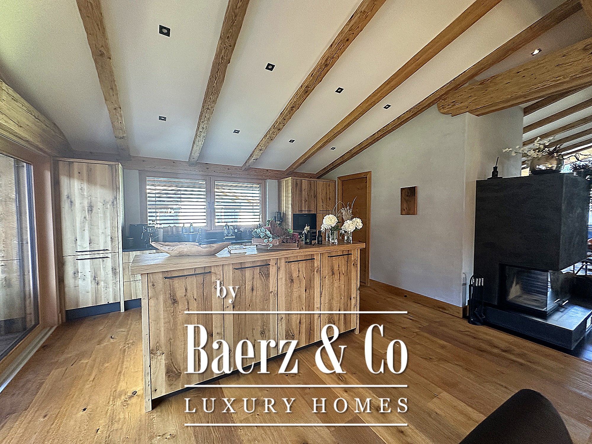 The uppermost level gathers the living, dining and kitchen areas beneath exposed trusses, anchored by an open fireplace and framed by balcony terraces that celebrate the mountain panorama. Premium oak flooring, bespoke kitchen, Sonos system, electric blinds and floor heating complete the experience.