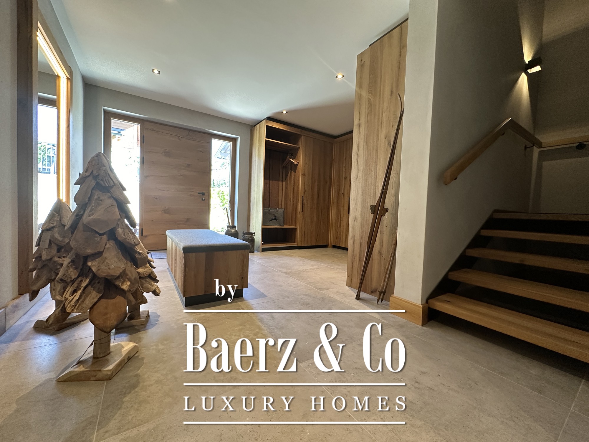 Entry is provided through the lower level, where a generous cloakroom, double garage and ample storage accommodate alpine living. The wellness suite with sauna, fitness area, shower and technical amenities further emphasizes the chalet’s commitment to comfort. A lift links all levels, ensuring seamless movement throughout the residence.