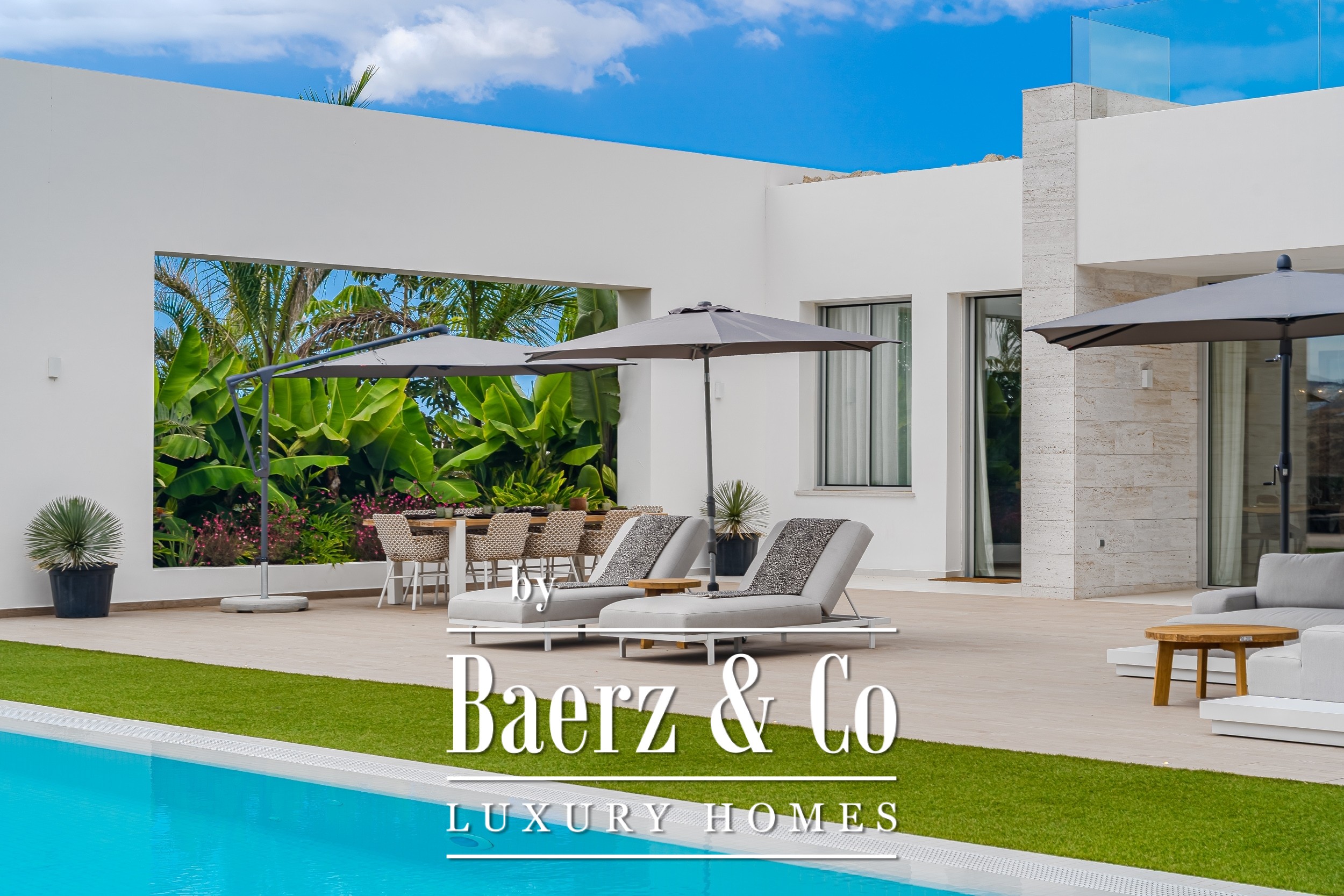 Luxury villa Golf Costa Adeje stands discreetly among the most prestigious addresses in southern Tenerife, where elevated design meets calm seclusion. Set within a 2,500 m² plot and embraced by a 1,500 m² tropical garden, this property reflects sophisticated island living. The villa encompasses approximately 350 m² of thoughtfully arranged spaces, complemented by a 200 m² basement that invites customization, whether for a private cinema, wellness studio, or gym.