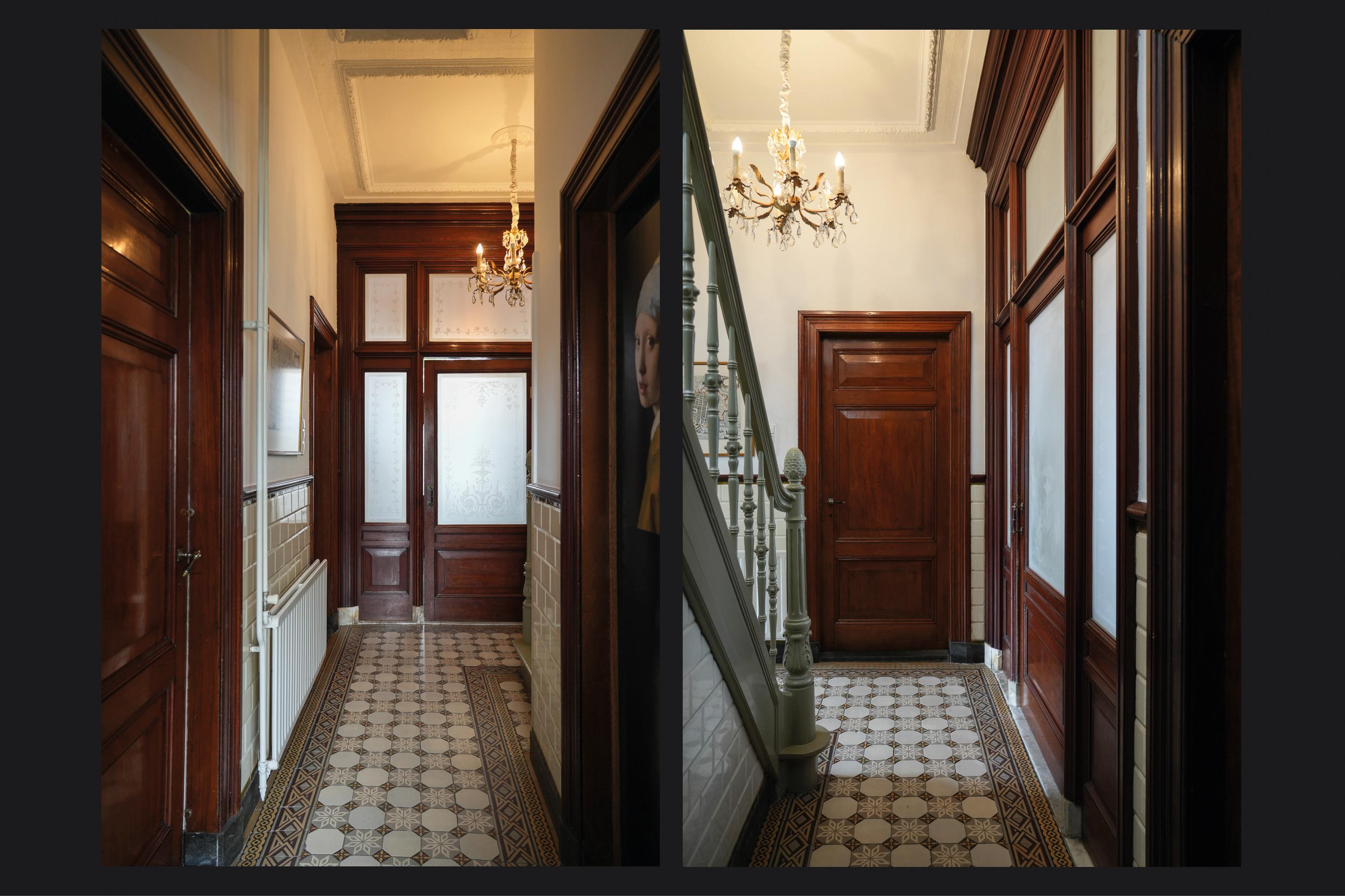 Behind the elegant façade, the original panelled front door opens into a vestibule of rare grandeur — with its high ornamental ceiling, finely detailed woodwork, and beautifully preserved etched glass. The marble floor and original wall tiles remain intact.