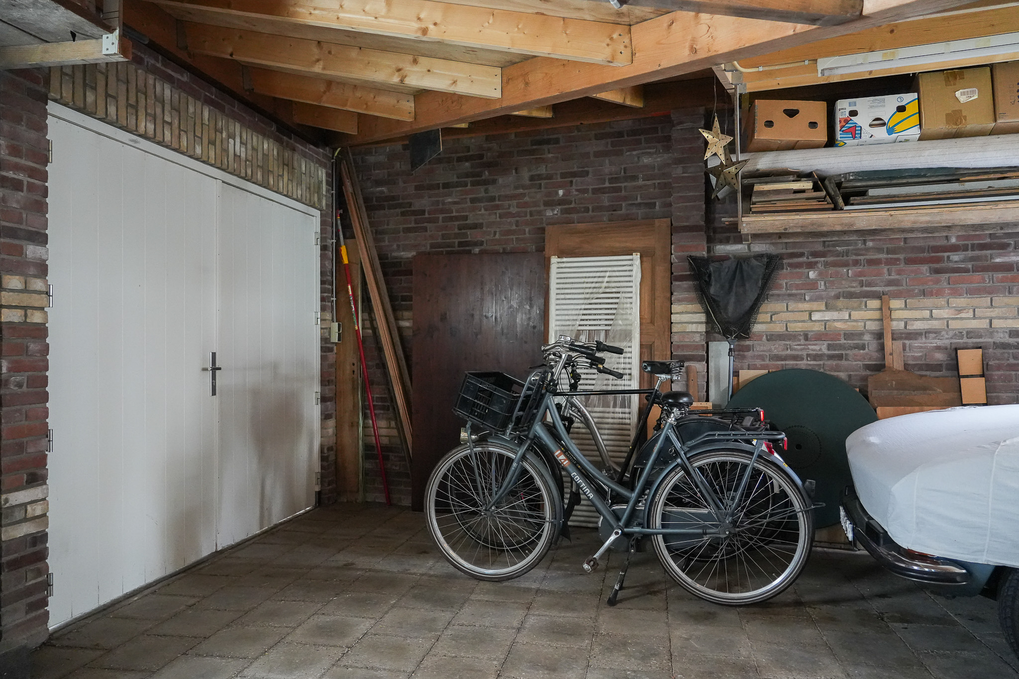 Behind the house lies a unique garden, 9.5 metres wide and 15 metres deep, facing east and south — offering both sunny and shaded spots throughout the day. In 2021, the owners were able to extend the plot, creating space for a large, tiled outbuilding (59 m²). This building is ideal for use as a garage for a classic car or boat, or as an artist’s studio. The double doors open onto the private parking area behind the house.