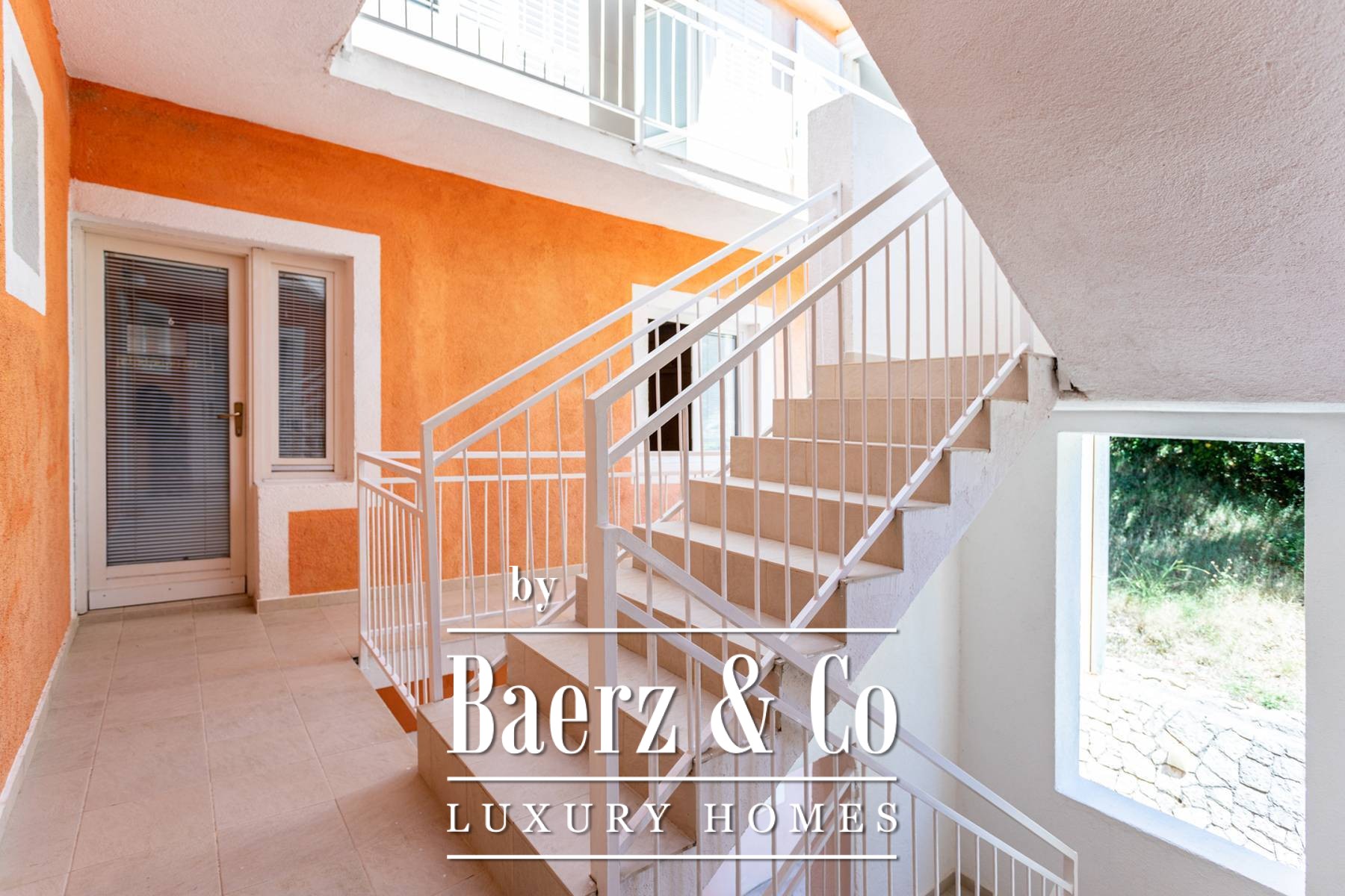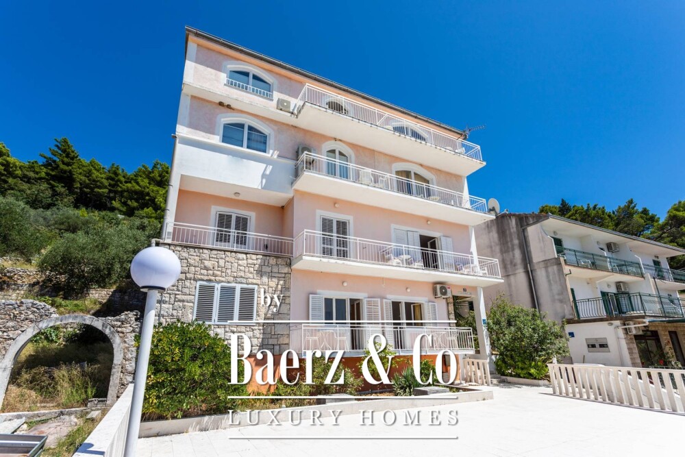 Townhouse Drvenik stands first row to the sea, commanding unobstructed views across the Adriatic to the islands beyond. This Mediterranean building, shaped by its original architecture, extends over 897.4 m² and five levels, with a cultivated stone garden that amplifies the relationship between home and the water’s edge. The composition is defined by high ceilings, grandly scaled rooms, and a sequence of 19 bedrooms and 19 bathrooms, distributed among generous apartments and suites on every floor.
