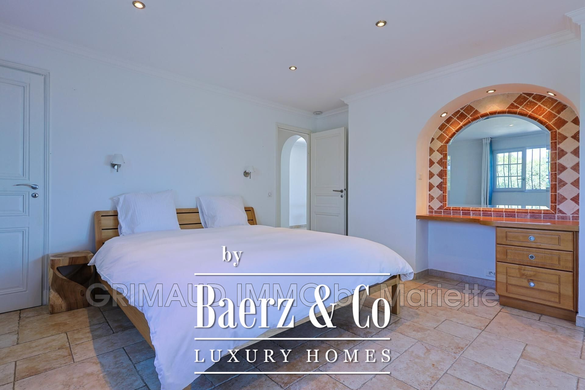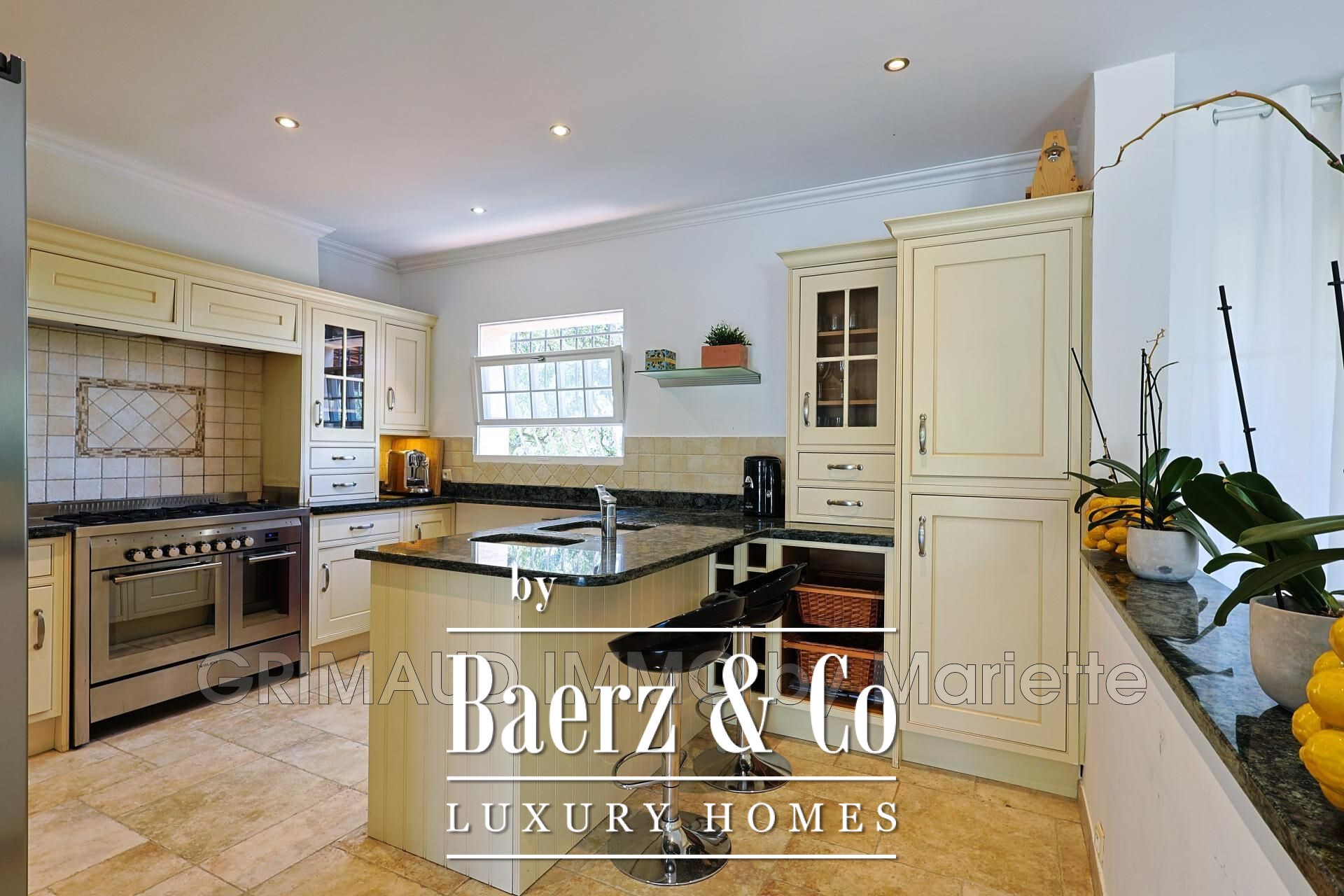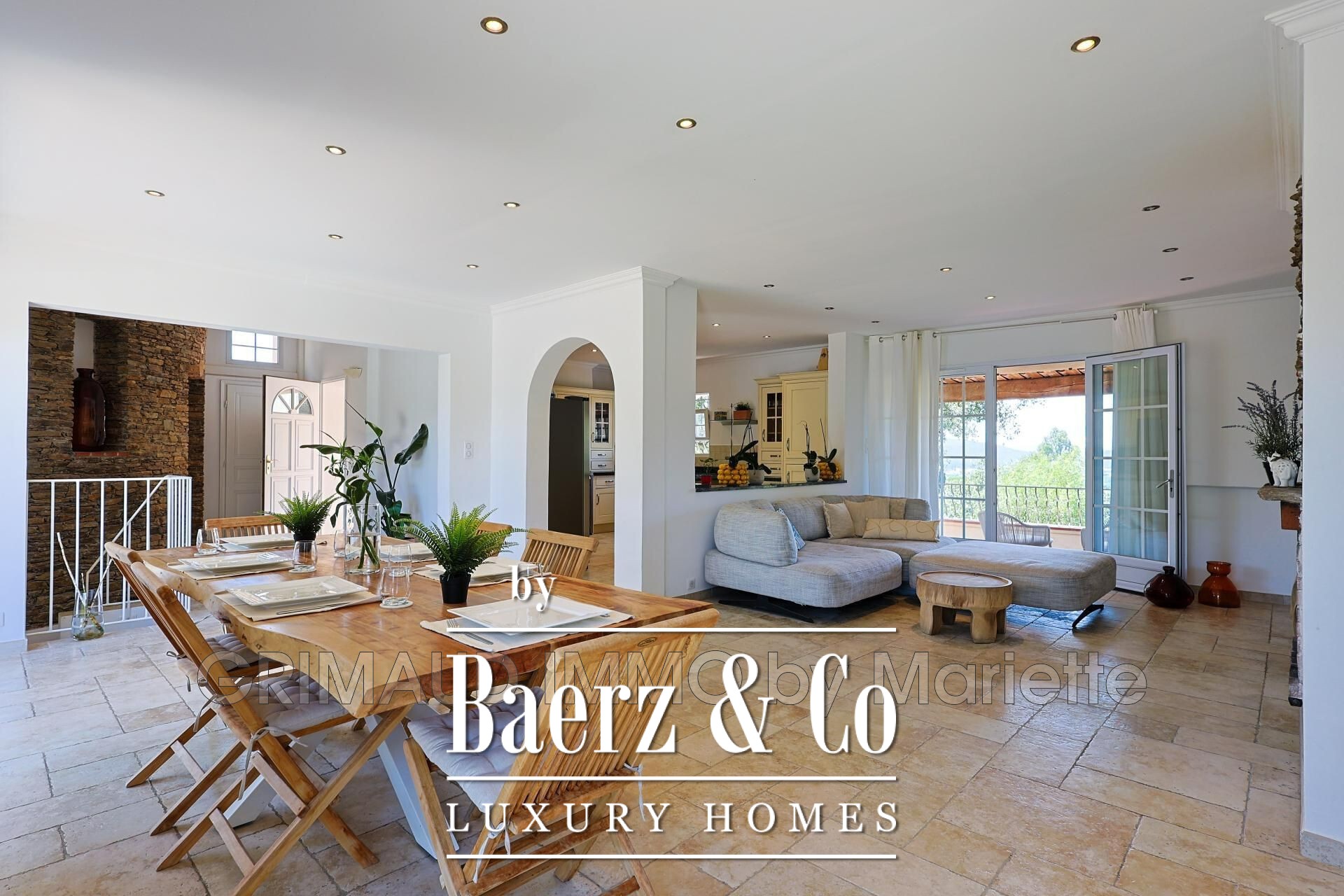 Beautiful property located in a quiet area with a small sea view within a secured estate, set on 1680m² of garden with its swimming pool. The house features a spacious living room with a fireplace, opening onto the fully equipped kitchen, a master bedroom with a shower room