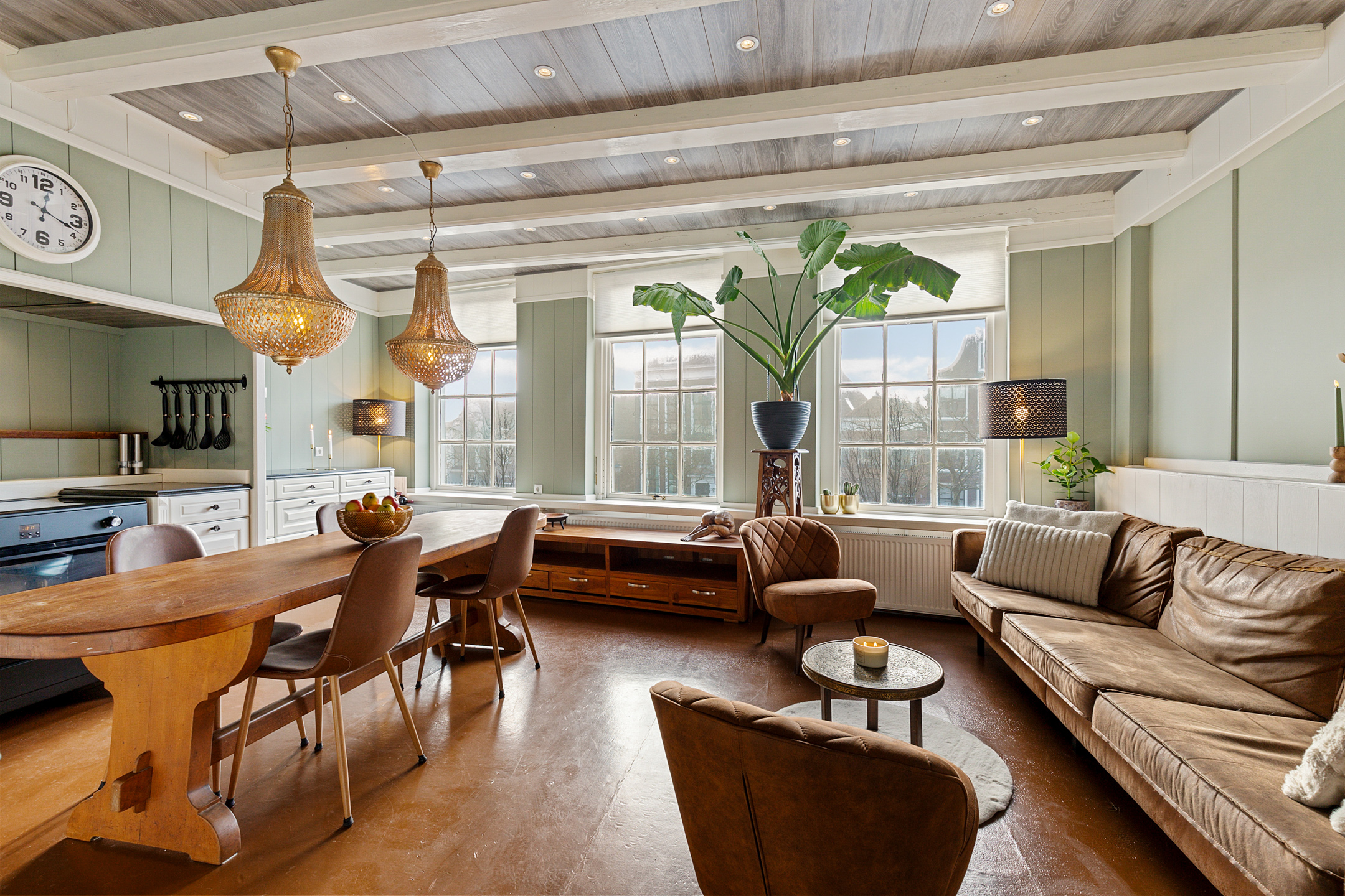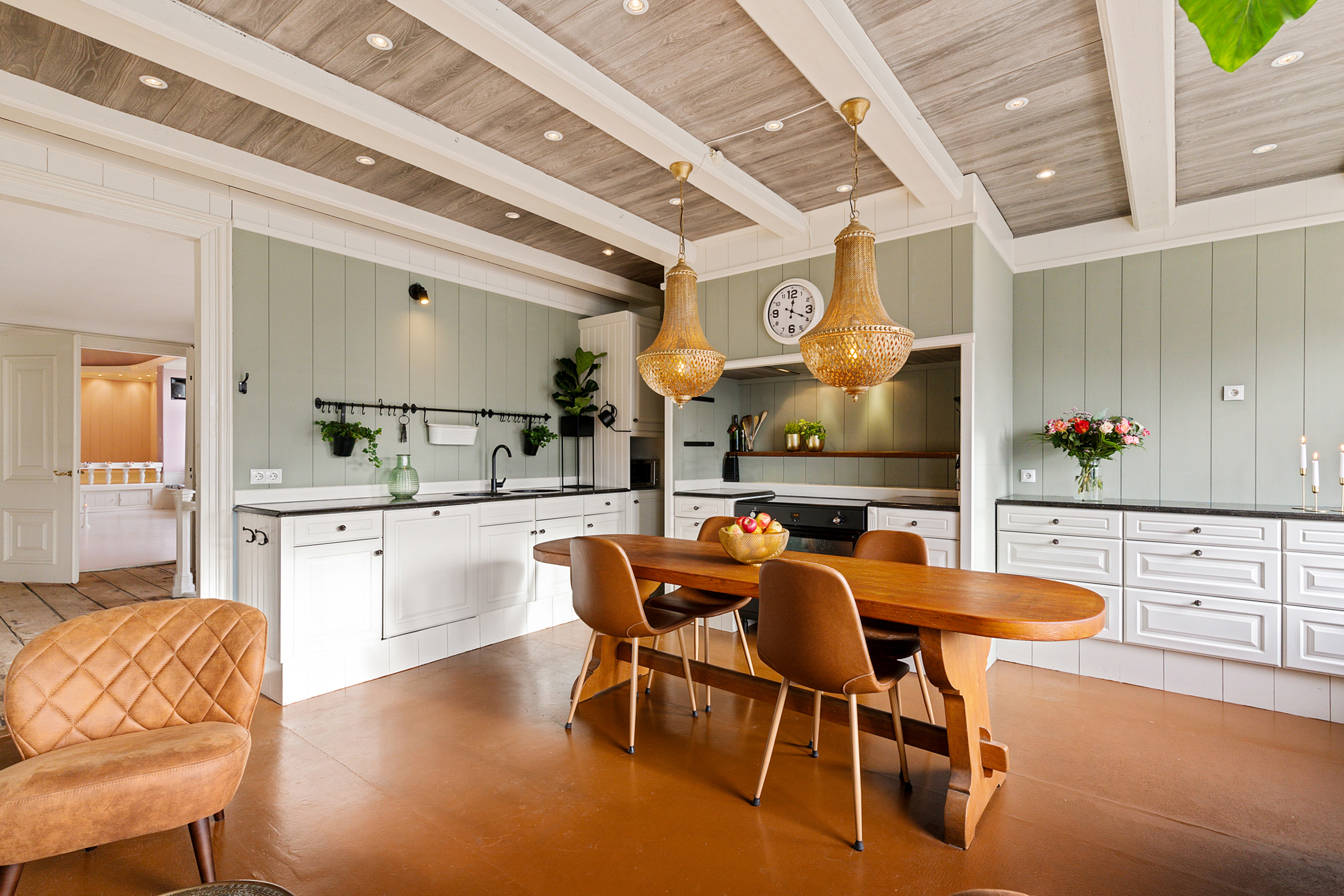 The monumental staircase leads to a generous landing on the first floor. At the front lies the atmospheric living kitchen with canal view and ample space for a large dining table and seating area.