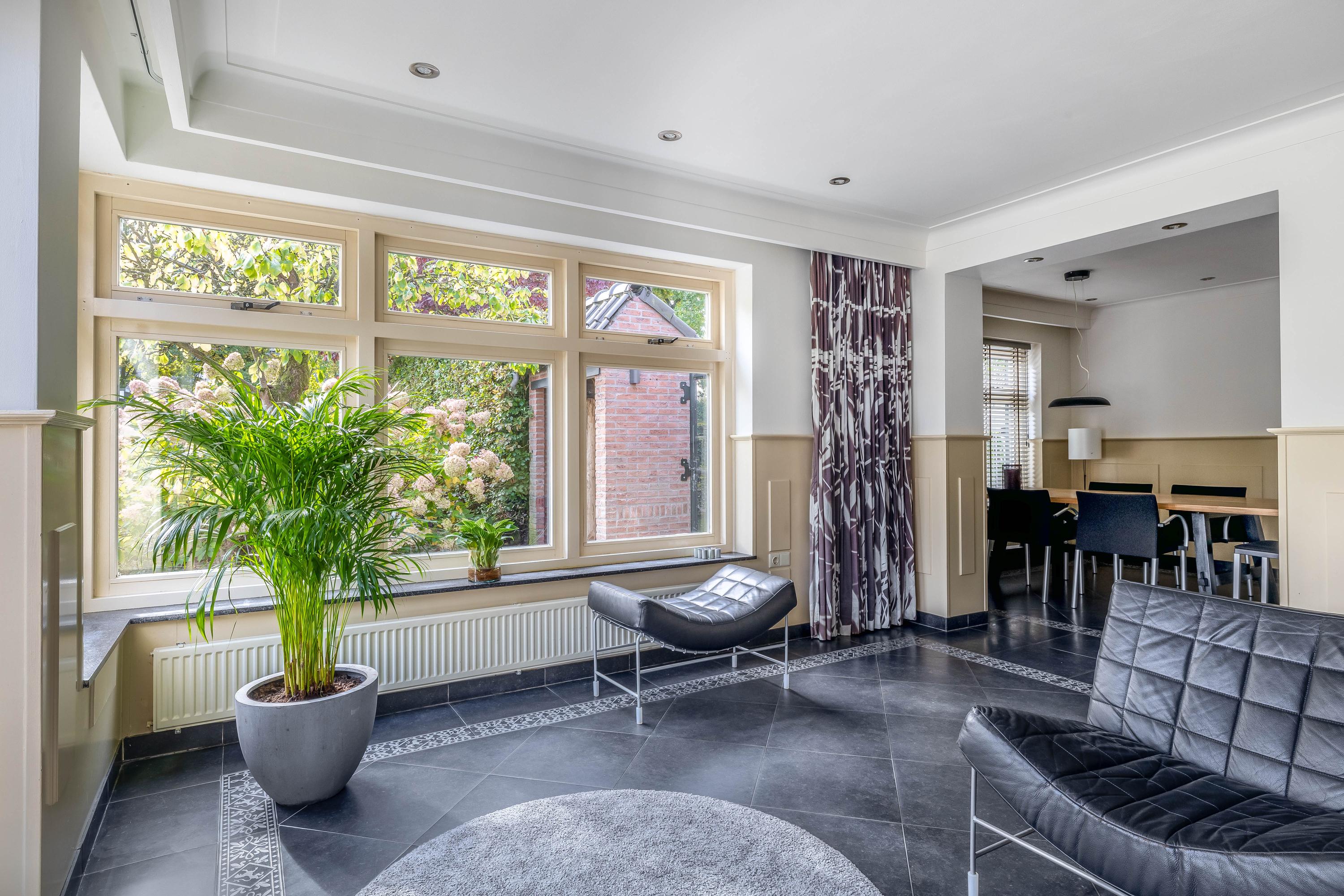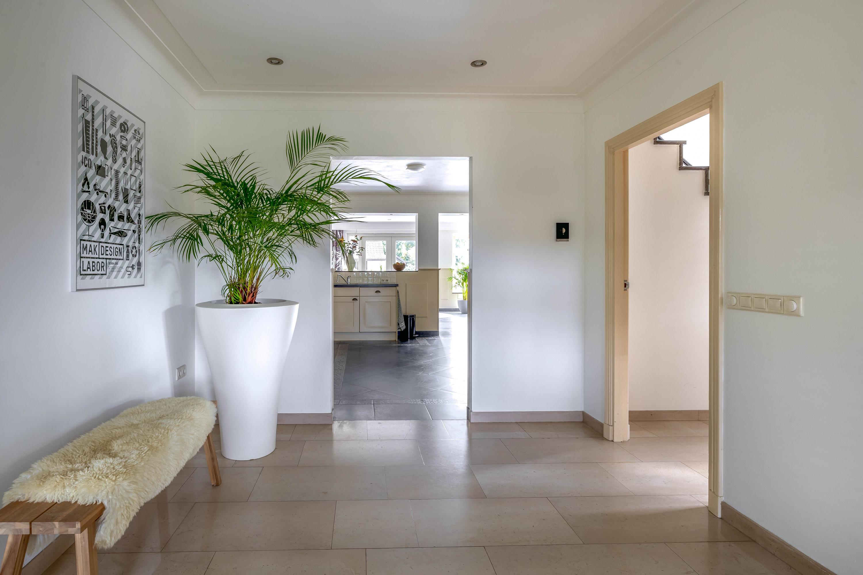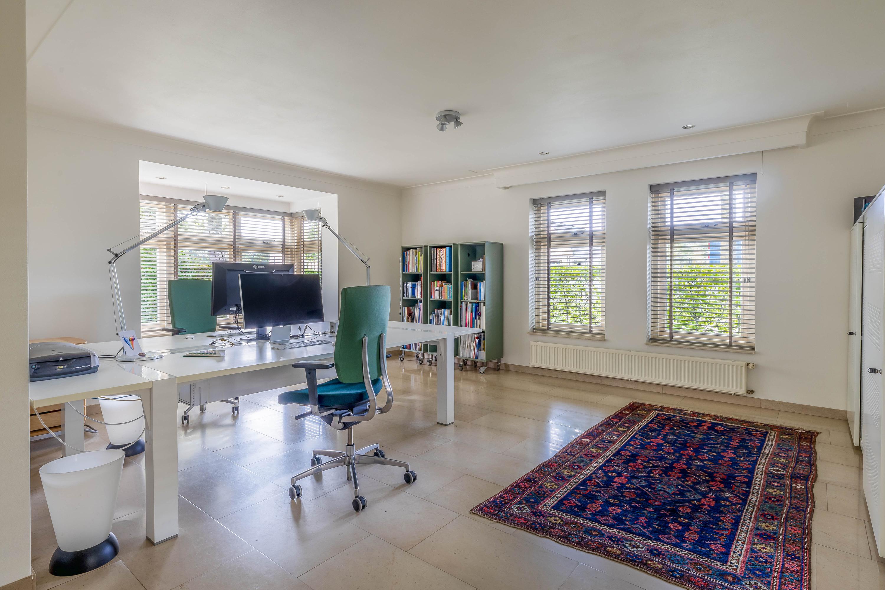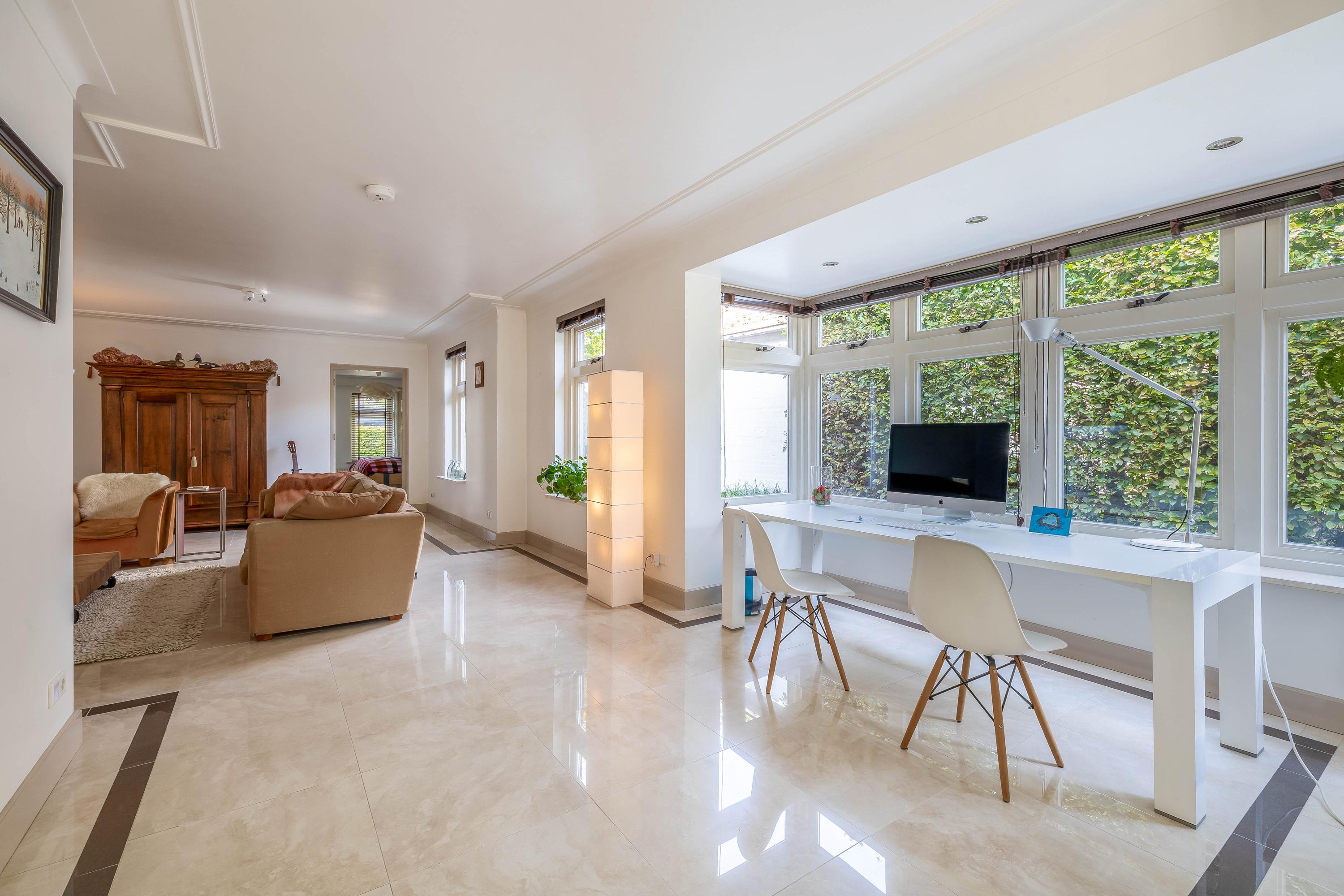 window provides access to the living room. The living room has a marble tiled floor with underfloor heating, stucco walls and a stucco ceiling with decorative mouldings. Thanks to the many windows and a large bay window, the room enjoys plenty of natural light, creating a spacious effect. Adjacent to the living room is a versatile space, ideal for an inspiring workspace or a cosy play area. The space can be closed off with a sliding door with stained glass. The kitchen has a corner layout and is equipped with a 5-burner gas hob, combination microwave/oven, sink, American fridge and dishwasher. Various base and wall cabinets provide storage space. There is enough space to place a dining table. The kitchen has a tiled floor with bis. The walls are partly finished with sleek stucco and partly with wooden panelling. The ceiling has stucco with decorative mouldings. The kitchen is open to the adjoining garden room. Here too, large windows provide a sea of light and a beautiful view of the surrounding garden. A wonderful place to relax! The walls are partly finished with sleek stucco and partly with wooden panelling. The ceiling is also finished with stucco and decorative mouldings. French doors provide access to the garden. There is also access to the utility room from here. The utility room is a practical space, equipped with a sink, a storage cupboard and a fixed cupboard wall with sliding doors. There is also a toilet. A door provides access to the garden. You can also reach the rear of the house from this room.