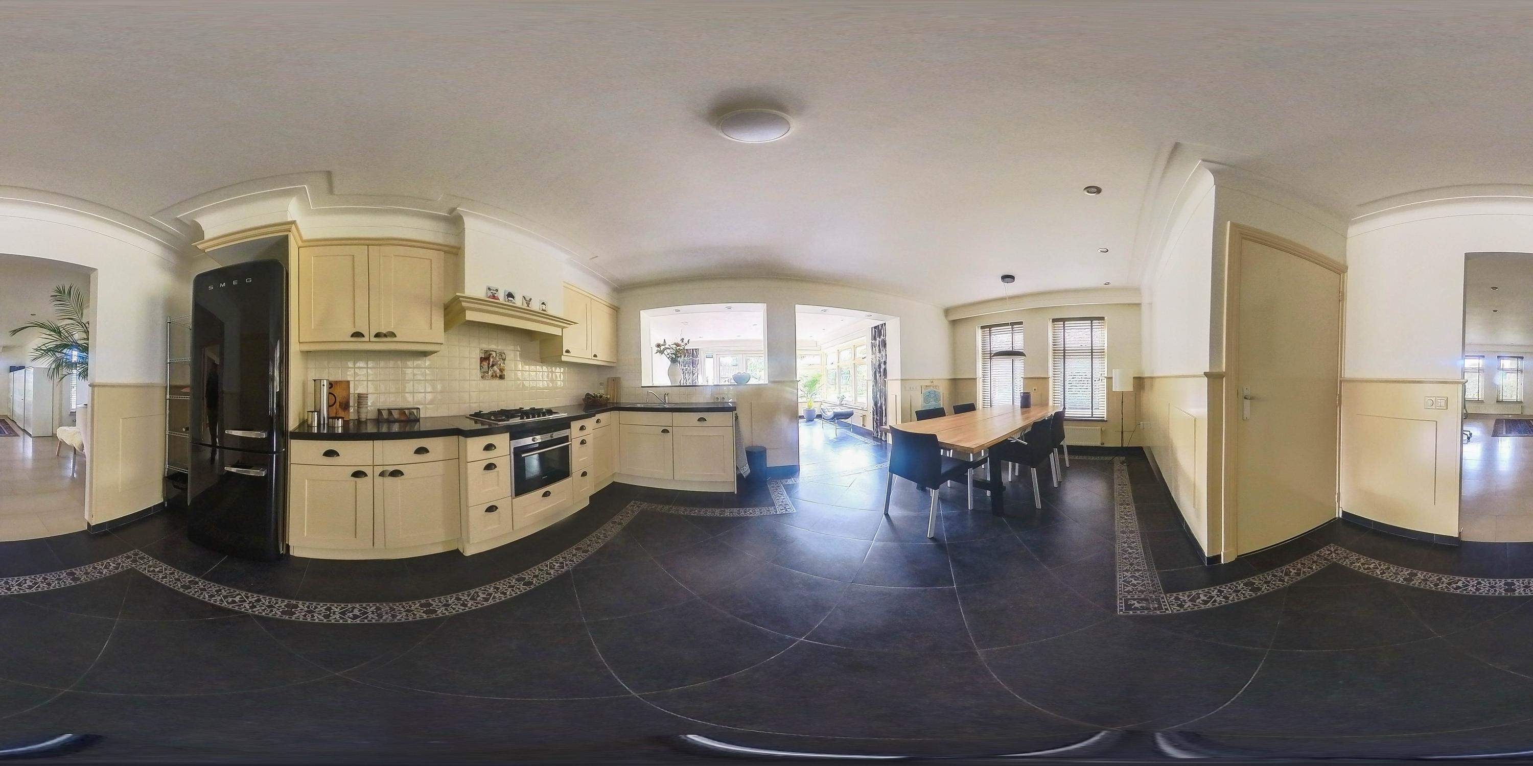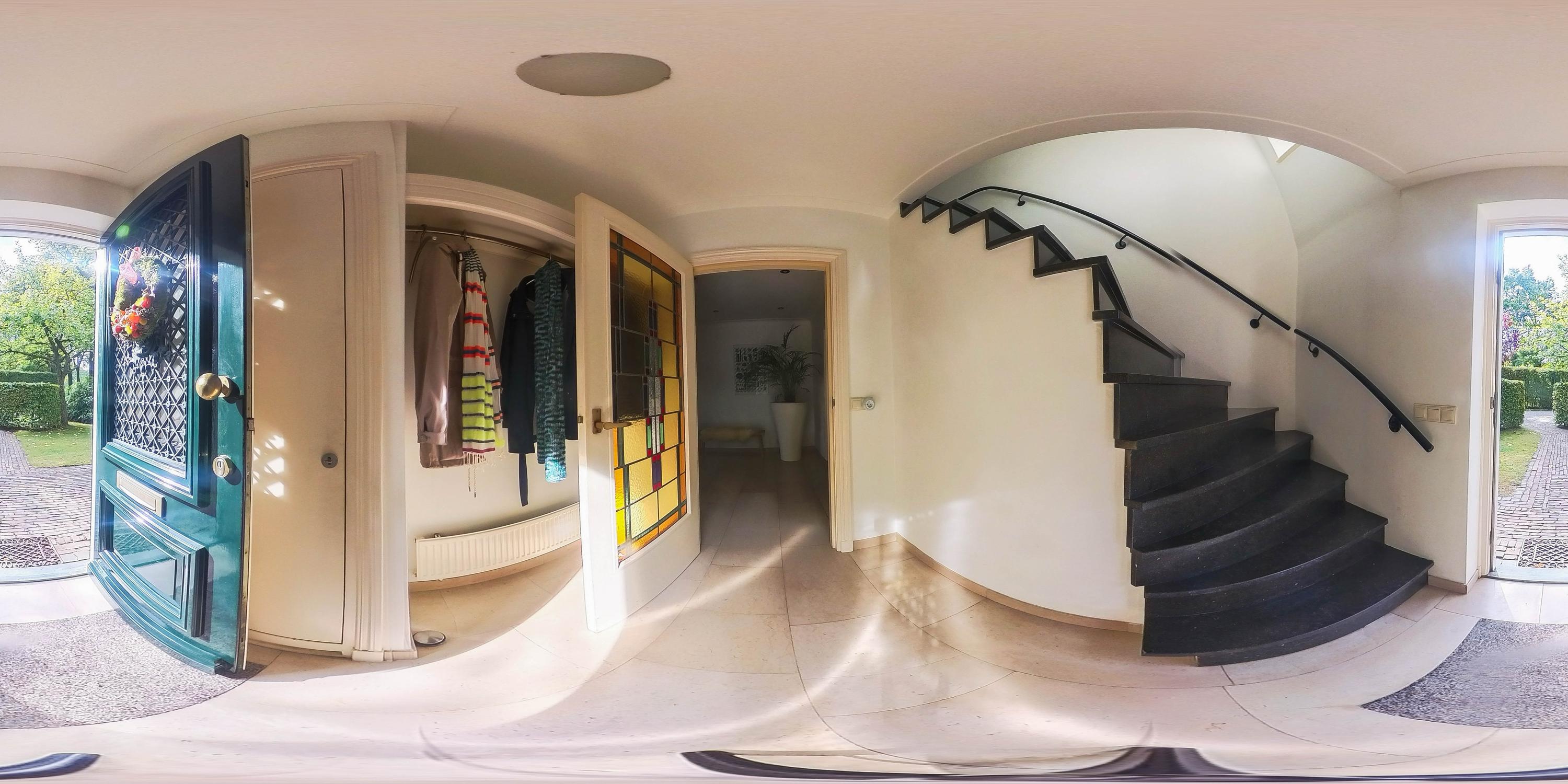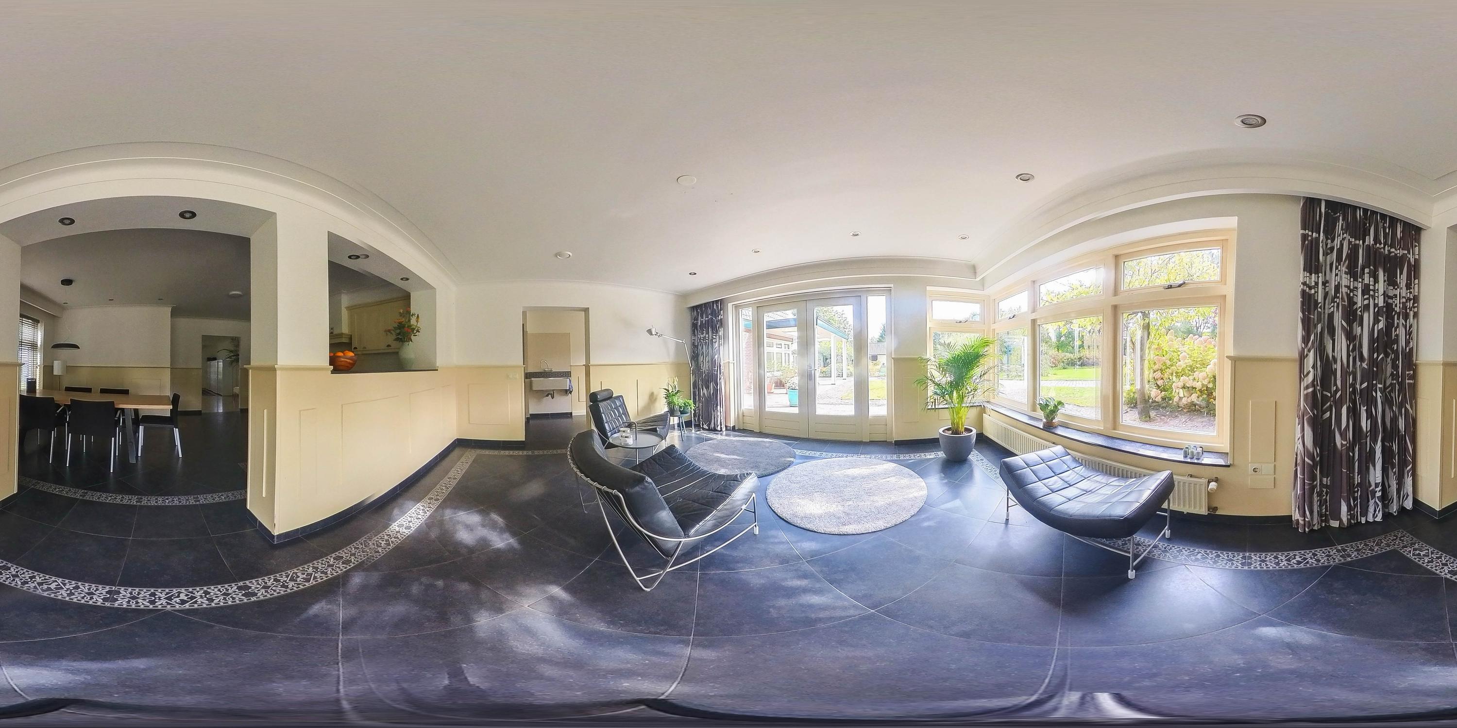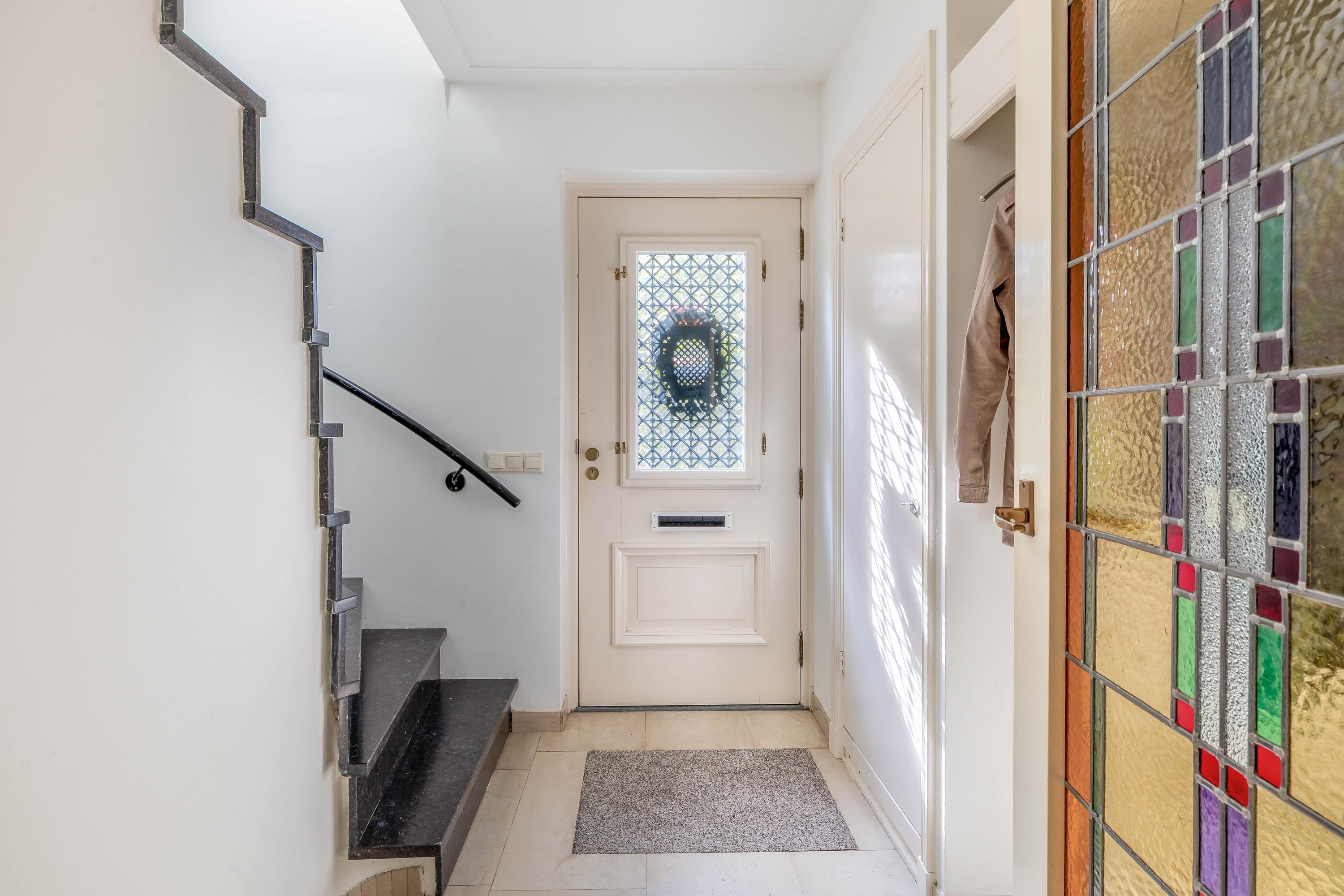window provides access to the living room. The living room has a marble tiled floor with underfloor heating, stucco walls and a stucco ceiling with decorative mouldings. Thanks to the many windows and a large bay window, the room enjoys plenty of natural light, creating a spacious effect. Adjacent to the living room is a versatile space, ideal for an inspiring workspace or a cosy play area. The space can be closed off with a sliding door with stained glass. The kitchen has a corner layout and is equipped with a 5-burner gas hob, combination microwave/oven, sink, American fridge and dishwasher. Various base and wall cabinets provide storage space. There is enough space to place a dining table. The kitchen has a tiled floor with bis. The walls are partly finished with sleek stucco and partly with wooden panelling. The ceiling has stucco with decorative mouldings. The kitchen is open to the adjoining garden room. Here too, large windows provide a sea of light and a beautiful view of the surrounding garden. A wonderful place to relax! The walls are partly finished with sleek stucco and partly with wooden panelling. The ceiling is also finished with stucco and decorative mouldings. French doors provide access to the garden. There is also access to the utility room from here. The utility room is a practical space, equipped with a sink, a storage cupboard and a fixed cupboard wall with sliding doors. There is also a toilet. A door provides access to the garden. You can also reach the rear of the house from this room.