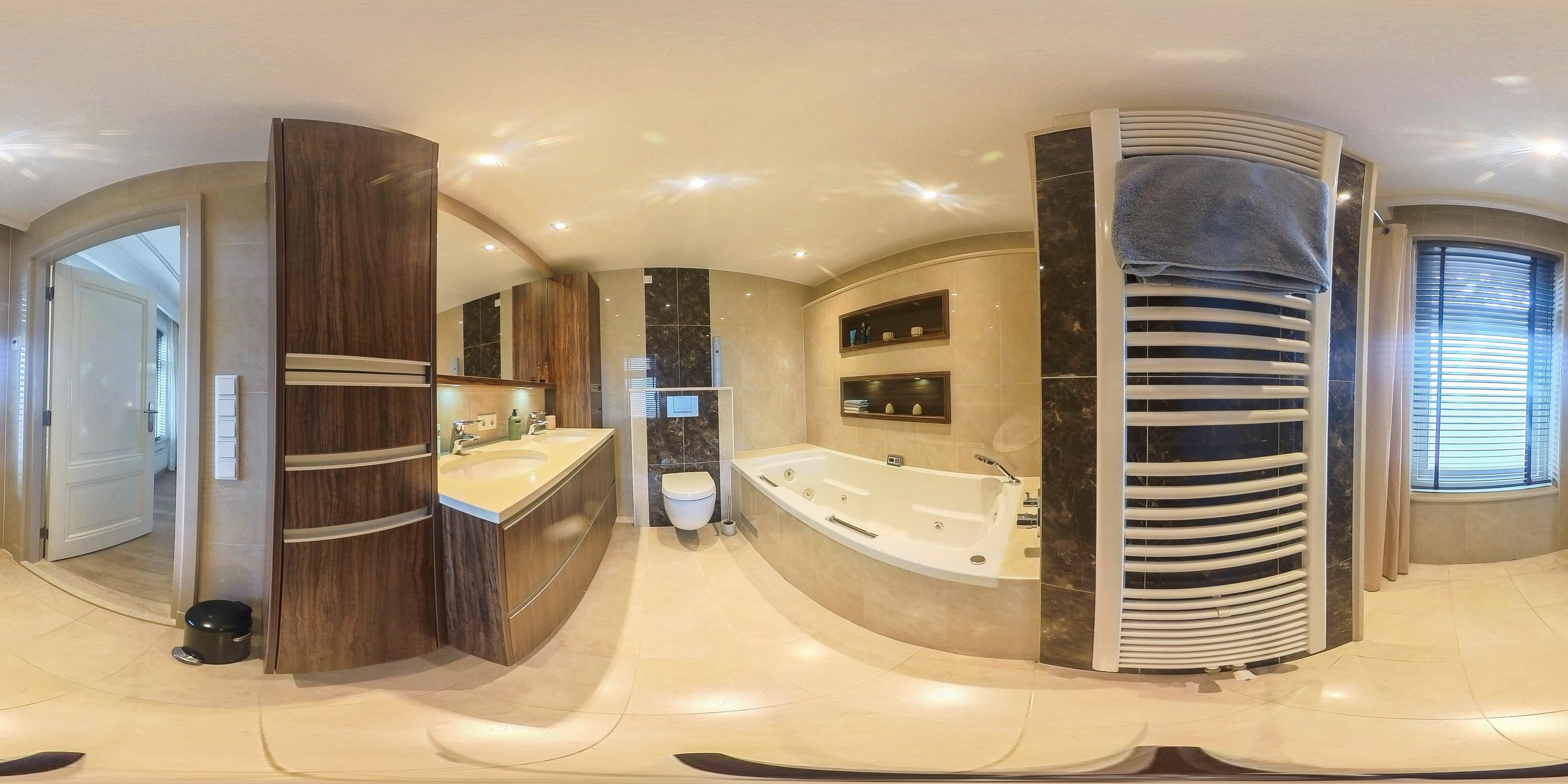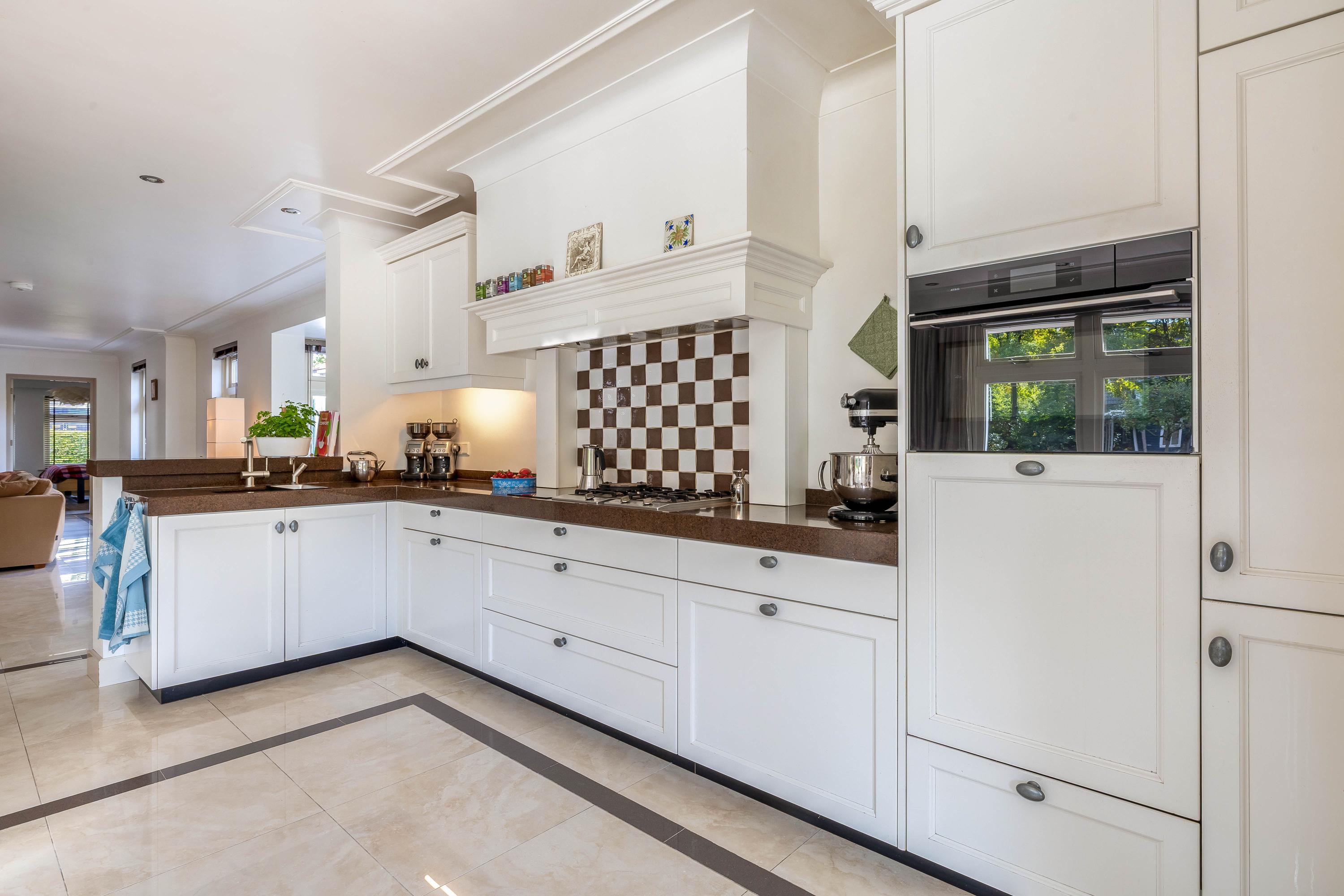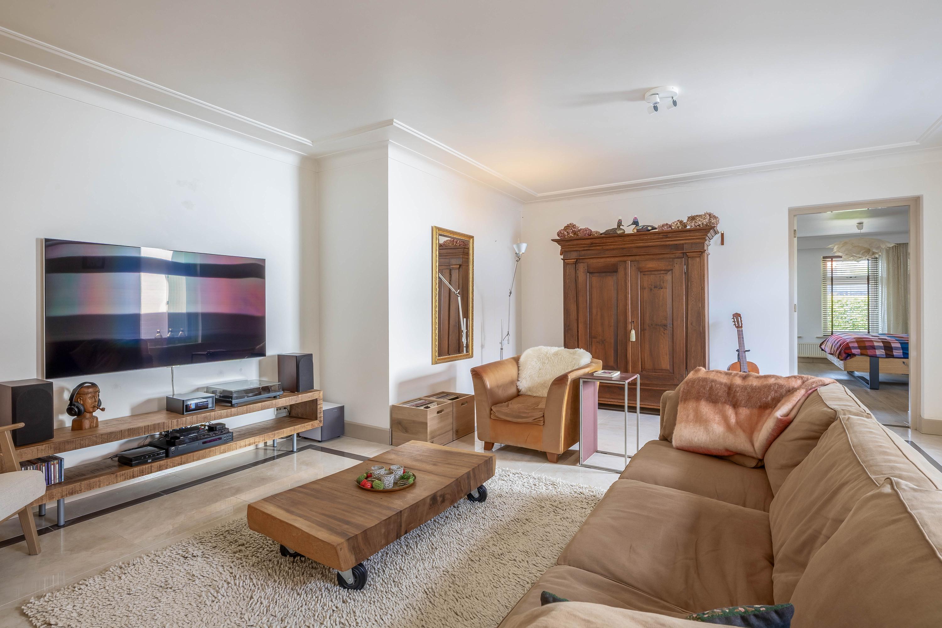 The toilet is fully tiled and equipped with a washbasin and wall-mounted toilet. The attractive living room is accentuated by high-quality ceramic tile flooring with bis and stucco, both on the walls and on the ceiling. The beautiful mouldings give the interior a classic look. The marble fireplace with gas fire provides extra warmth and atmosphere on colder days. A spacious bay window, currently furnished as a workspace, provides extra light in the room. The custom-made kitchen was designed by Hans Kwinten Interiors Projects. This high-quality kitchen is L-shaped and fully equipped with an advanced hob (with a wok burner, two gas burners and two induction burners) and a combi oven that also serves as a steam oven and microwave. In addition, you will find a dishwasher, freezer, refrigerator and a Quooker boiling water tap. French doors and various windows provide a beautiful view of the garden and direct access to the covered terrace and garden. The kitchen provides access to a spacious, man-sized storage cellar. The bedroom with en-suite bathroom and walk-in wardrobe is a delightful space. The floor is finished with laminate. The bathroom is fully tiled and equipped with a Whirlpool bathtub with light therapy, a double sink with a cabinet, a floating toilet and a walk-in shower with a seat. Various niches are an extra nice detail in the room. There is also underfloor heating in the bathroom. The walk-in closet with fixed cupboards and lighting offers optimal clothing storage. From the