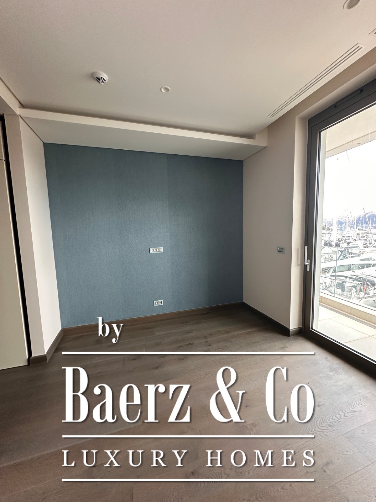 The apartment’s layout includes a hallway, a living room melding seamlessly with the kitchen and dining area, two bedrooms, two bathrooms, a guest toilet and an expansive terrace. From here, views sweep across the sea, marina and surrounding mountains, drawing the ever-changing Montenegrin light into each space. Finished floors, fitted bathrooms and air conditioning evoke both comfort and restraint, while ownership includes access to pools, dedicated beaches and sports facilities within the complex.