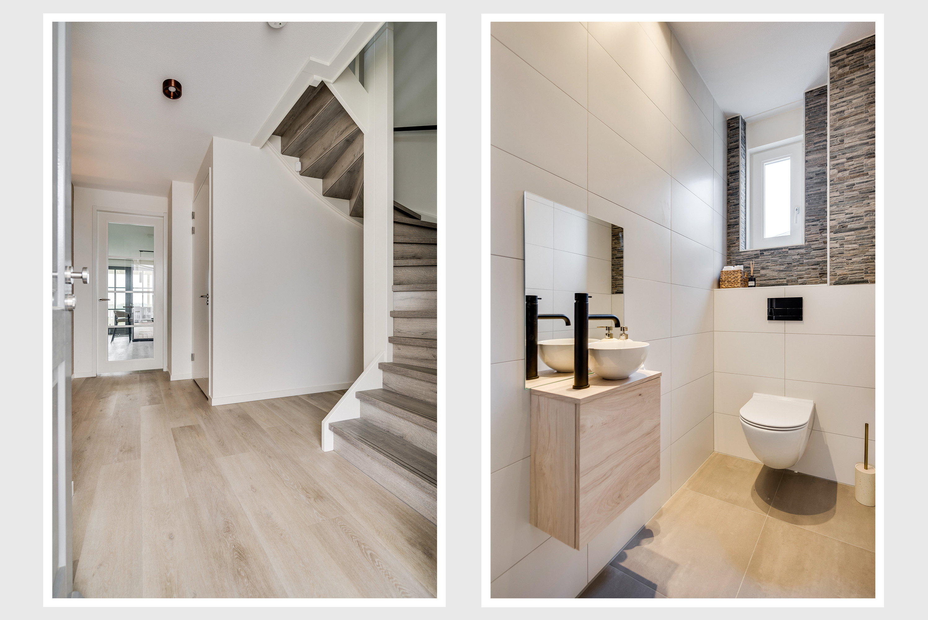 A bar has been created at the end of the island. Here you can enjoy a cup of coffee and the newspaper in the morning or the children can do their homework while you are cooking. All conveniences have been considered, such as a Quooker with hot and cold water, a Bora induction hob, a dishwasher, fridge, freezer and wine climate cabinet from Miele and an oven and microwave from AEG. The utility room is equipped with the white goods connections and has a door to the outside, so you don't have to go through the house with the groceries.