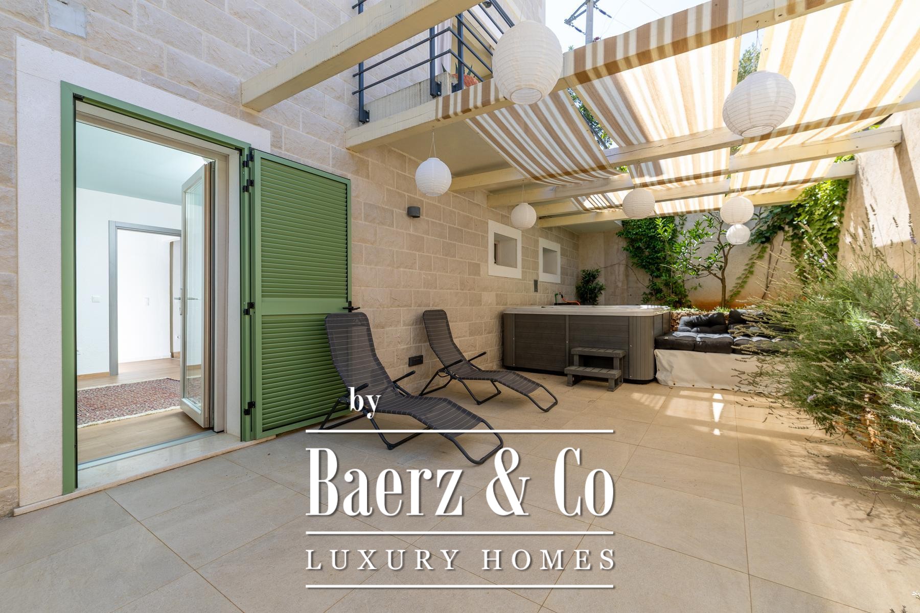 A seamless flow is evident from the entry hall into a contemporary kitchen and an additional summer kitchen, complemented by a spacious terrace of 24 m² and a terrace with a swimming pool, together creating an environment well-suited for private gatherings or quiet contemplation. The first floor arranges three bedrooms, each with an en suite bathroom, a dressing room, and a flexible studio space, all extending to generous terraces.