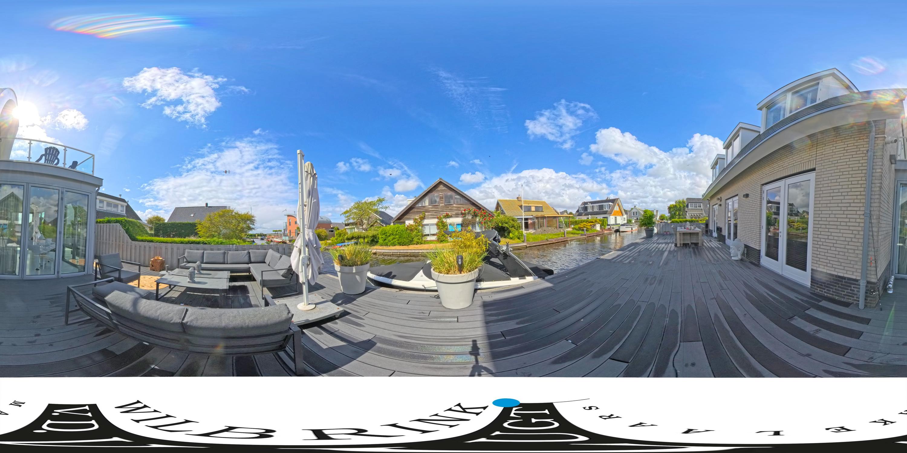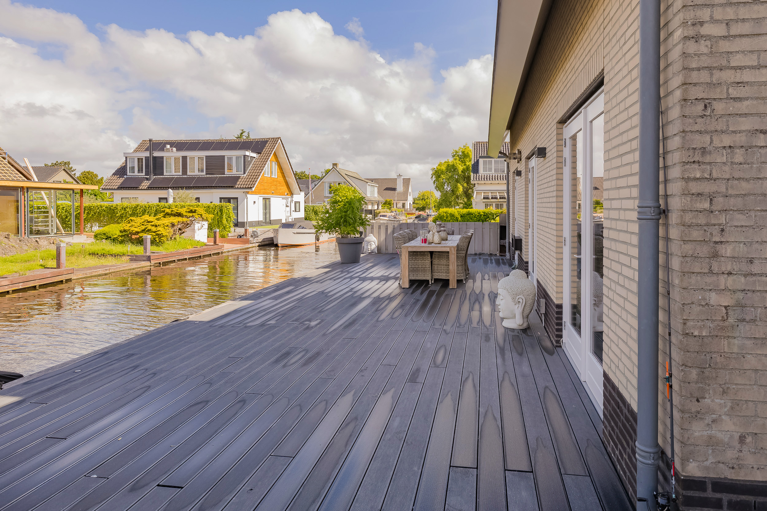 The plastic deck terrace at the rear has several seating areas and a jetty for direct access to the water of the Kagerplassen. Here you can enjoy the view, the evening sun and sail to the open water in no time.
