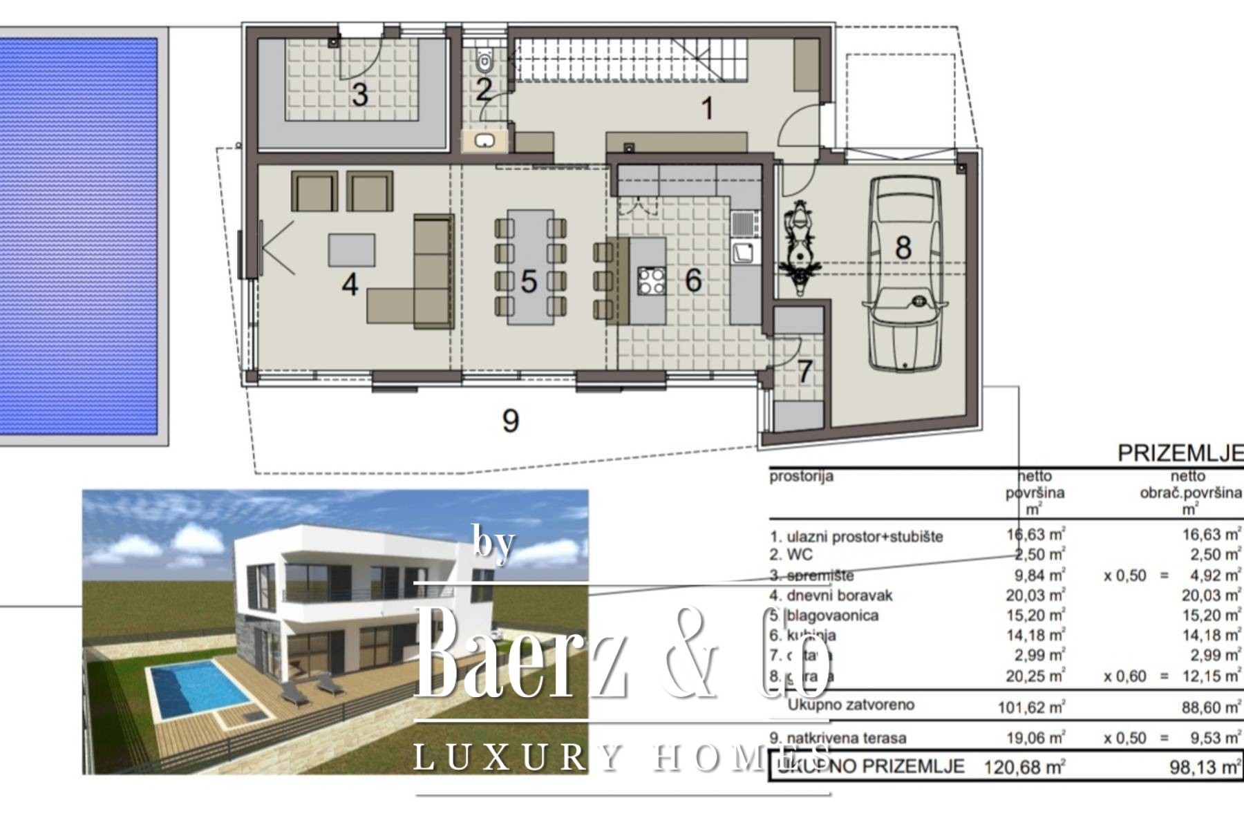 Townhouse Kaštela offers a measured blend of contemporary comfort and Adriatic proximity, with 245 m² of internal space set just 150 meters from the sea. This four-bedroom, four-bathroom residence is under construction on a 513 m² plot, allowing for custom finishes in both interior and exterior design. The townhouse Kaštela combines privacy and openness; the ground floor features a generous living area, kitchen, dining space, utility room, and guest toilet, while upstairs two en suite bedrooms with walk-in wardrobes, and two single rooms sharing a bathroom, all enjoy terrace access.