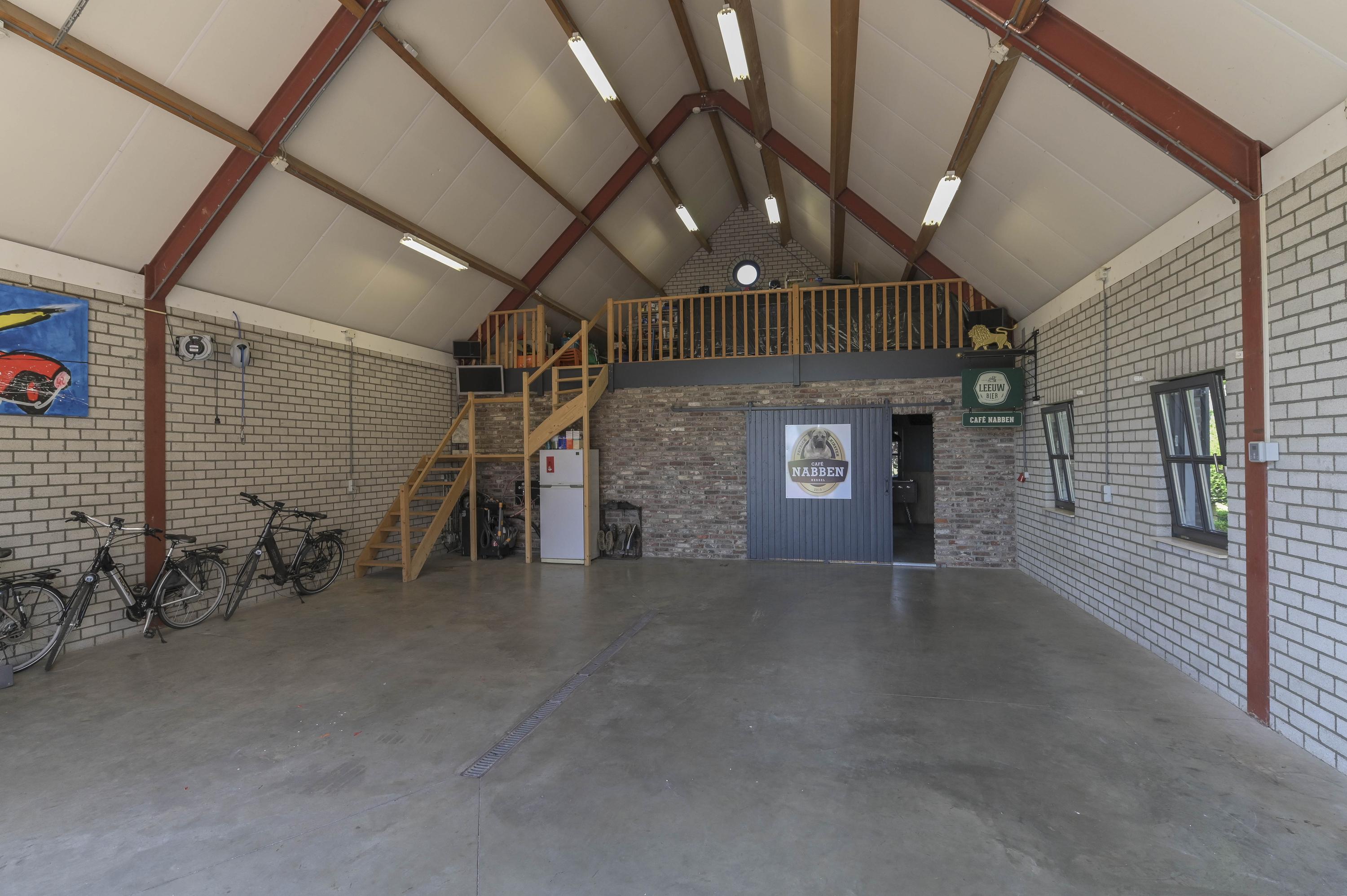 The exceptionally spacious garage provides room for multiple cars and is fully insulated. It features a separate boiler, electric sectional door, pedestrian door, toilet, and mezzanine with window. The high ceiling offers multiple possibilities. At the rear, part of the garage has been converted into a private bar with wooden flooring and air conditioning. French doors open directly to the garden.