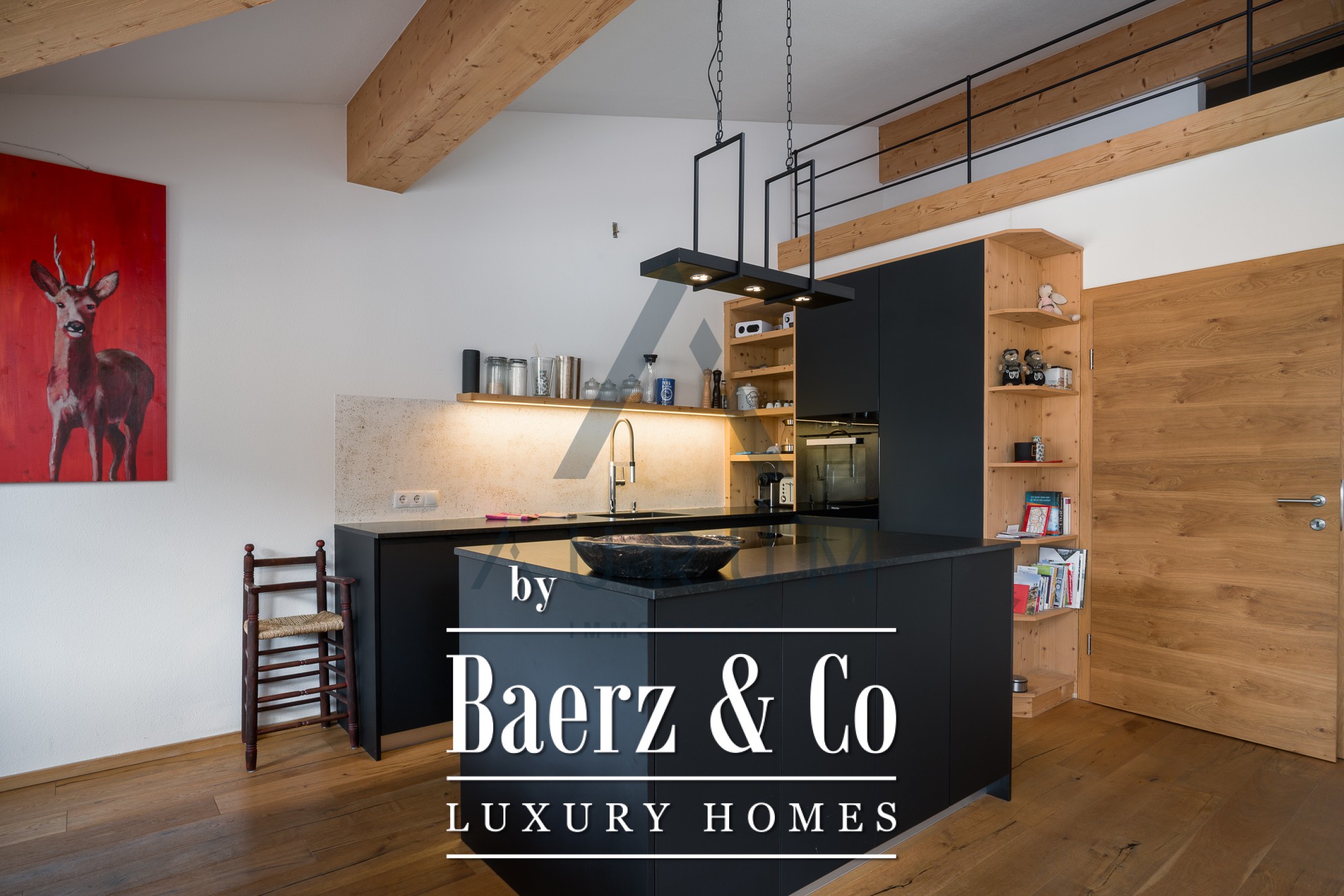 This penthouse apartment Kirchberg in Tirol is set in an exceptionally tranquil location within a contemporary building completed in 2016. The living experience begins in a spacious entrance that unfolds into a refined living and dining area, where a fireplace and exposed roof trusses set an inviting tone. Natural light moves across oak floorboards, while oversized porcelain stoneware tiles and Venetian blinds punctuate the refined space. The professional kitchen, thoughtfully separated yet sight-connected, features name-brand appliances and grants direct access to a private balcony poised above the landscape.