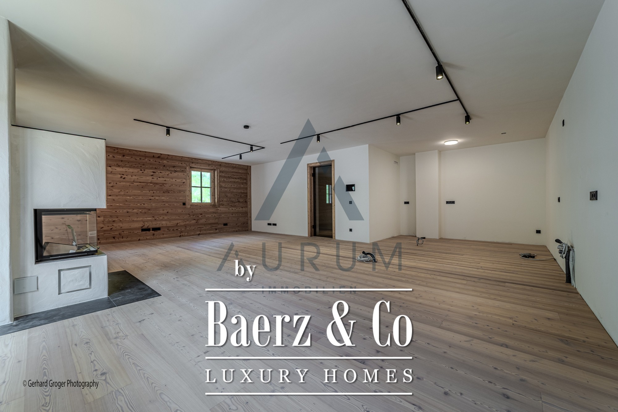 This quiet enclave at the foot of Gaisberg mountain places you moments from the heart of Kirchberg, with 155 m² of living space, two bedrooms, and two bathrooms. The upper level features an open living and dining area anchored by an open fireplace and exposed roof trusses, fostering a sense of both warmth and openness. Larch wood floors and ceramic tiles ground each space, while high-quality kitchens and underfloor heating ensure comfort season-round.