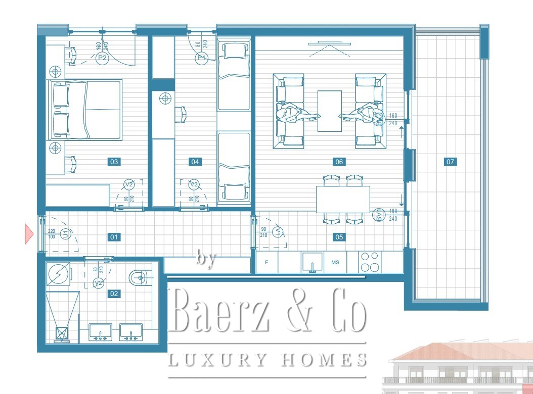 Structure of the apartment: hallway, living room with kitchen and dining table, 2 bedrooms, a bathroom and a terrace. The apartment will be delivered with finished floors, finished tiles, finished bathroom and equipped air conditioning.