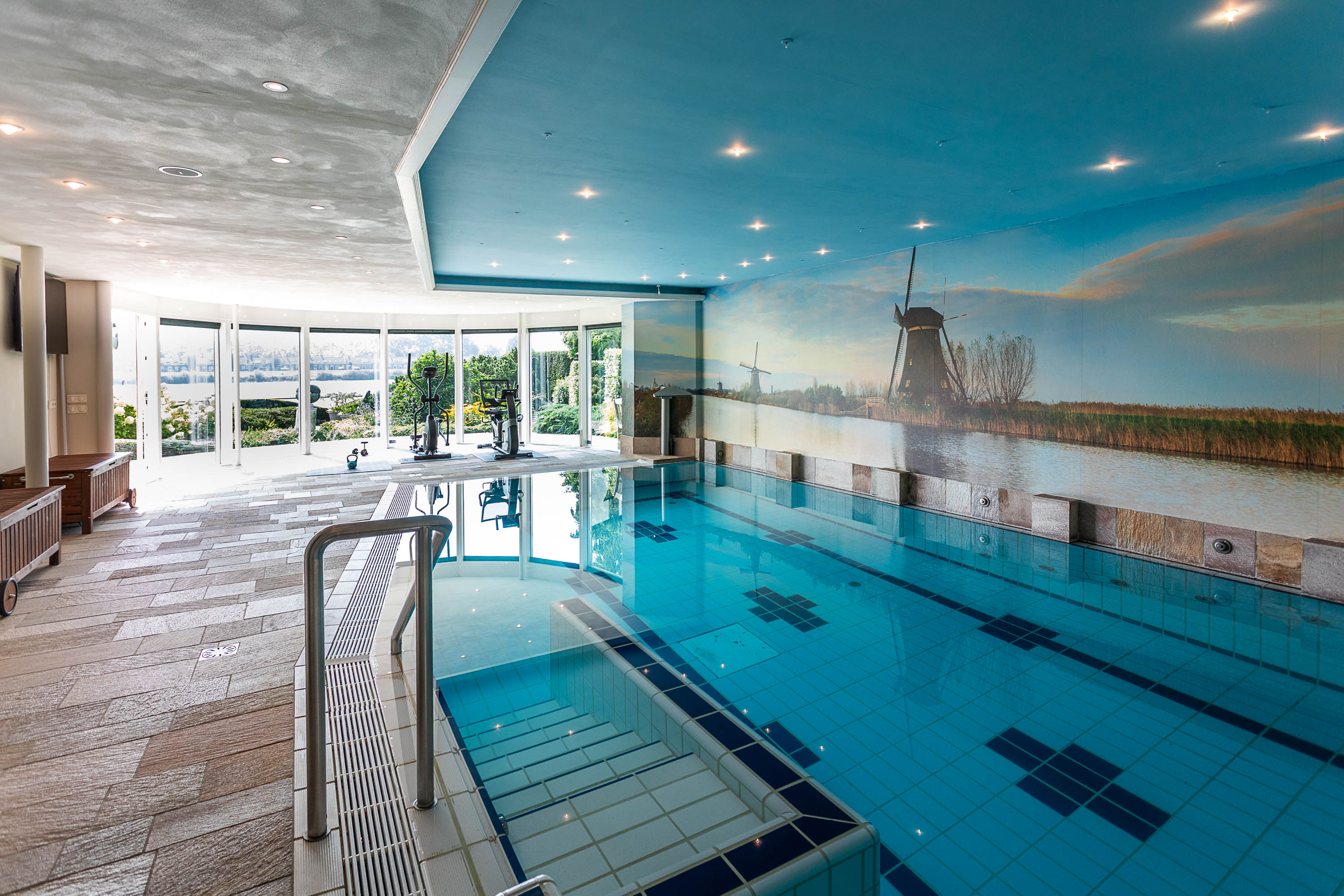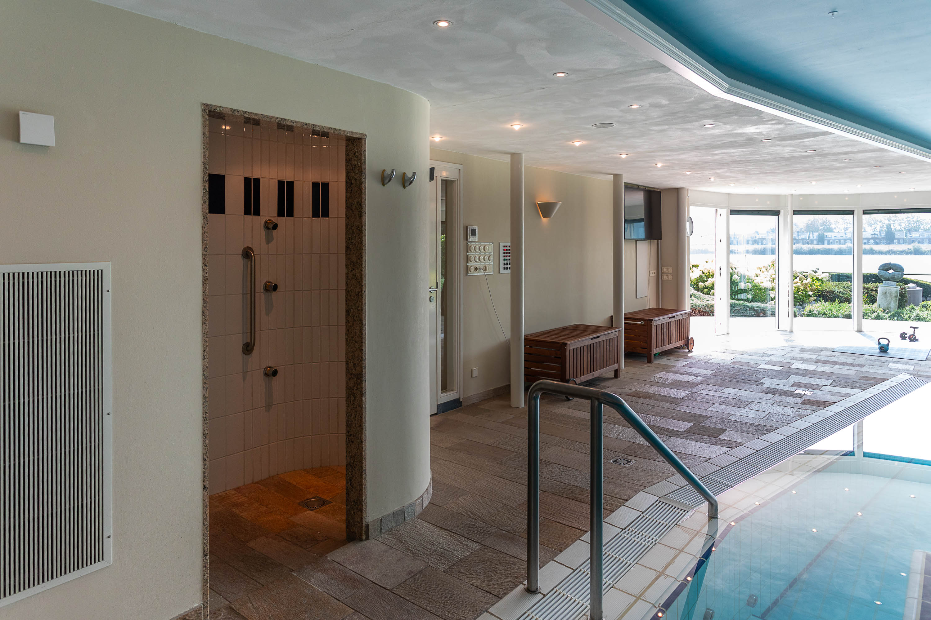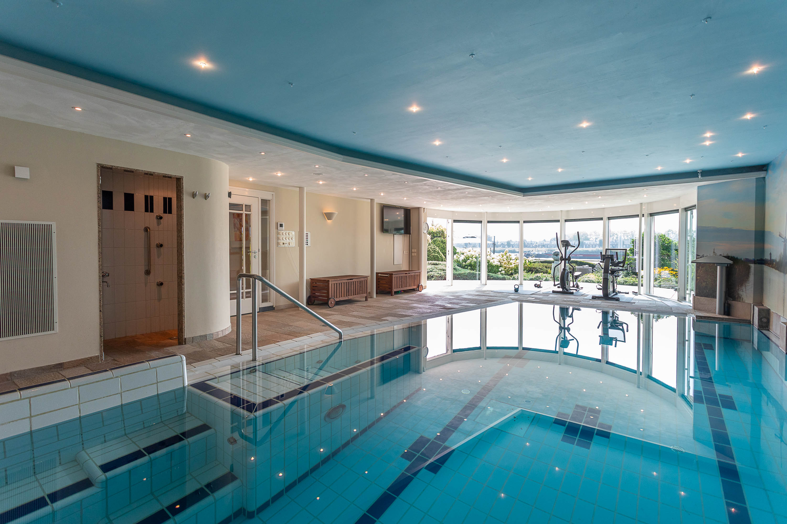 The basement features a complete wellness area, transforming this villa into your own private resort. Unwind in the swimming pool with jet stream, relax under the waterfall, enjoy the bubble plate and wall jets, or rest on the whirlpool bench. An oasis of relaxation — right at home.