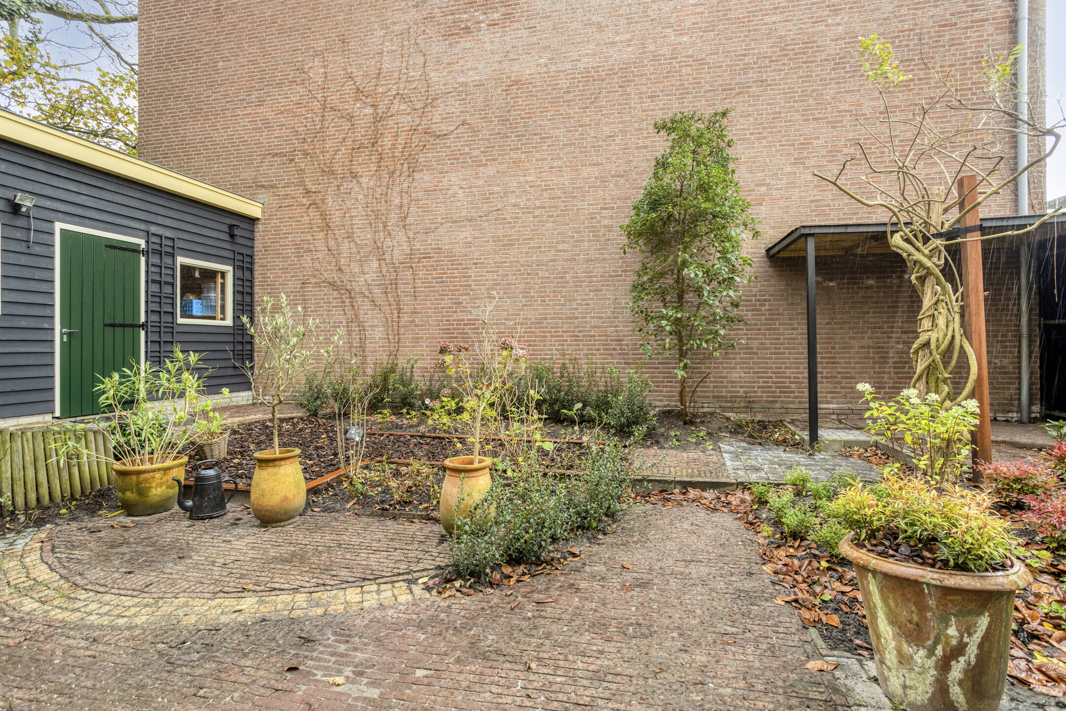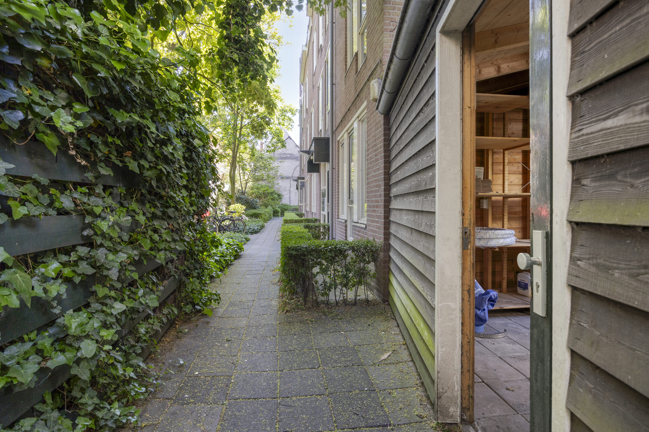 Achtertuin met veel privacy, schuur, fietsenberging en achterom aan twee zijden.