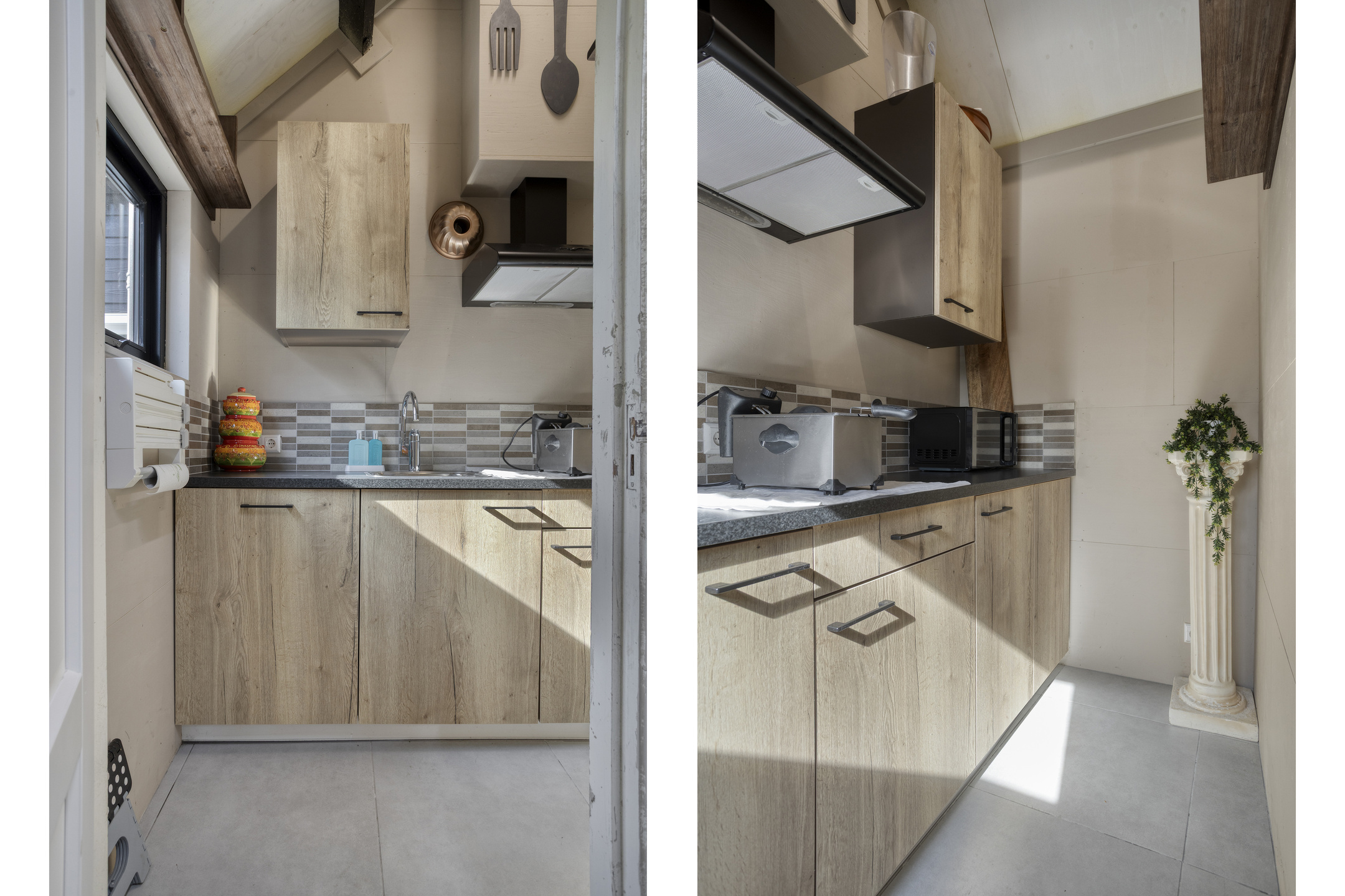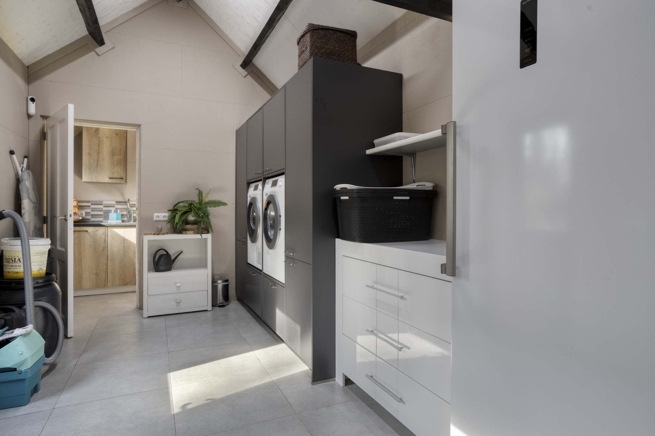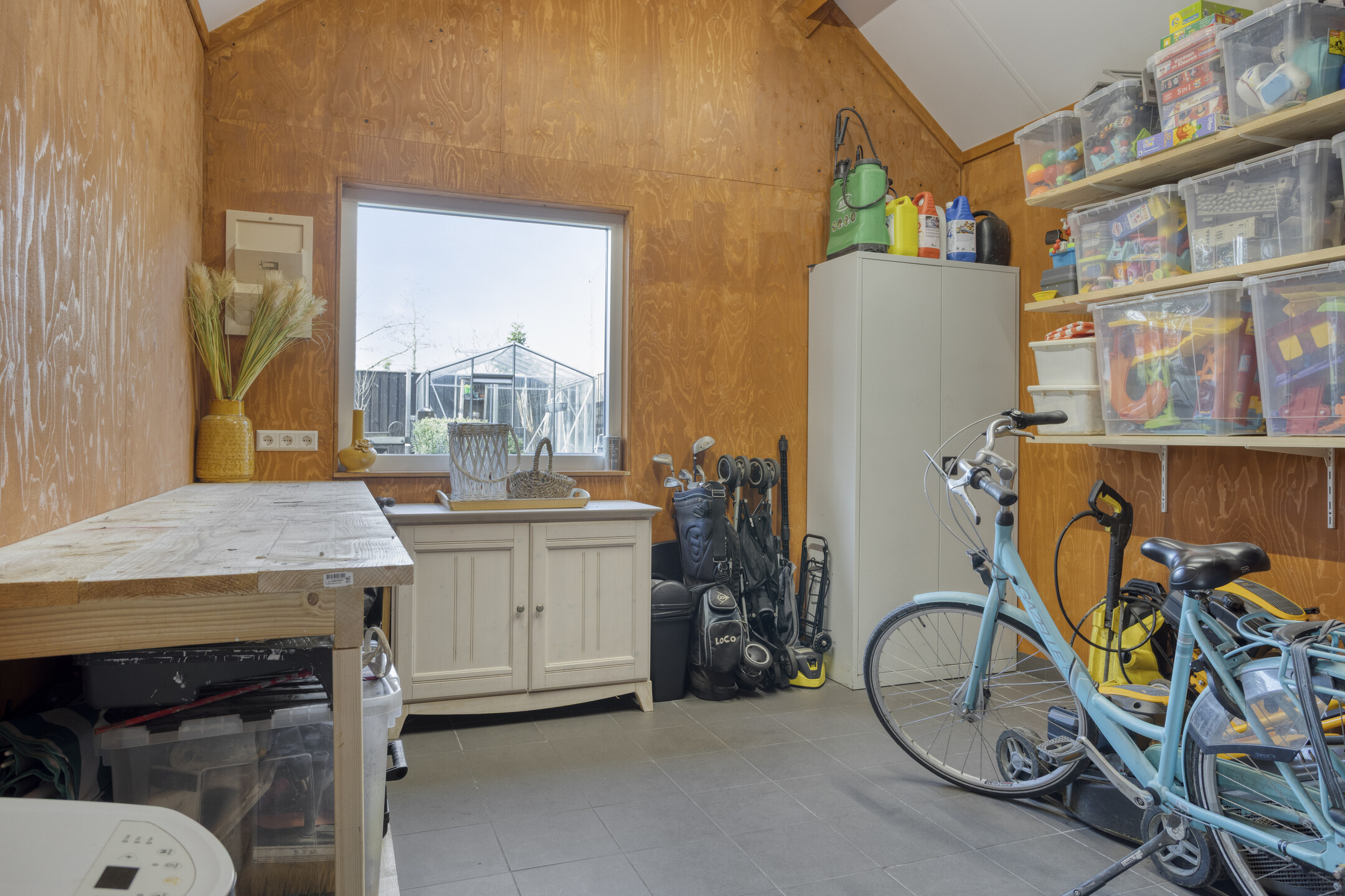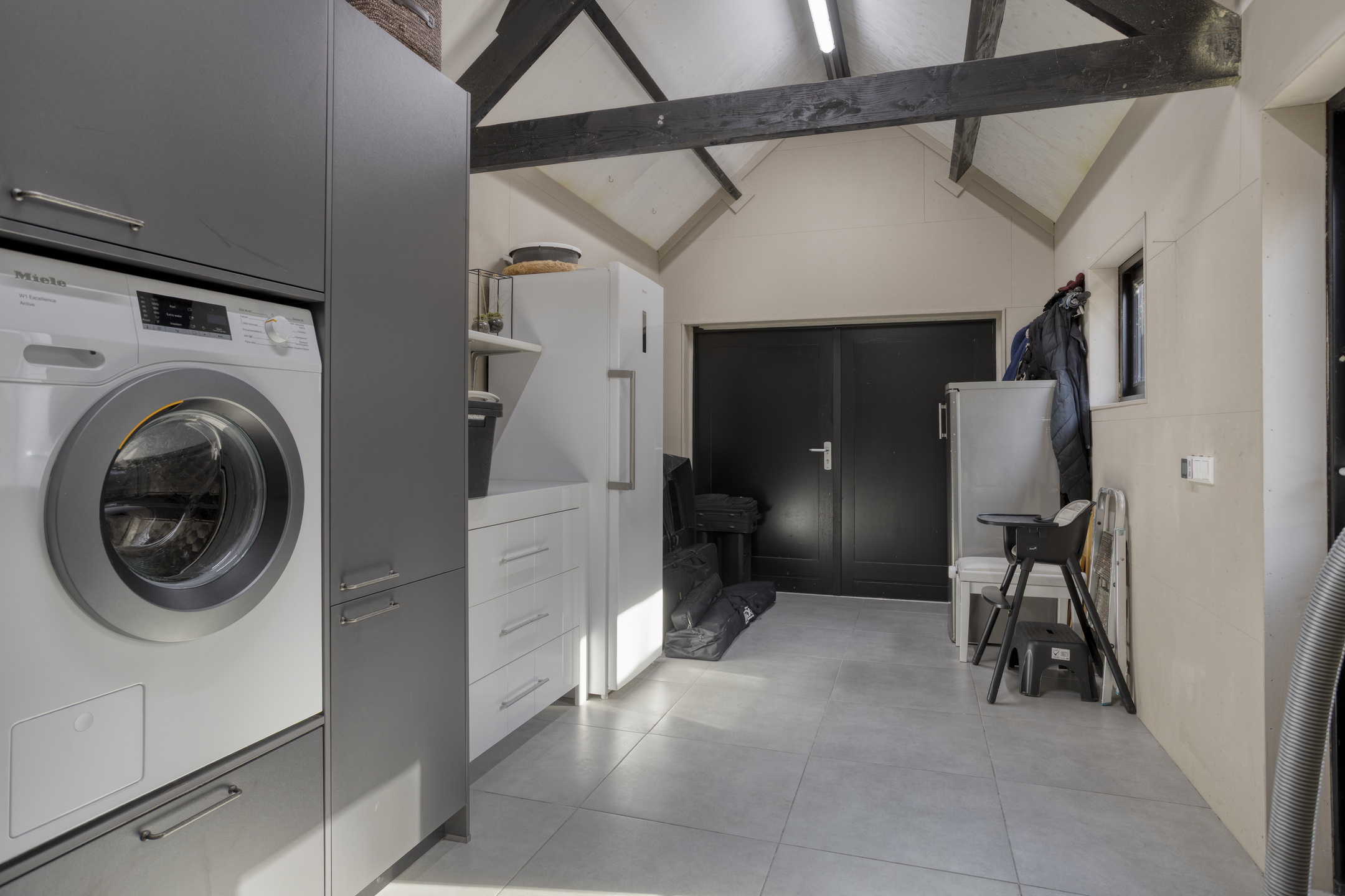 The former garage has been practically converted into a utility room with all necessary connections for household appliances. Thanks to its double doors, it can also serve perfectly as a bicycle storage area, adding to the overall convenience.