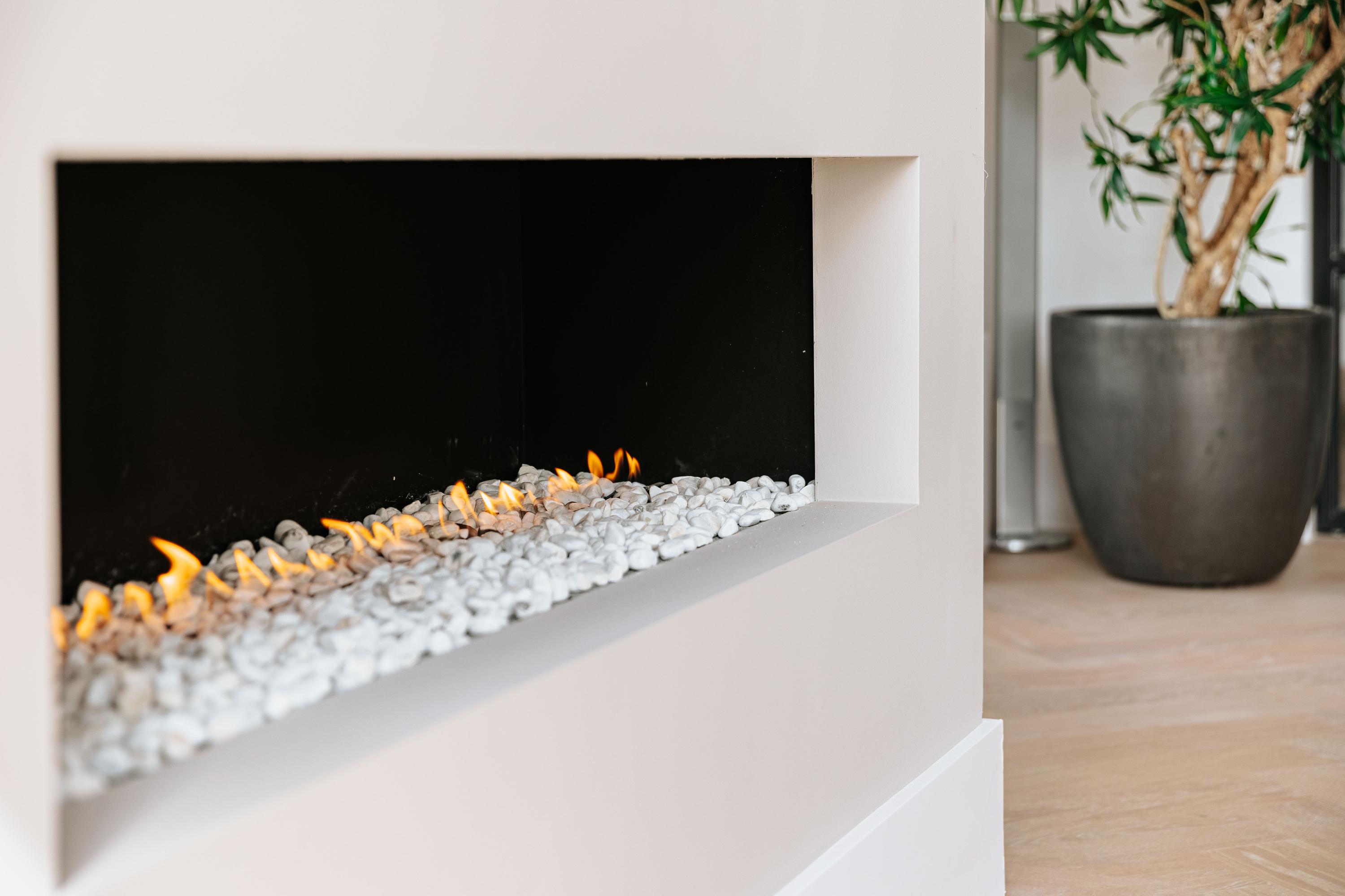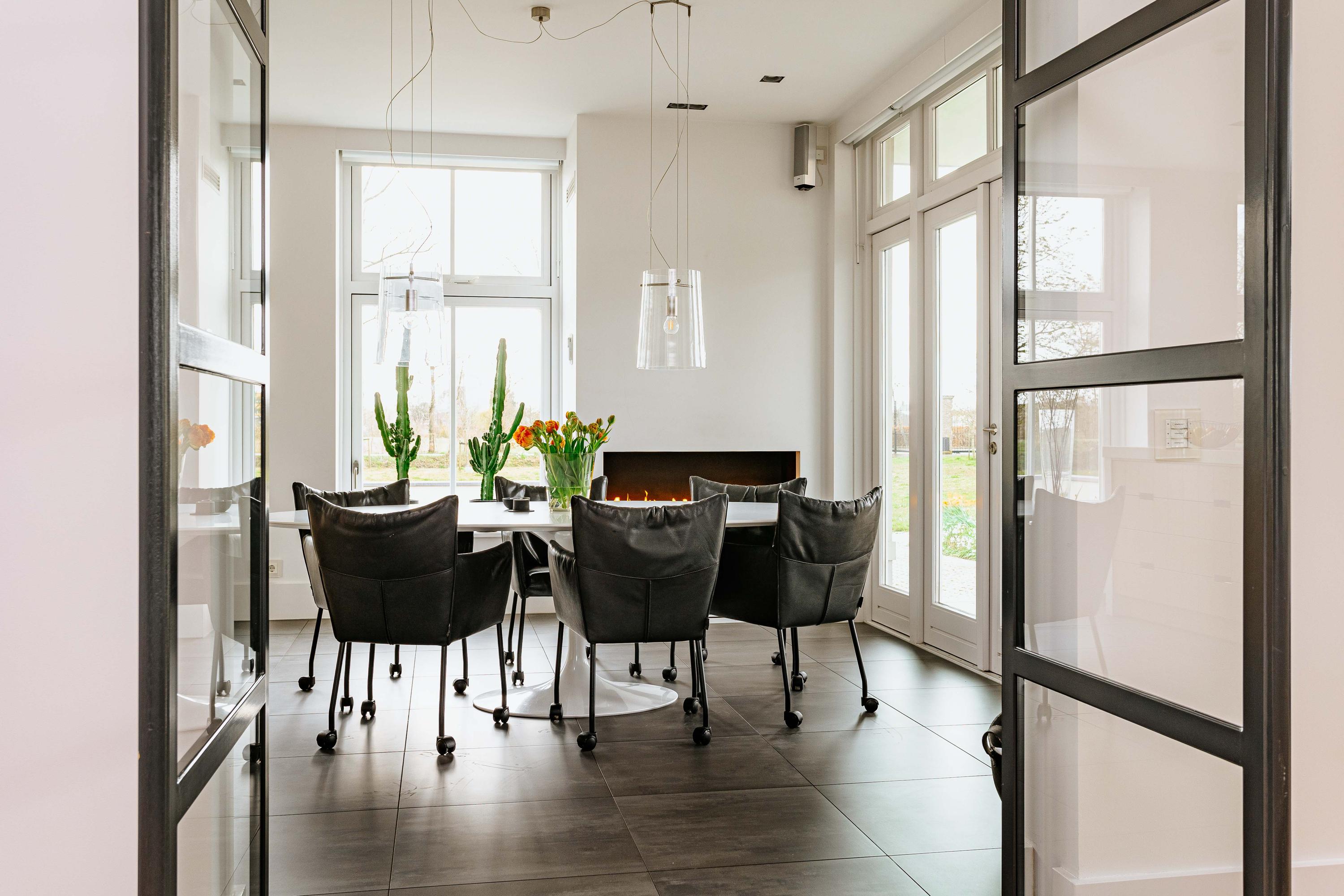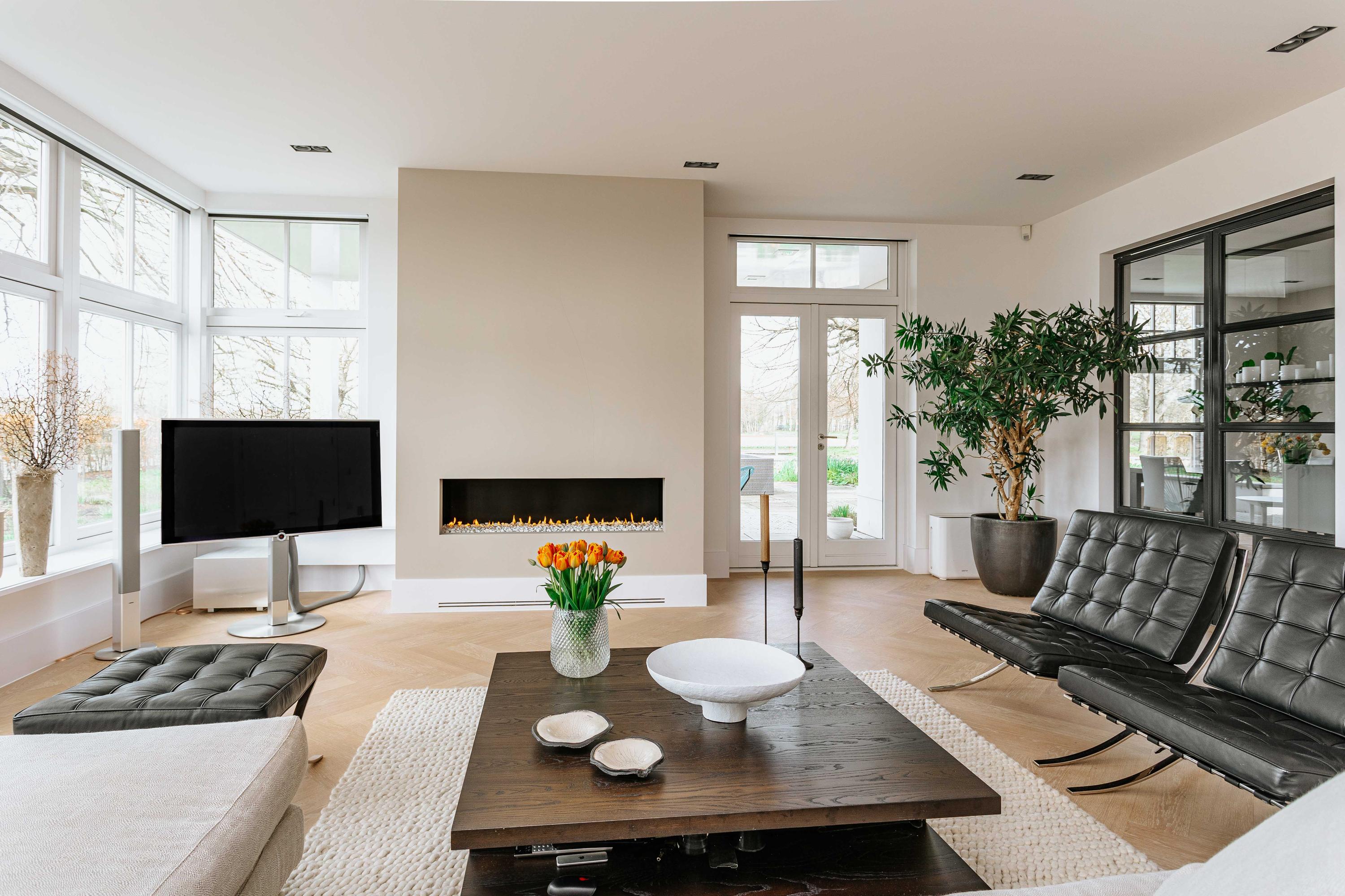 At the front of the house is the large luxury kitchen, equipped with a sink island and luxury built-in appliances, a gas fireplace, and French doors to the terrace. The large, cozy living room also has a gas fireplace, French doors to the terrace, and access to the kitchen and the spacious, cozy dining room through steel revolving doors. Hidden behind a door in the hall is the luxurious trio of bedroom, dressing room, and bathroom. This spacious master bedroom with gas fireplace overlooks and has access to the garden. There is also a separate toilet.