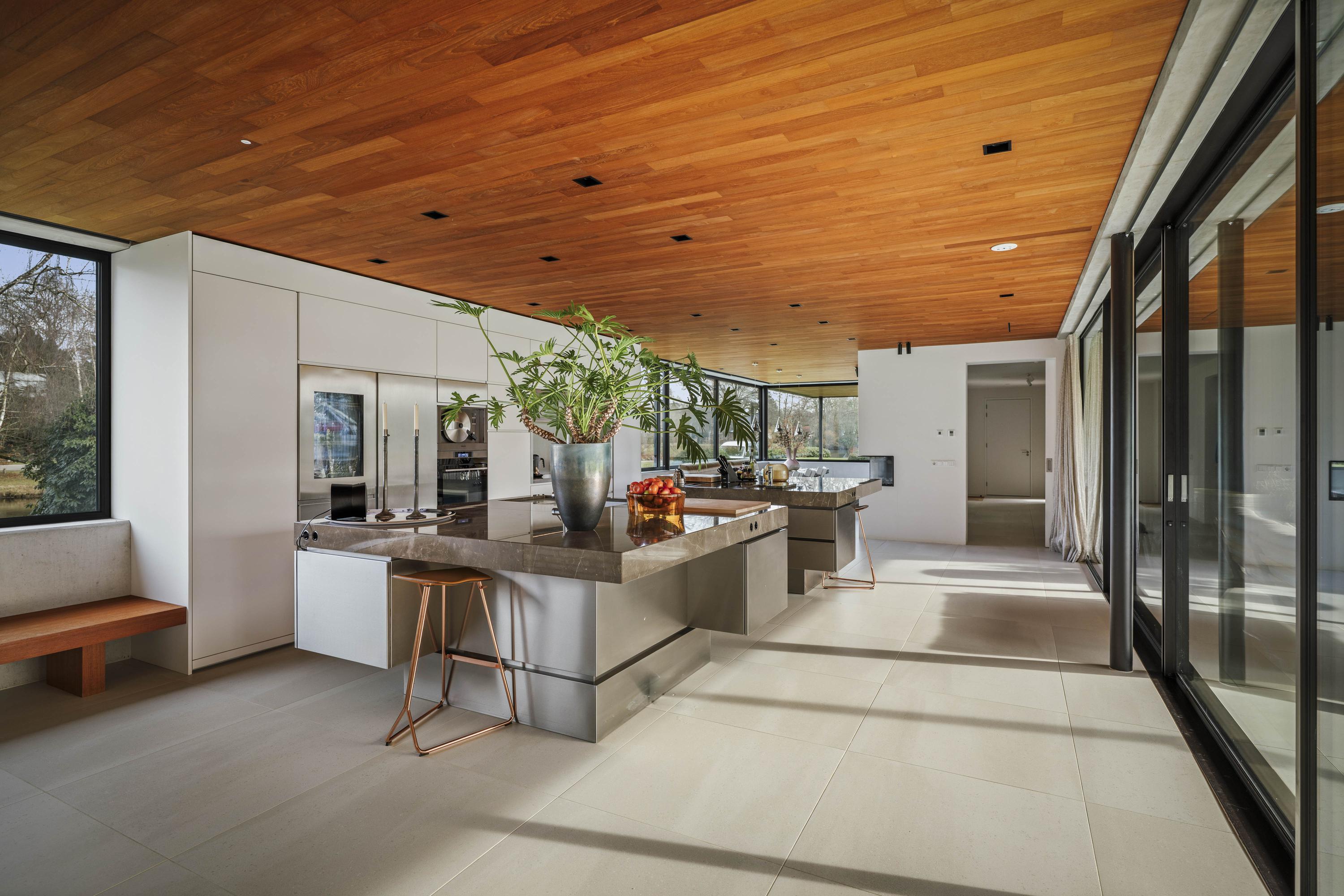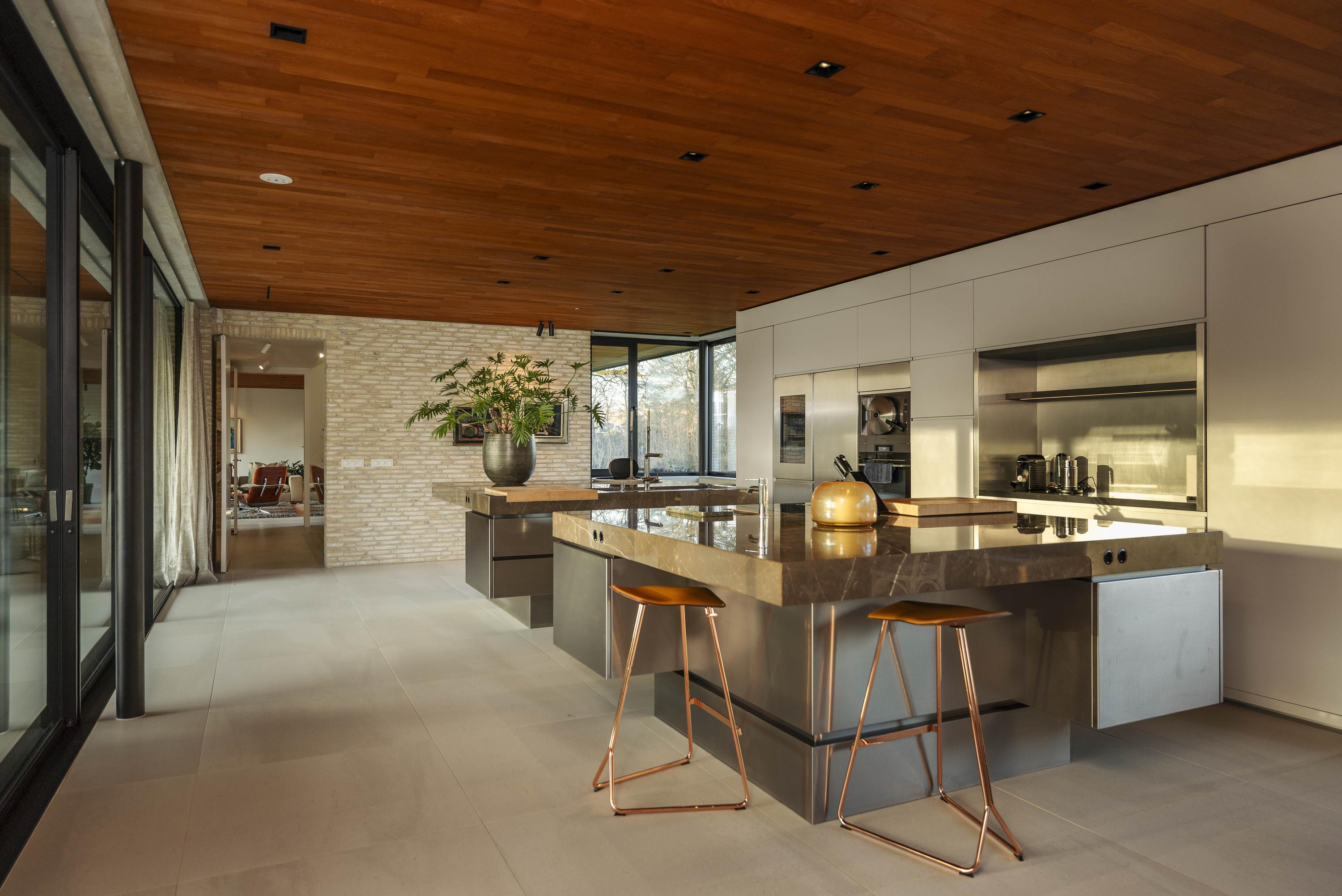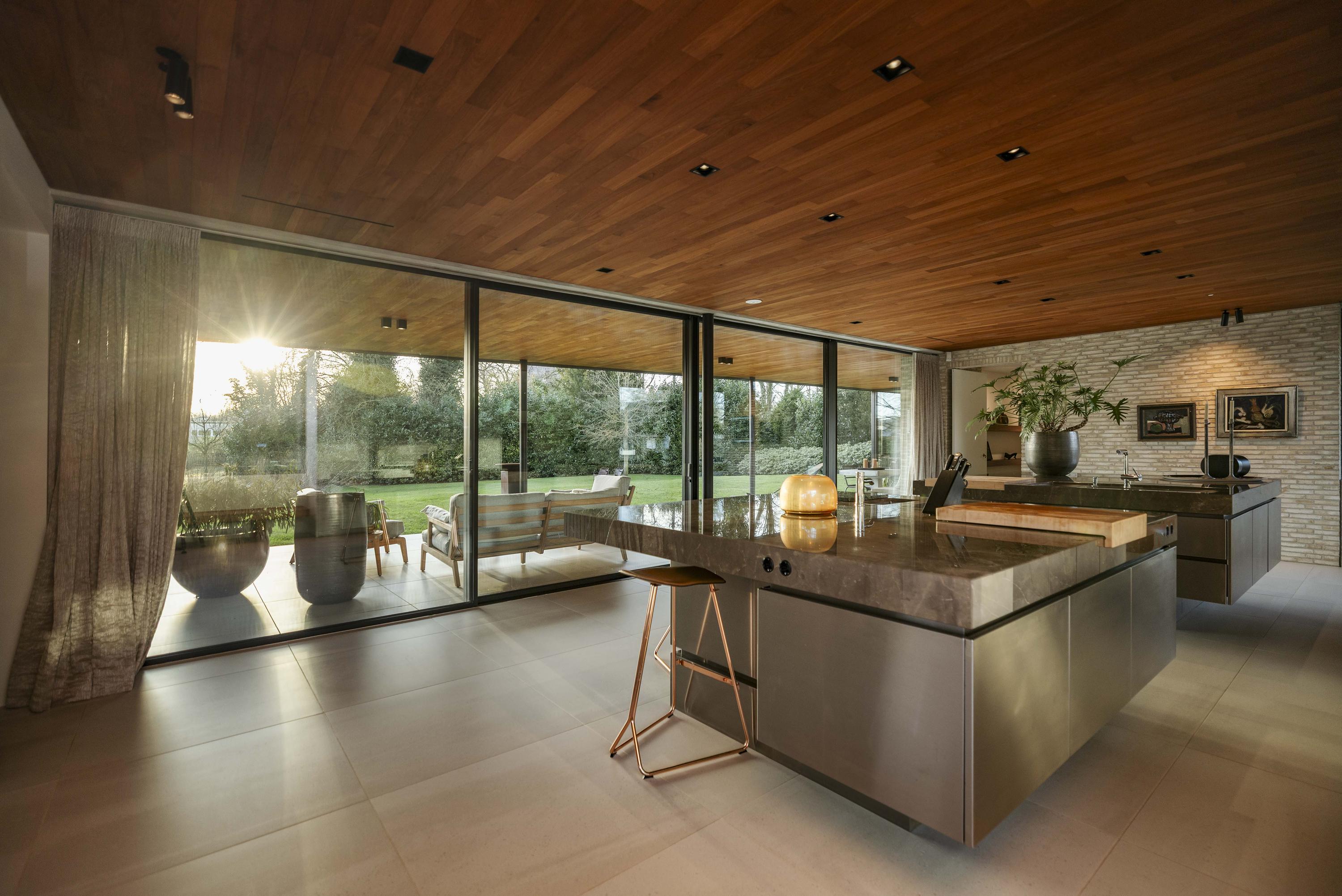 Inside, travertine-coloured Mosa floor tiles and oiled teak ceilings create a warm atmosphere. Floors and ceilings extend to the outside, creating a sense of unity between the kitchen and terrace. The kitchen, designed by Roel de Vos Design Studio, features two spacious islands with marble tops (olive brown) and stainless steel bases. The appliance wall is finished in matt white with stainless steel and includes a refrigerator, freezer, two-zone wine climate cabinet, a convection oven and a steam oven. The induction hob with integrated extractor is incorporated into the cooking island. Custom-made teak benches match the look of the ceiling and reinforce the harmonious character of the space. Underfloor heating on all three floors ensures a pleasant indoor climate - warming in winter and cooling in summer.