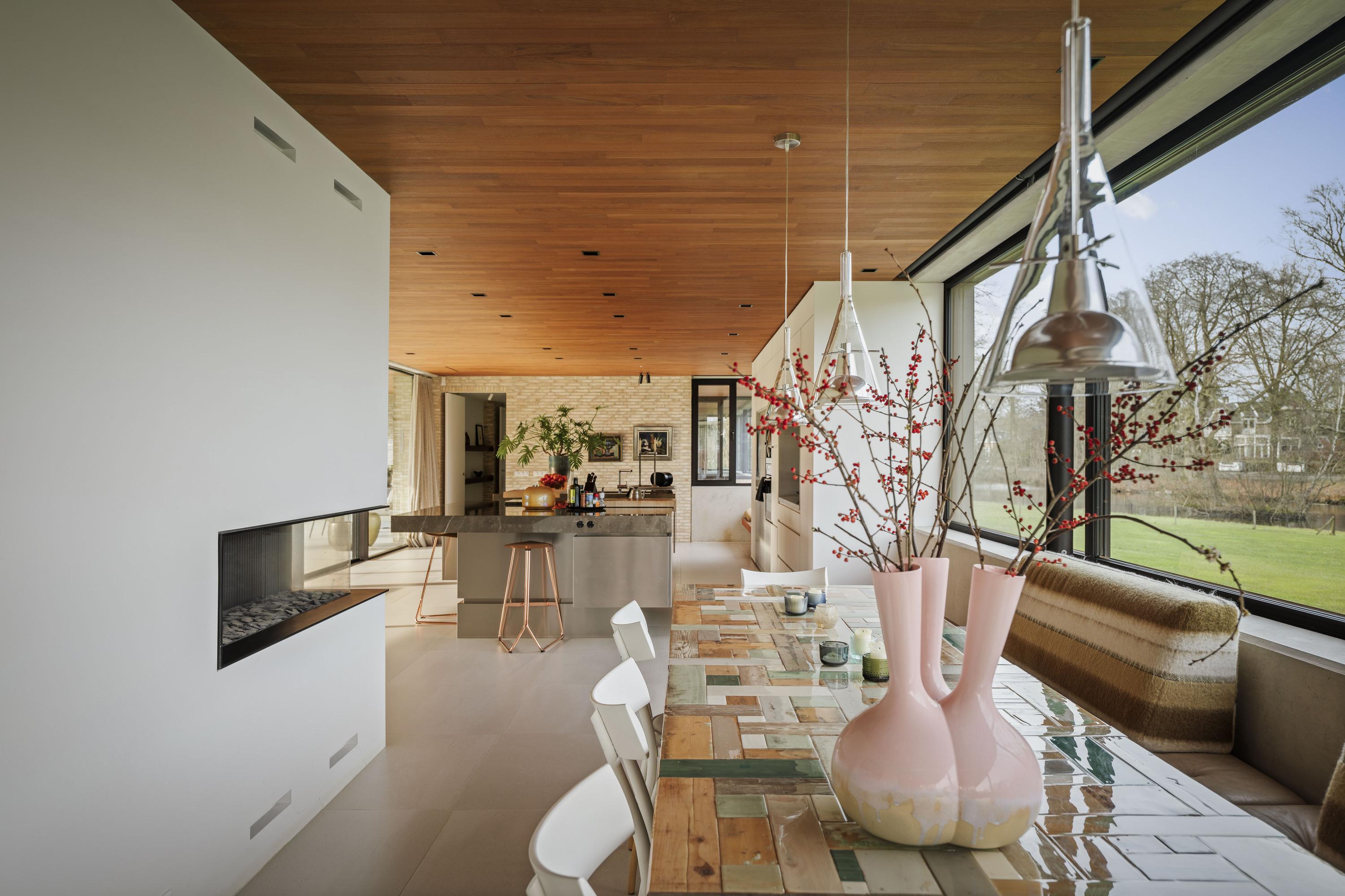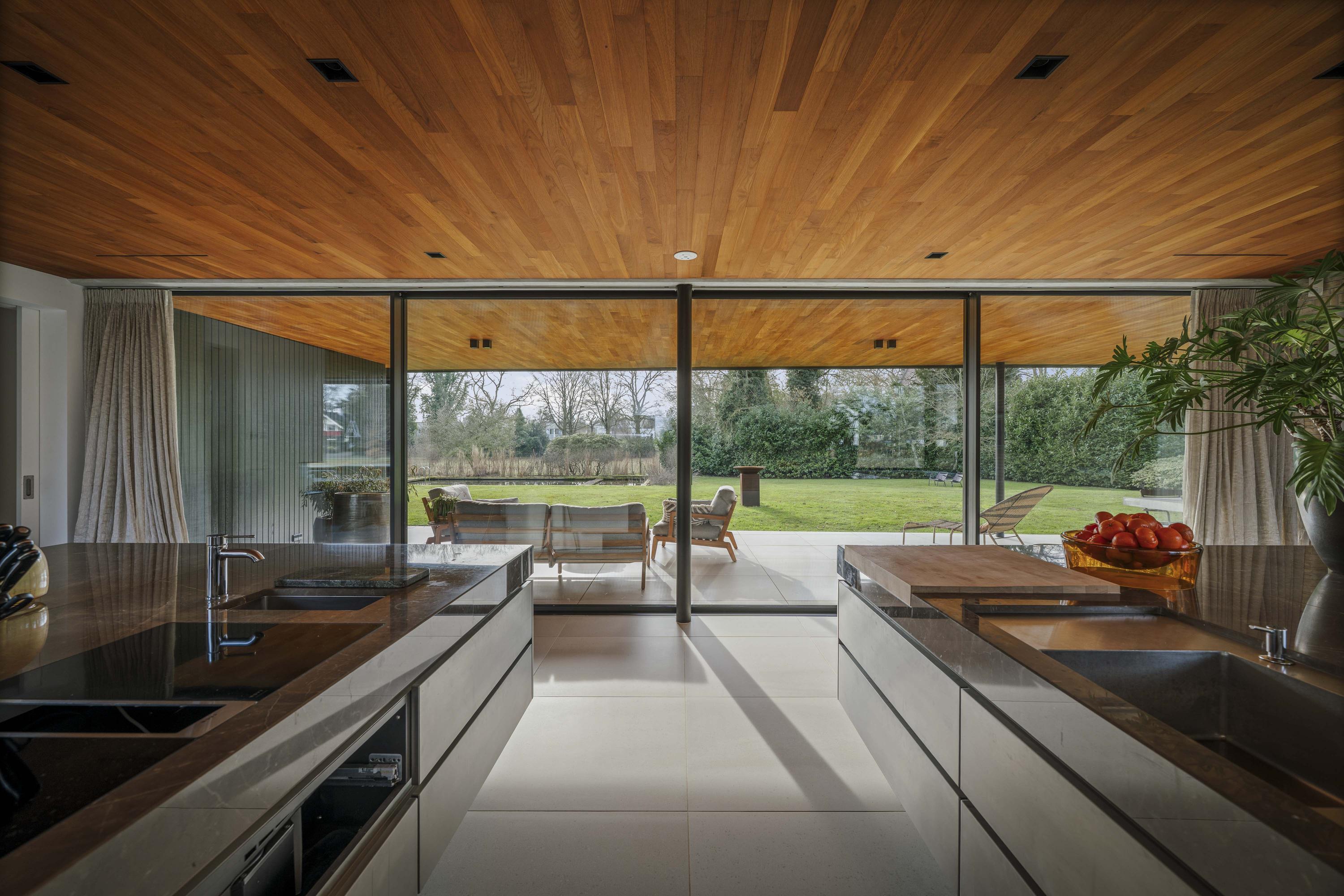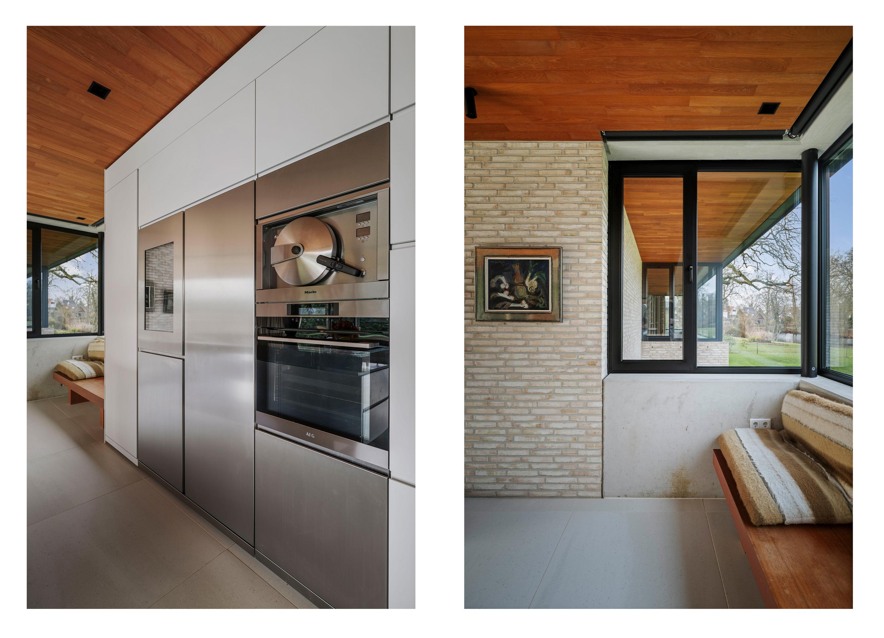 Inside, travertine-coloured Mosa floor tiles and oiled teak ceilings create a warm atmosphere. Floors and ceilings extend to the outside, creating a sense of unity between the kitchen and terrace. The kitchen, designed by Roel de Vos Design Studio, features two spacious islands with marble tops (olive brown) and stainless steel bases. The appliance wall is finished in matt white with stainless steel and includes a refrigerator, freezer, two-zone wine climate cabinet, a convection oven and a steam oven. The induction hob with integrated extractor is incorporated into the cooking island. Custom-made teak benches match the look of the ceiling and reinforce the harmonious character of the space. Underfloor heating on all three floors ensures a pleasant indoor climate - warming in winter and cooling in summer.
