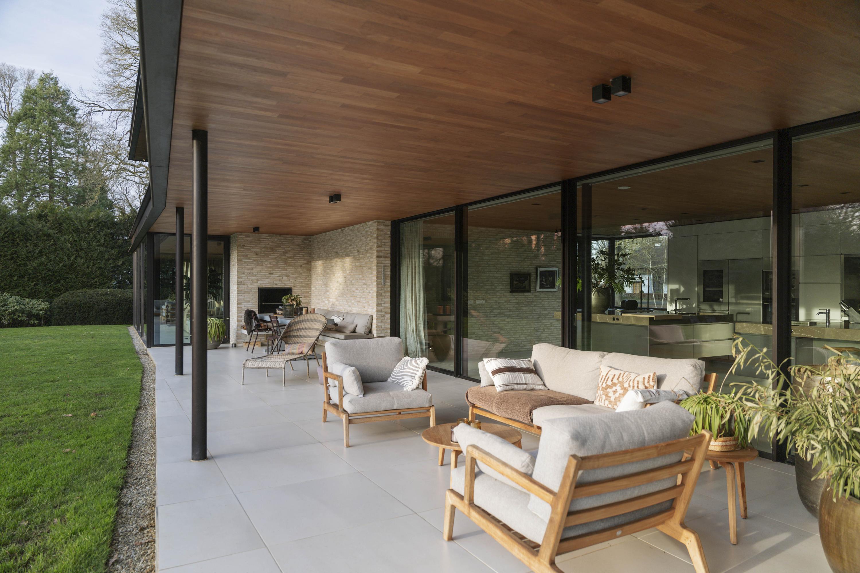 The kitchen (88 m²) forms the heart of the house. From this room, the view is impressive at both the front and rear. Floor-to-ceiling windows and sliding doors connect the kitchen directly to the covered terrace, which is furnished with a sitting and dining area and an outdoor fireplace by Metalfire. The terrace is the family's favourite spot; in winter it is a sunny place due to the low light incidence and in summer it is a pleasant lounge area in the shade and shelter. Thanks to the canopy and the outdoor fireplace, this is a place where you can comfortably spend most of the year.